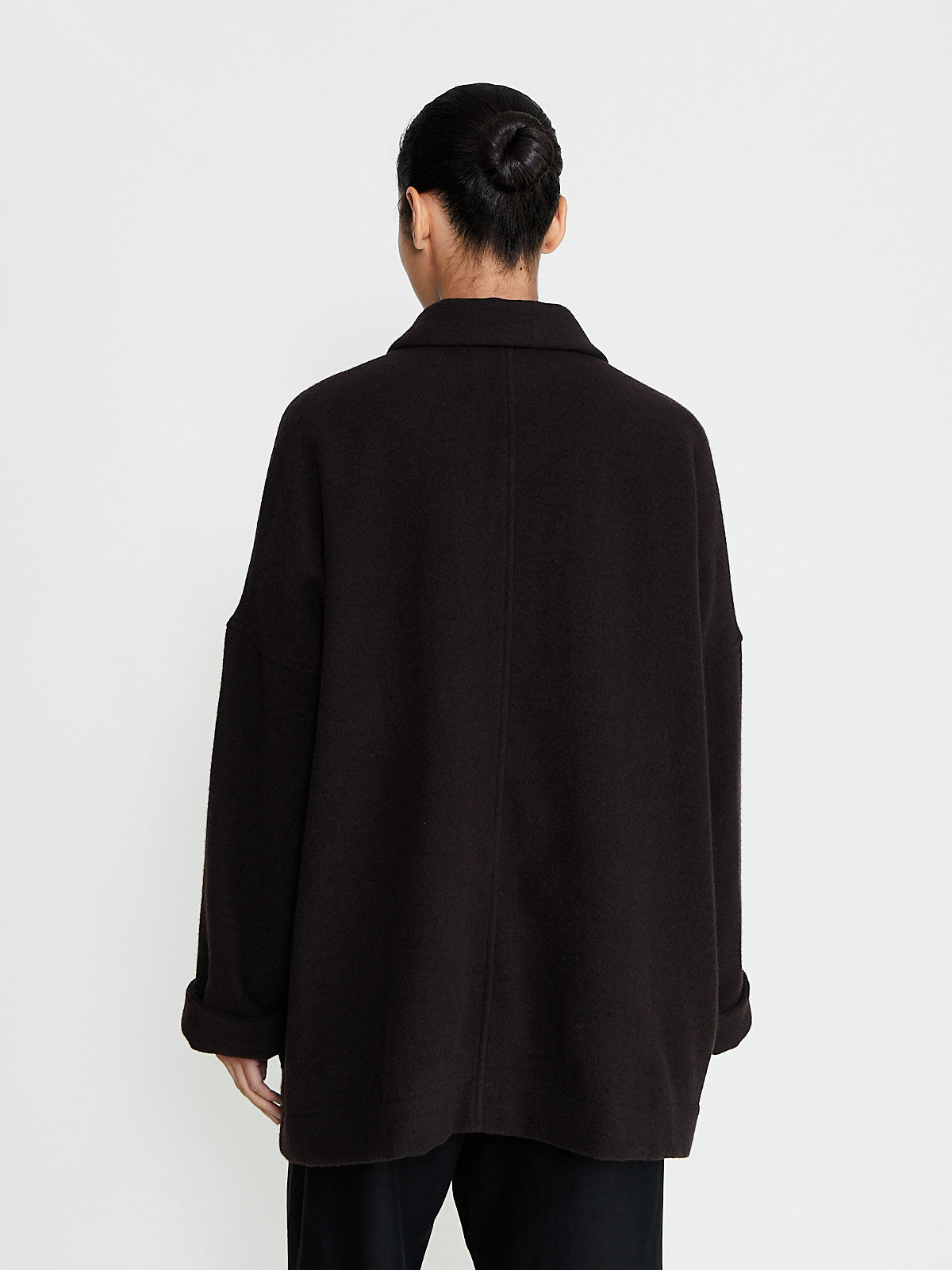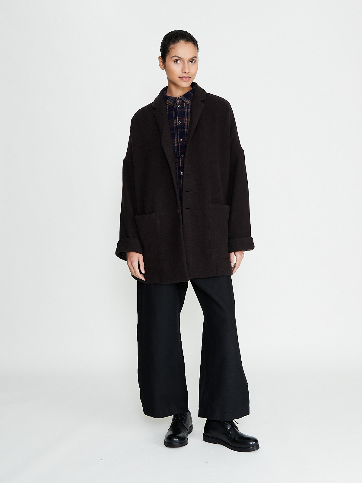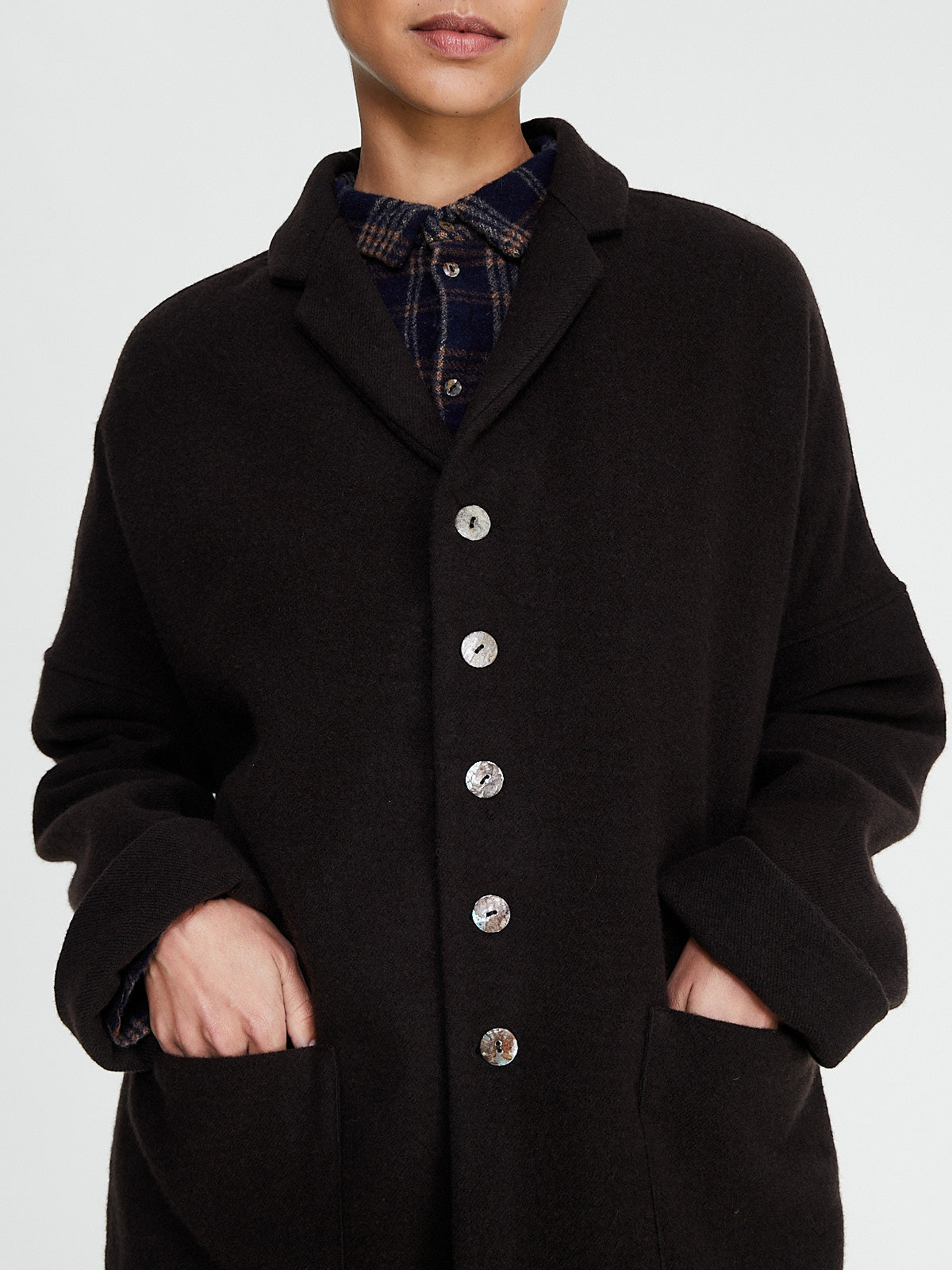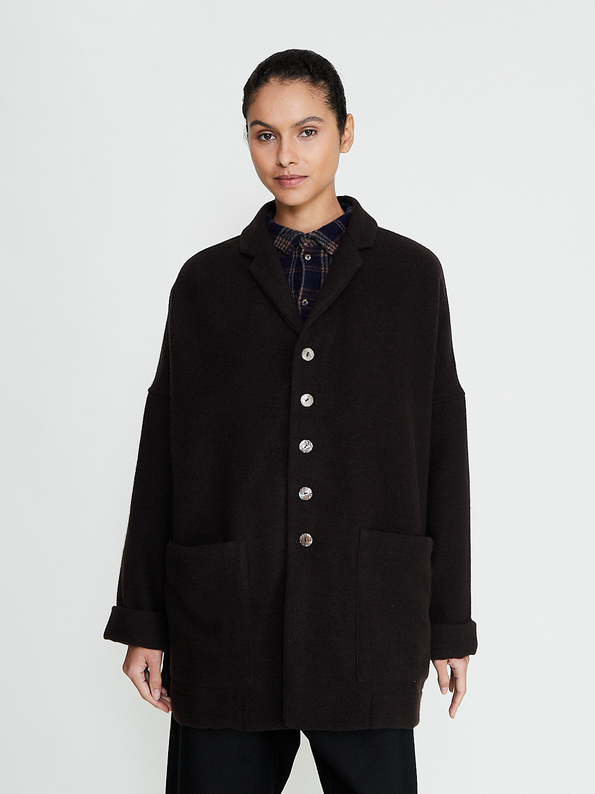 Oversized blazer in a brown virgin wool blend. Notched collar, front button fastening and long sleeves with a dropped shoulder. Features patch pockets on the front.