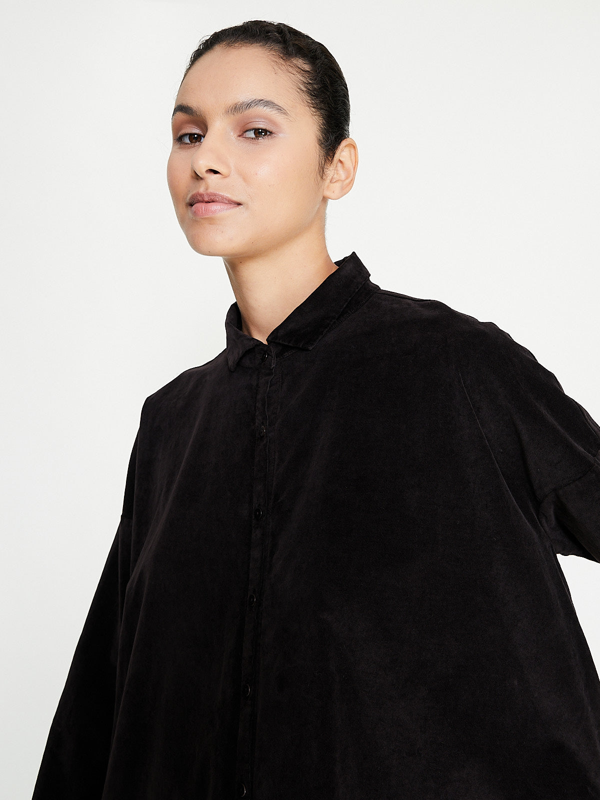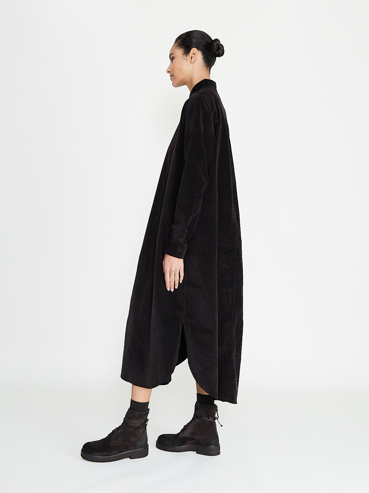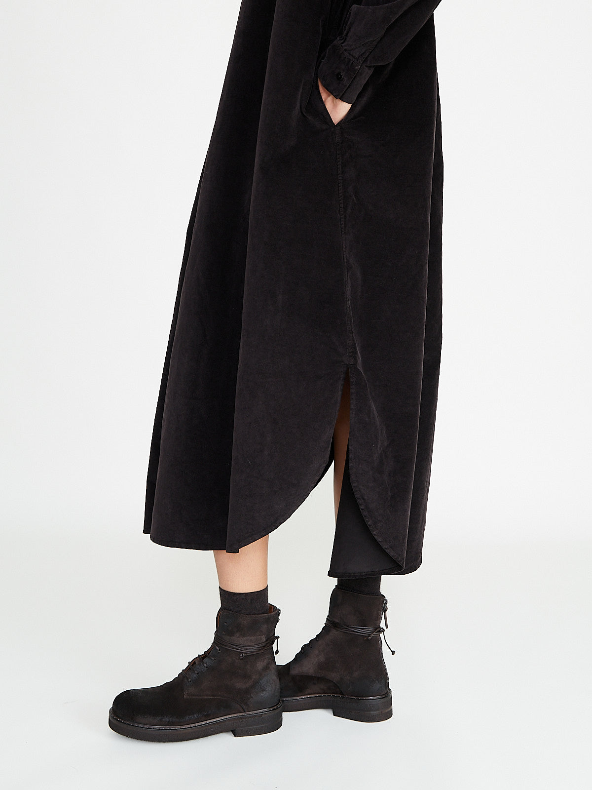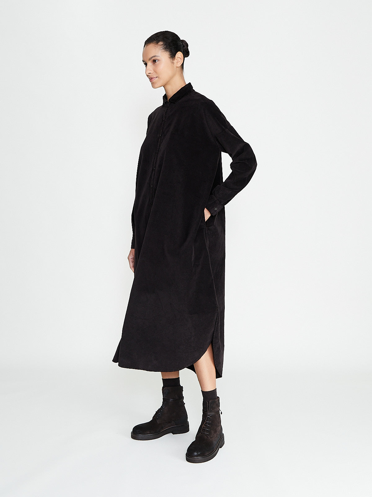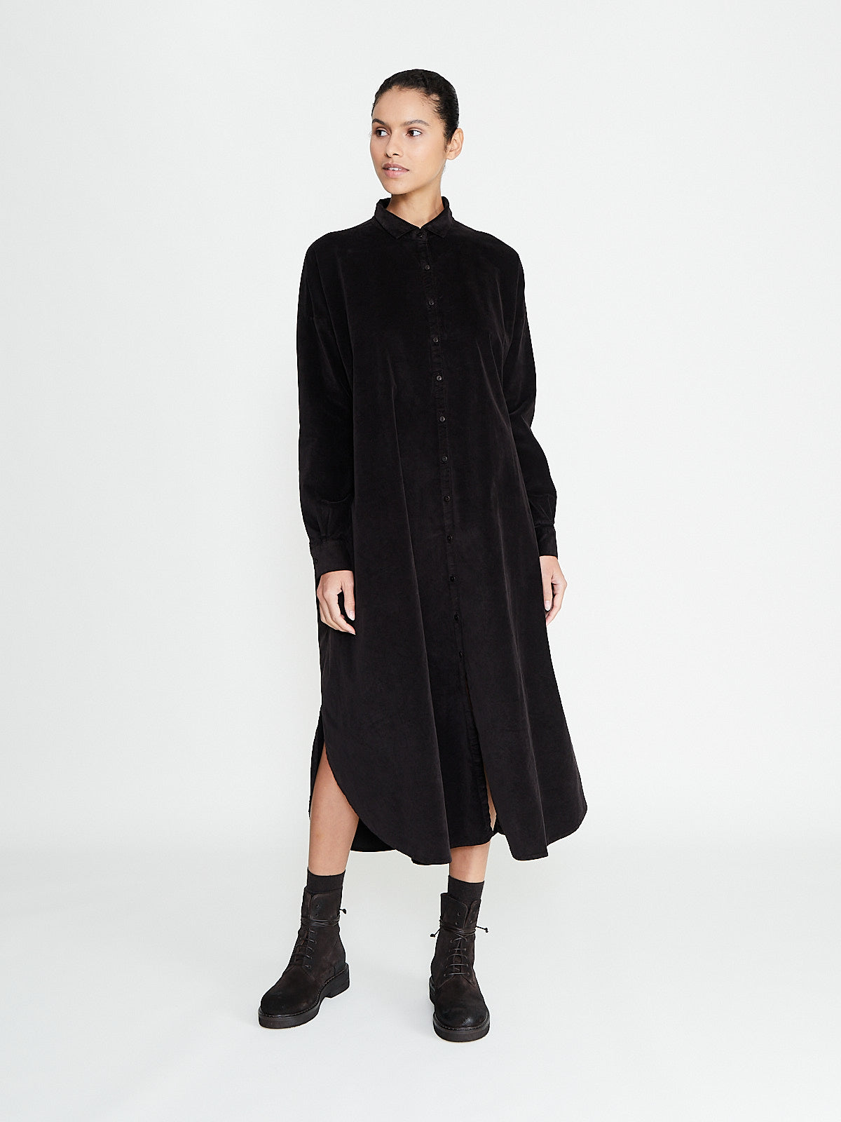 Relaxed long shirt dress in a dark brown cotton blend velvet. Small shirt collar, front button fastening and long sleeves with a dropped shoulder. Side seam pockets. Curved hemline with side slits. Mid-calf length.