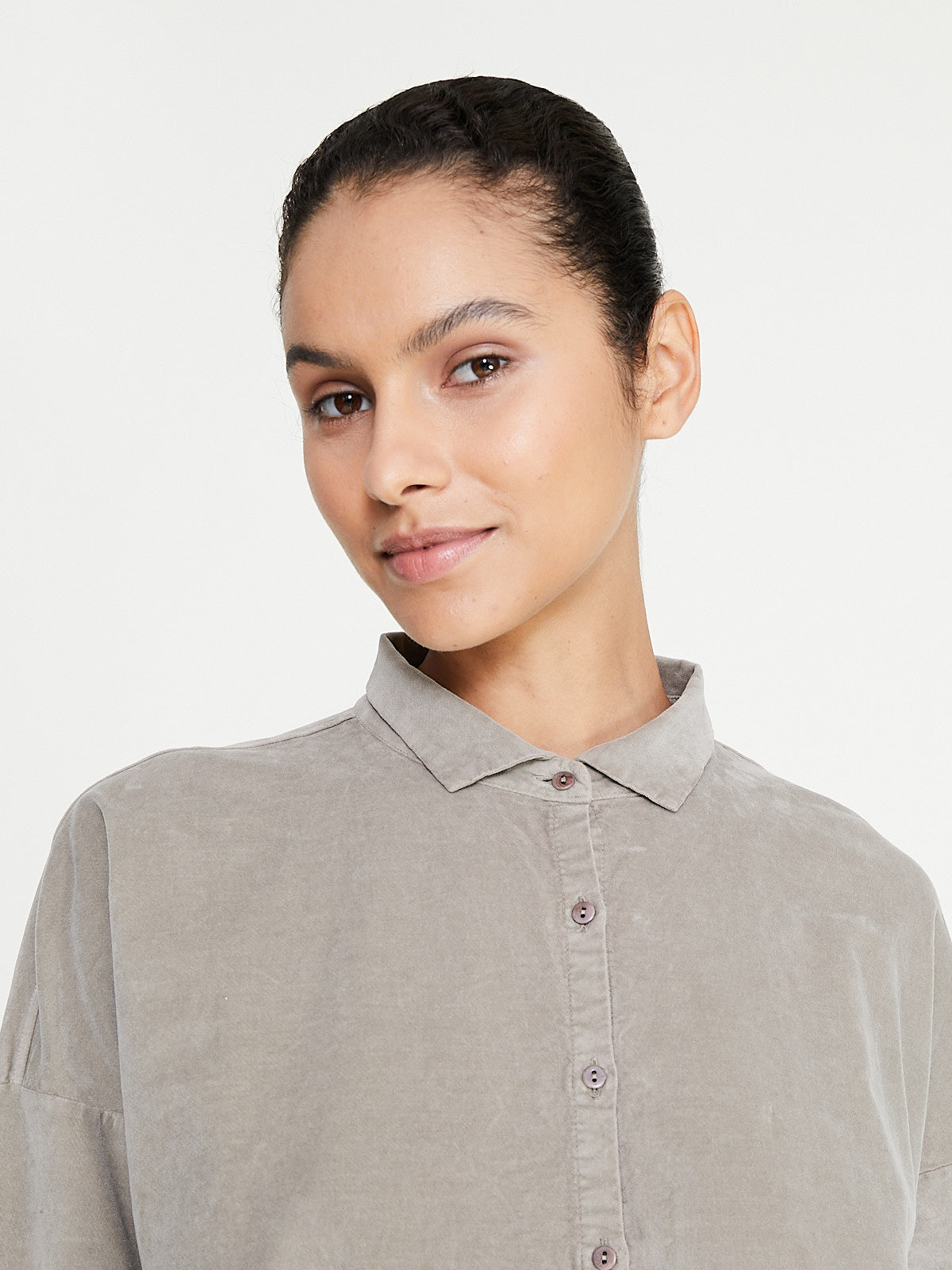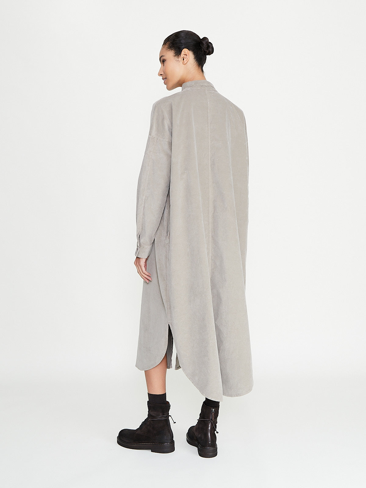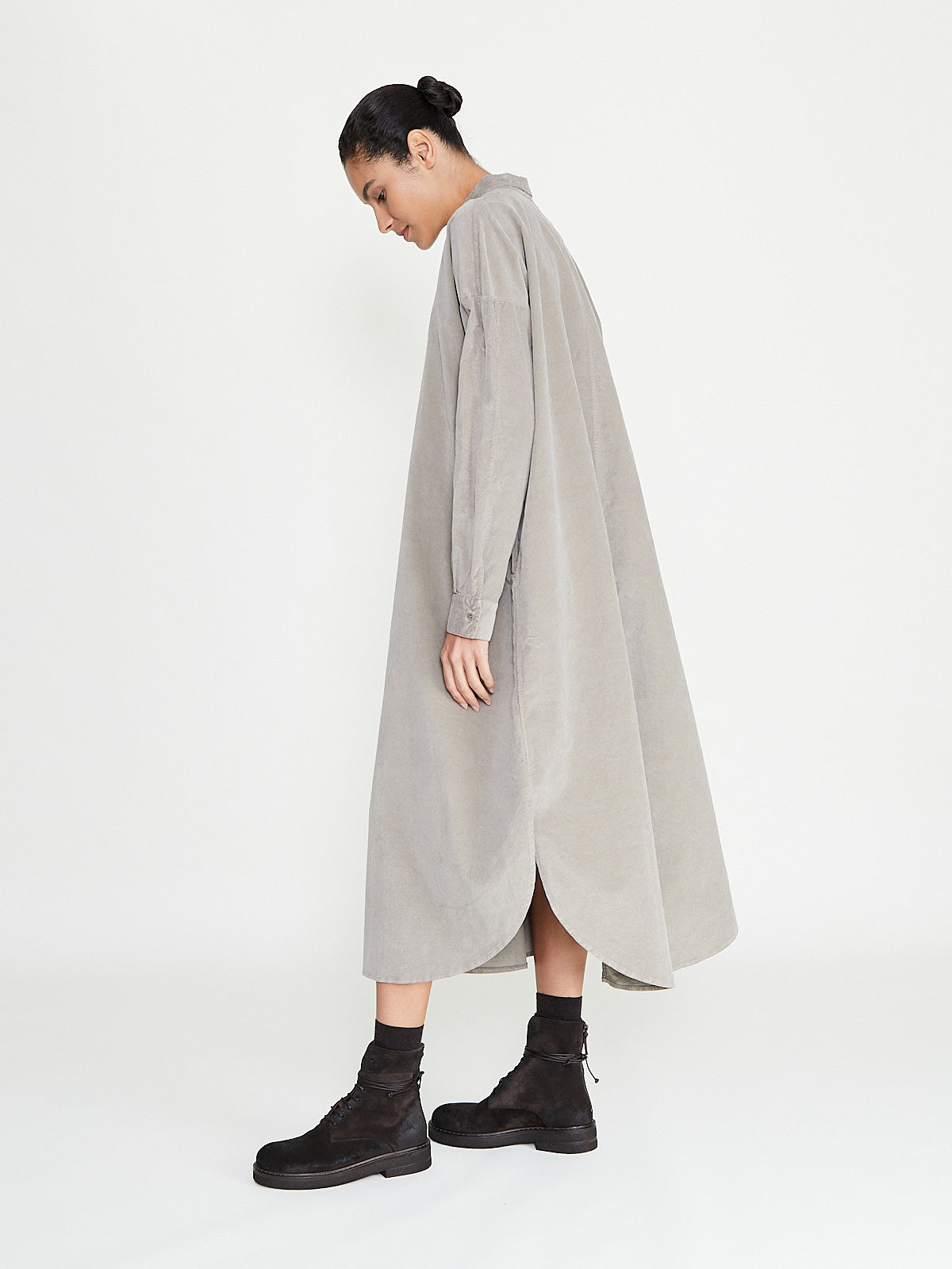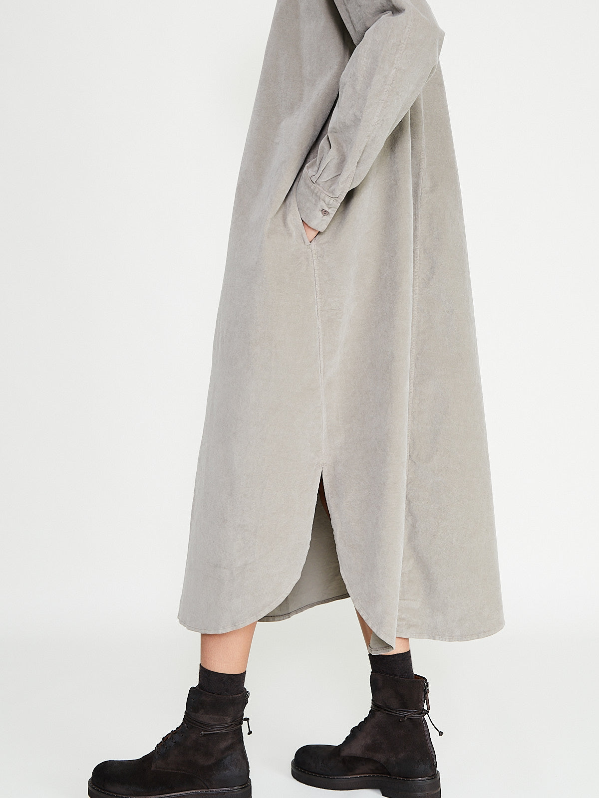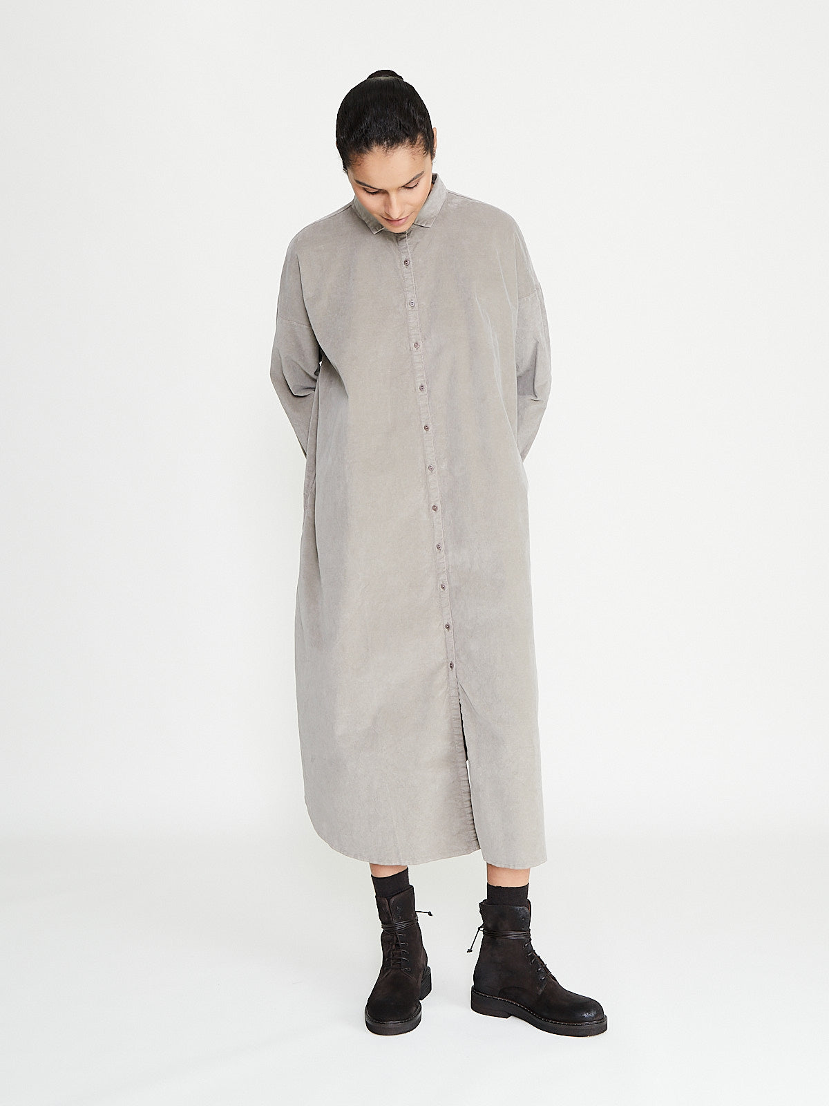 Relaxed long shirt dress in a greige cotton blend velvet. Small shirt collar, front button fastening and long sleeves with a dropped shoulder. Side seam pockets. Curved hemline with side slits. Mid-calf length.