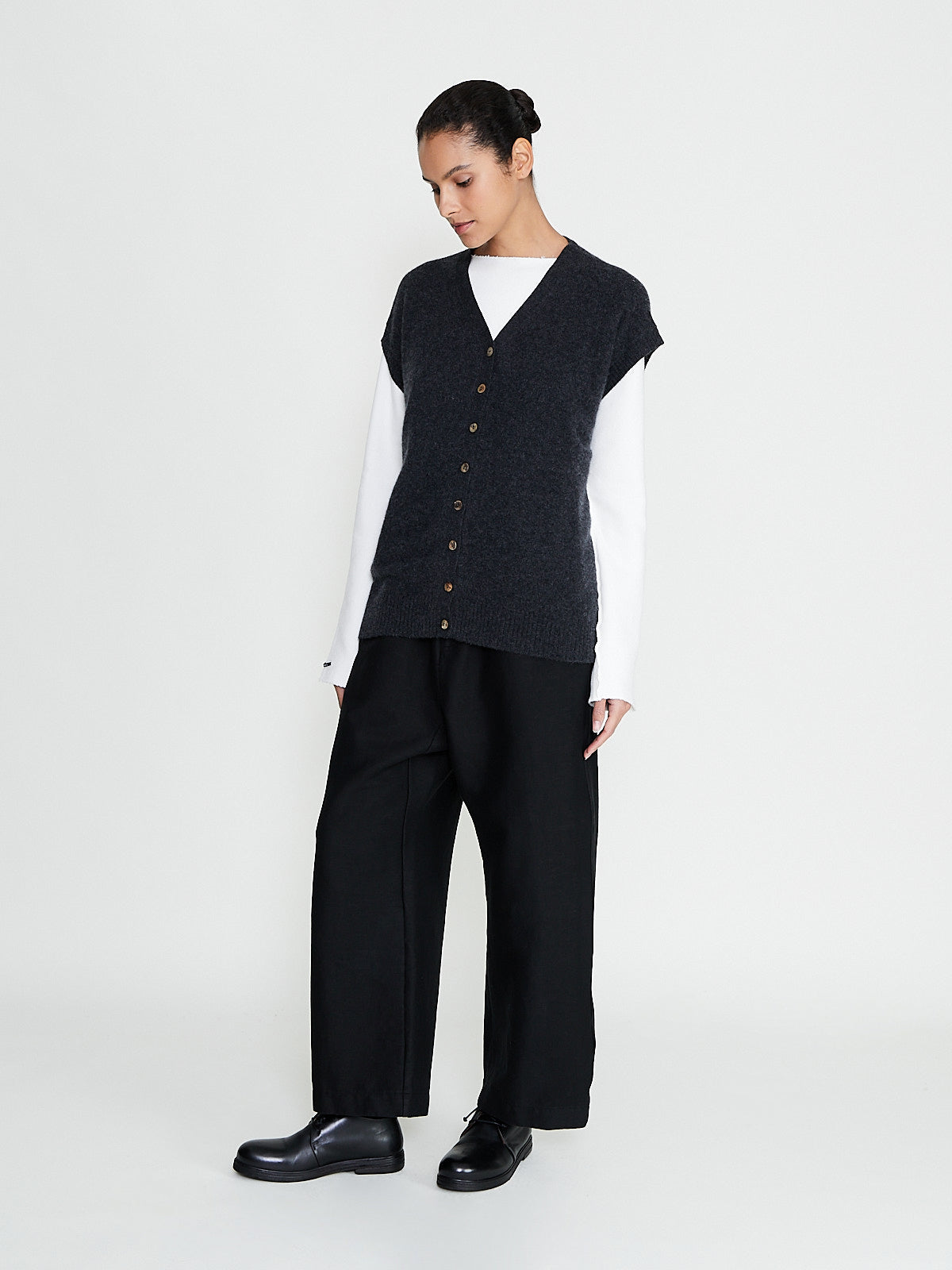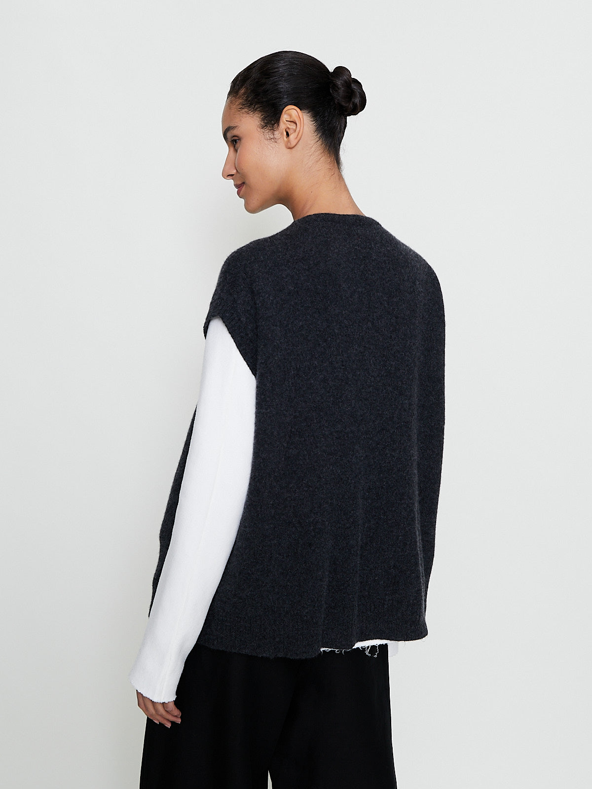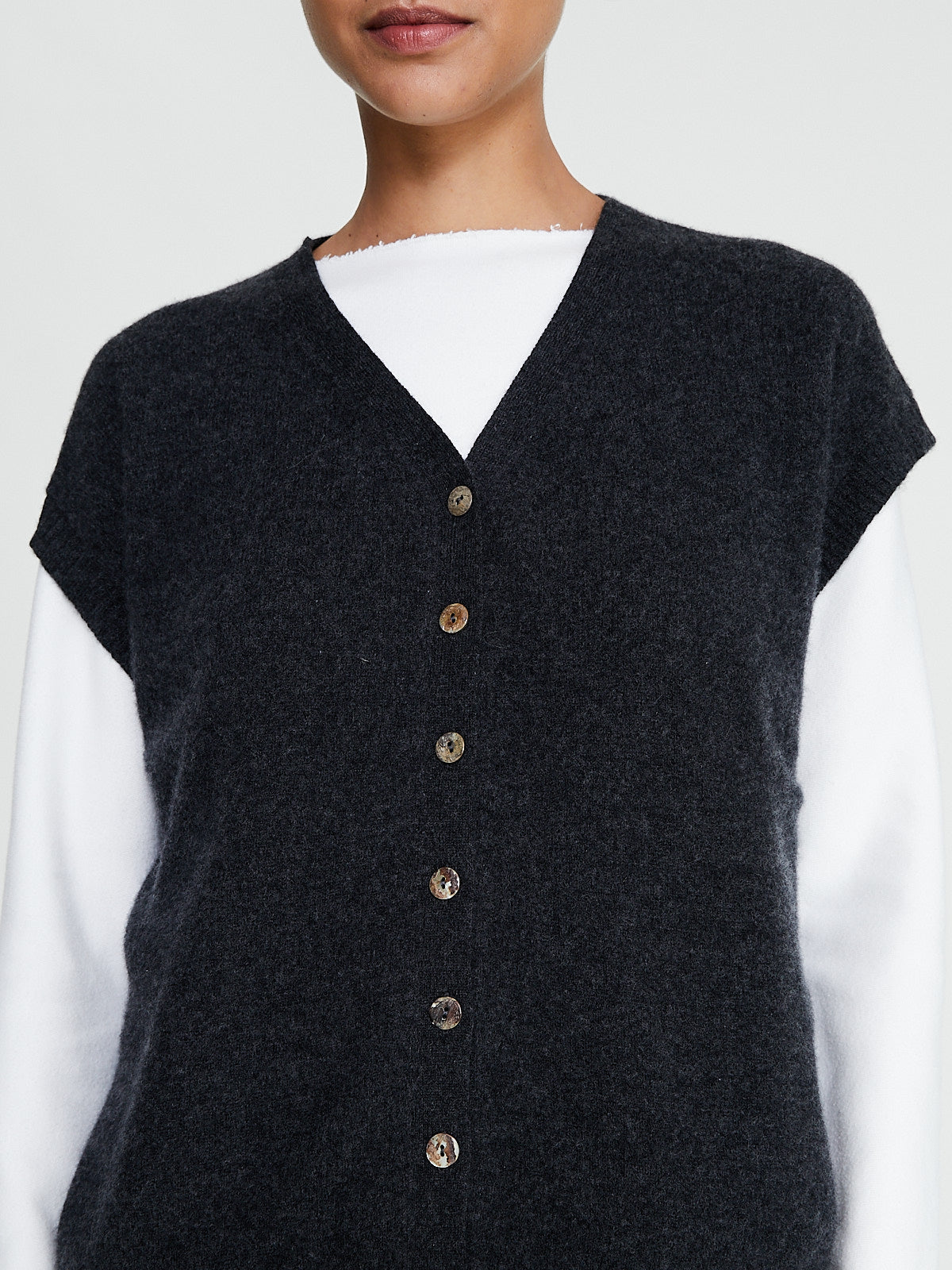 Vest in off black cashmere. V-neck, front button fastening and capped sleeves. Rib detail around the armholes and bottom hem. Relaxed fit.
