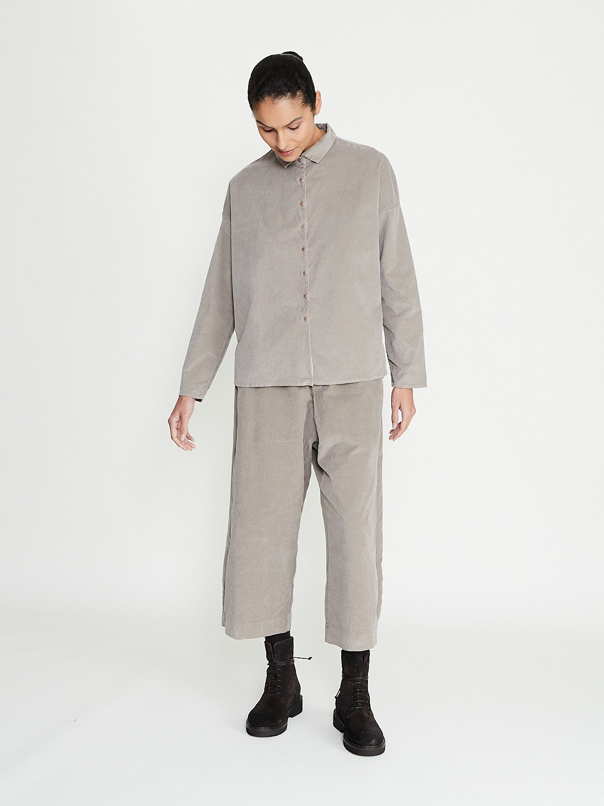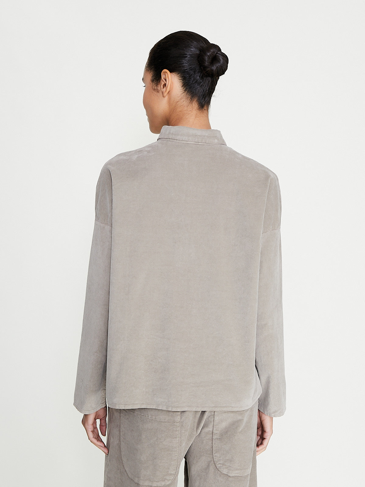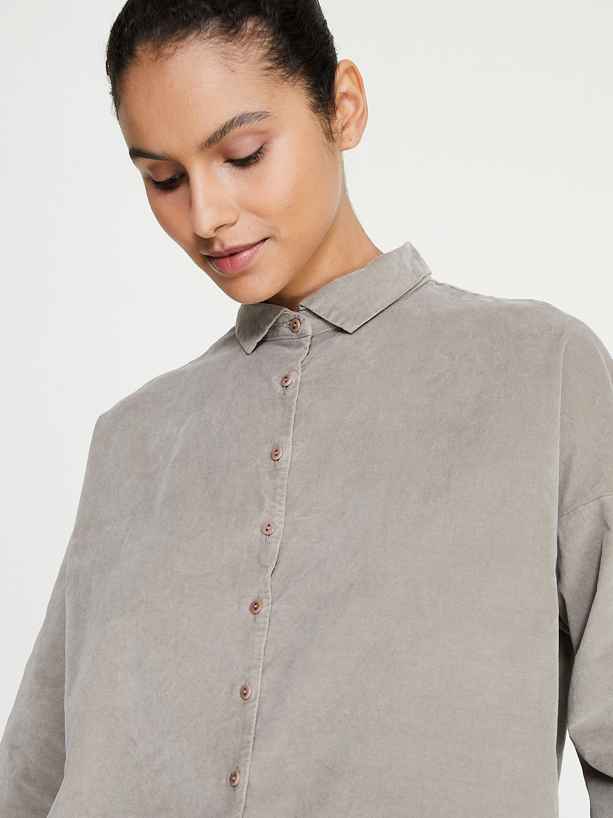 Oversized shirt in greige cotton blend velvet. Small spread collar, front button fastening and long sleeves with a dropped shoulder. Boxy fit.