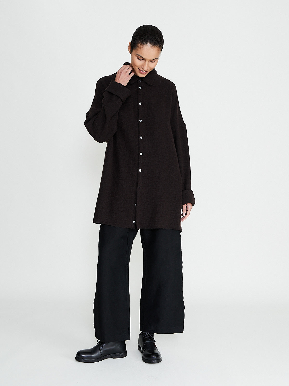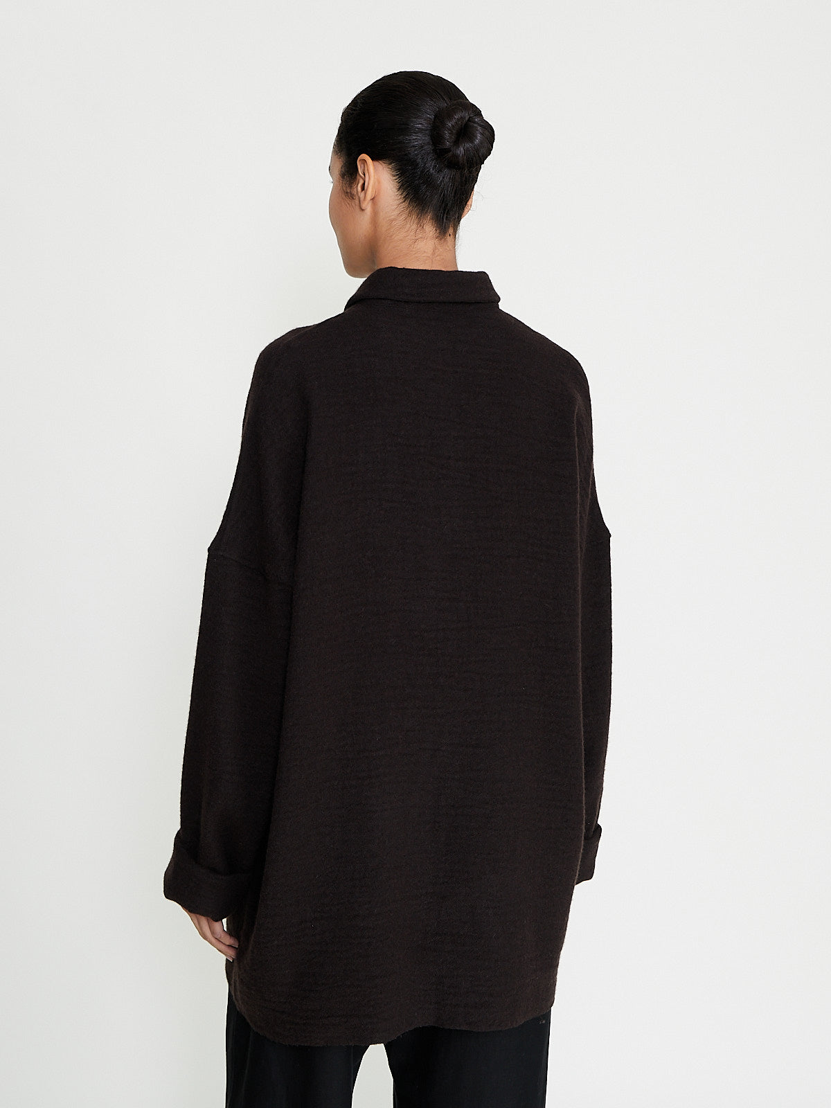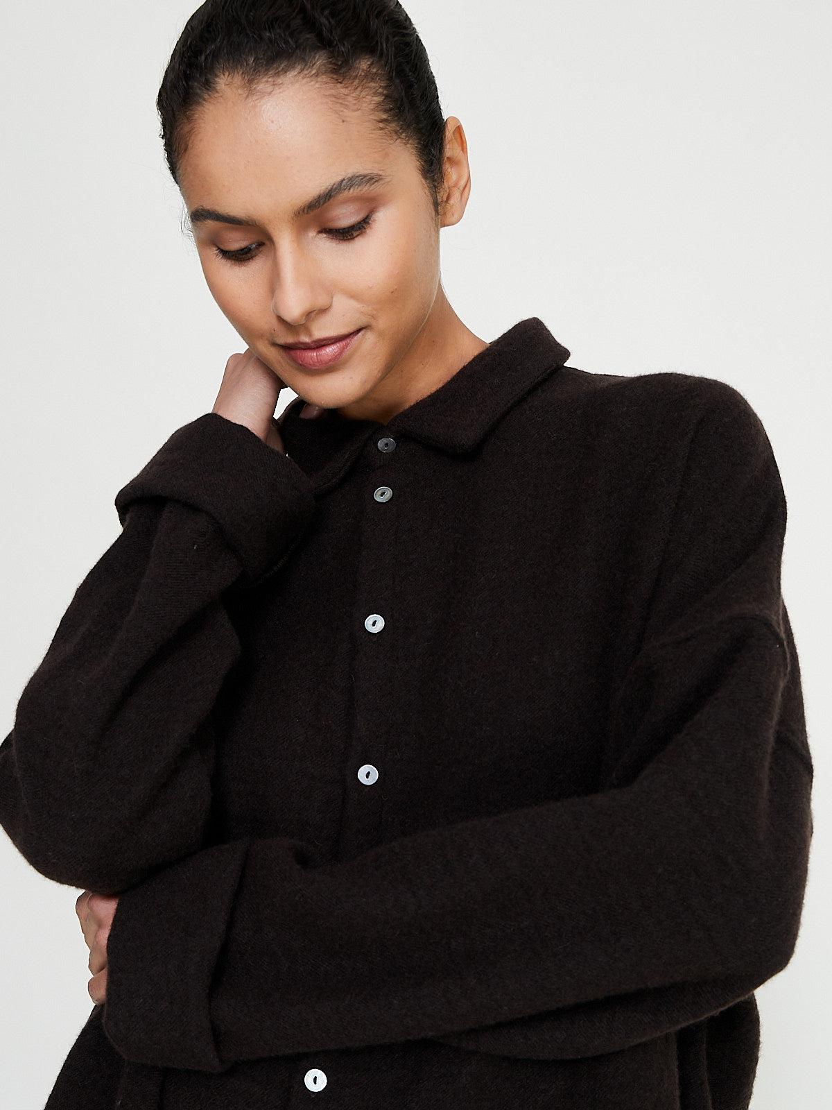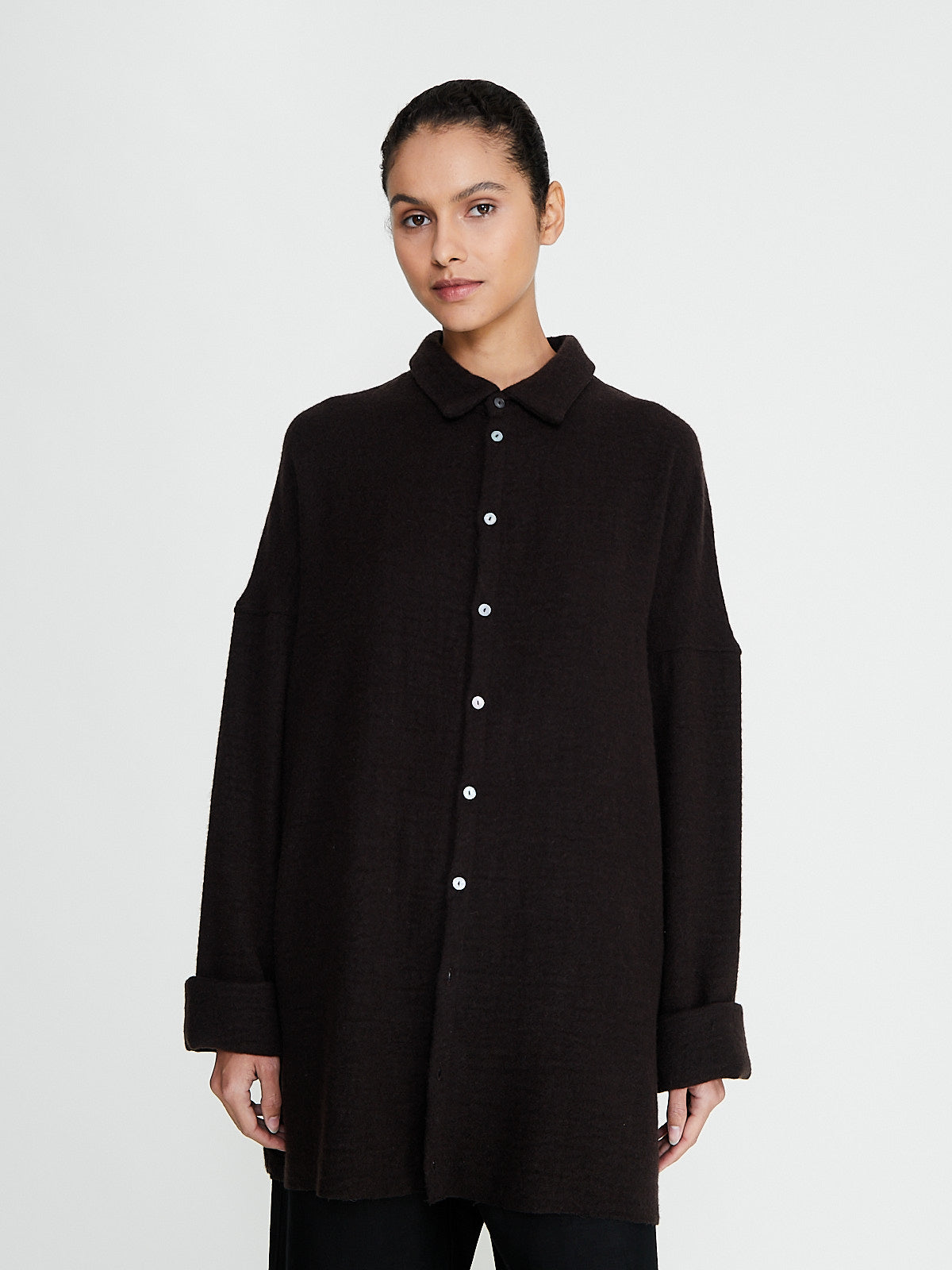 Oversized shirt in dark brown light virgin wool/cashmere blend. Classic shirt collar, front button fastening and long sleeves with a dropped shoulder.