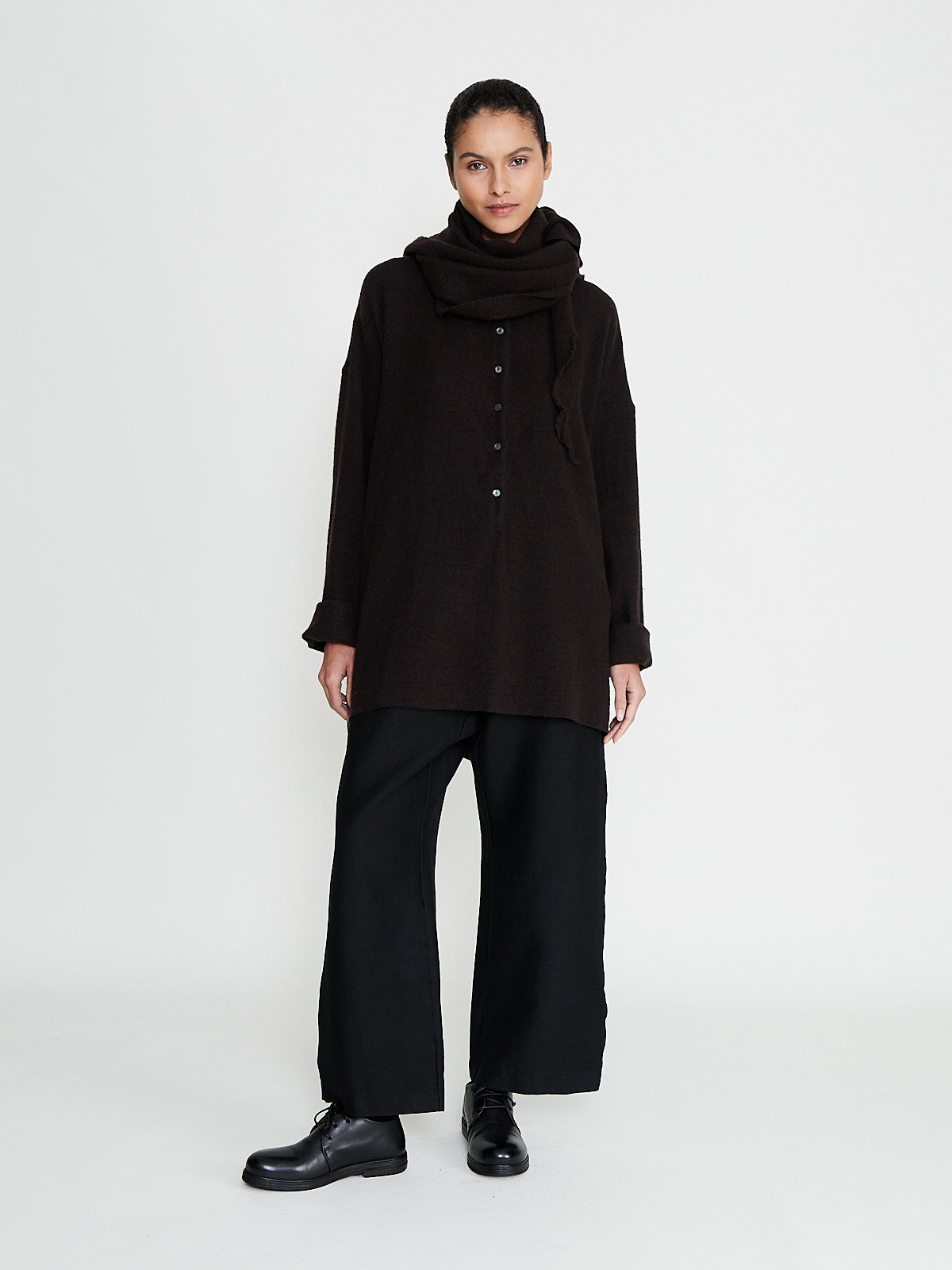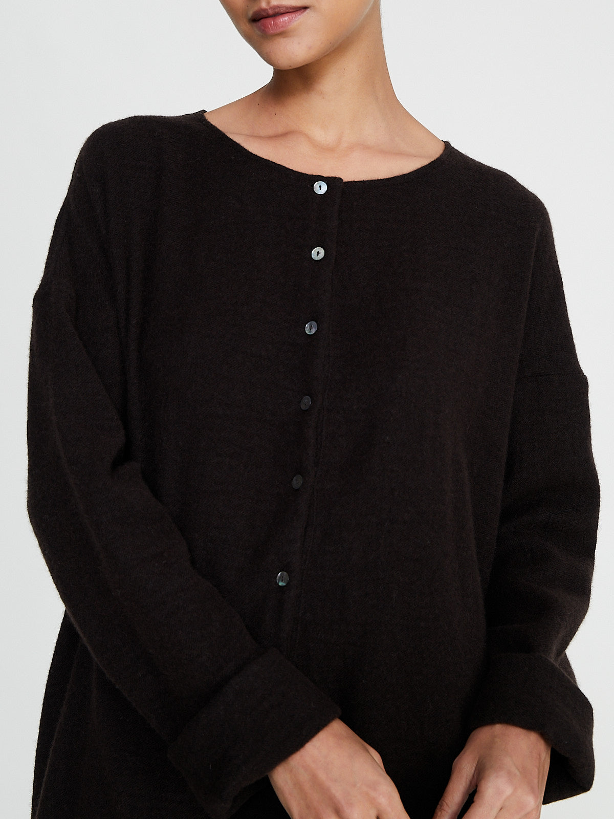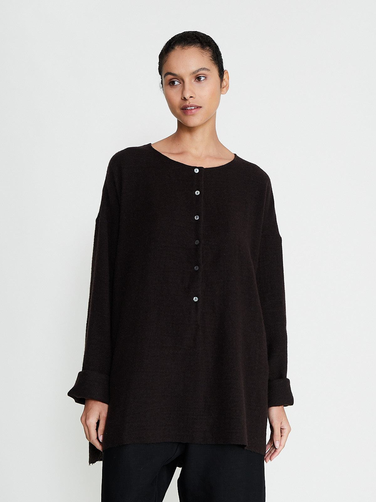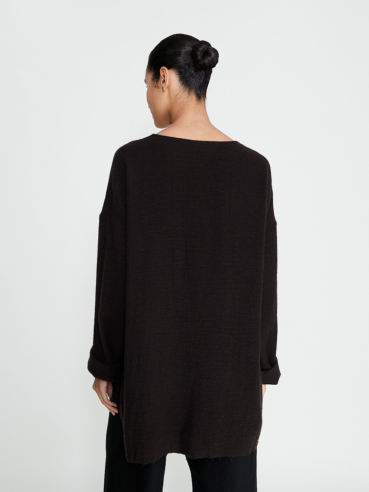 Oversized long sleeve t-shirt in a dark brown light virgin wool/cashmere blend. Wide round neckline, partial front button fastening and long sleeves with a dropped shoulder. Raw cuffs and bottom hem.
