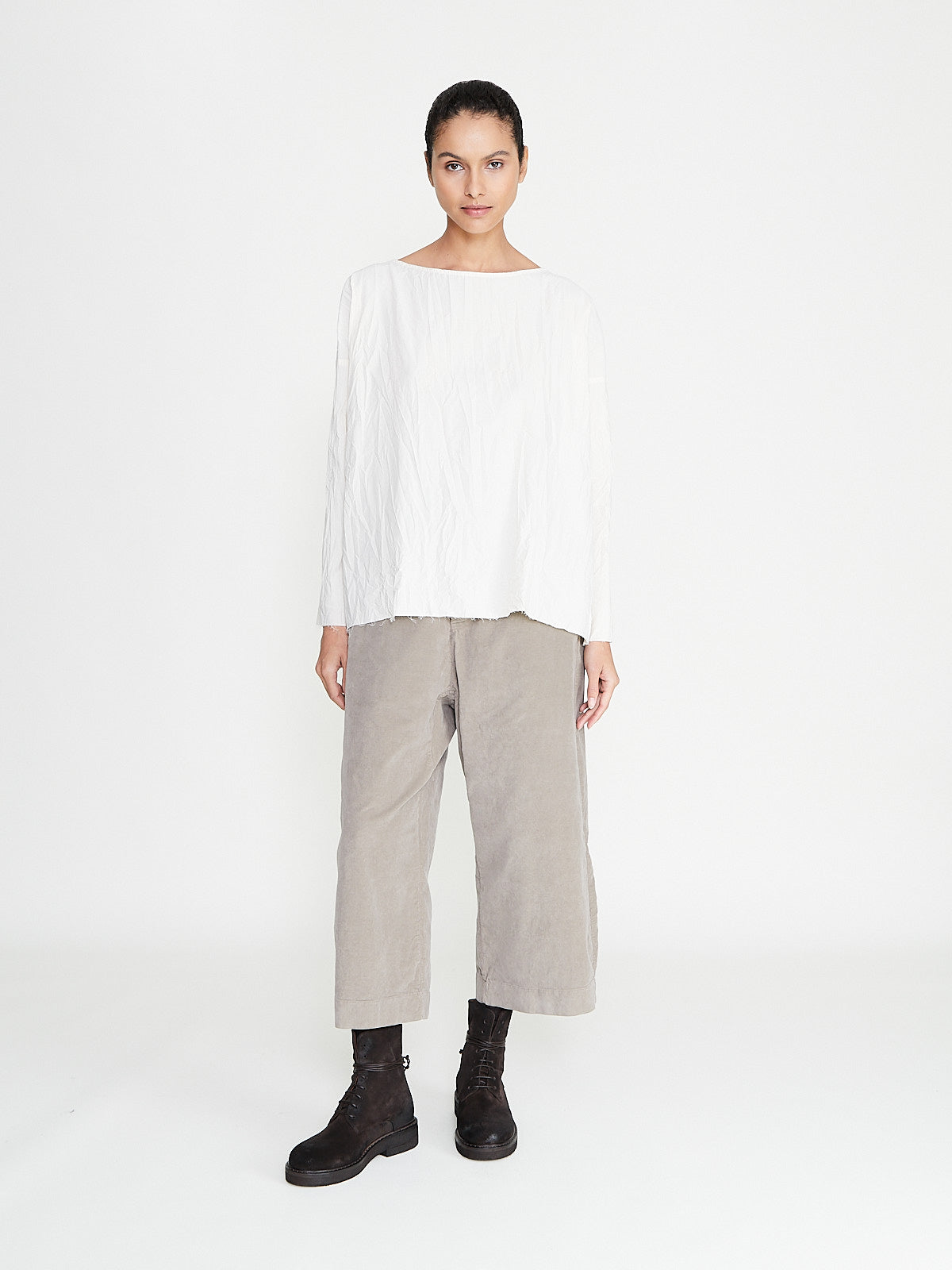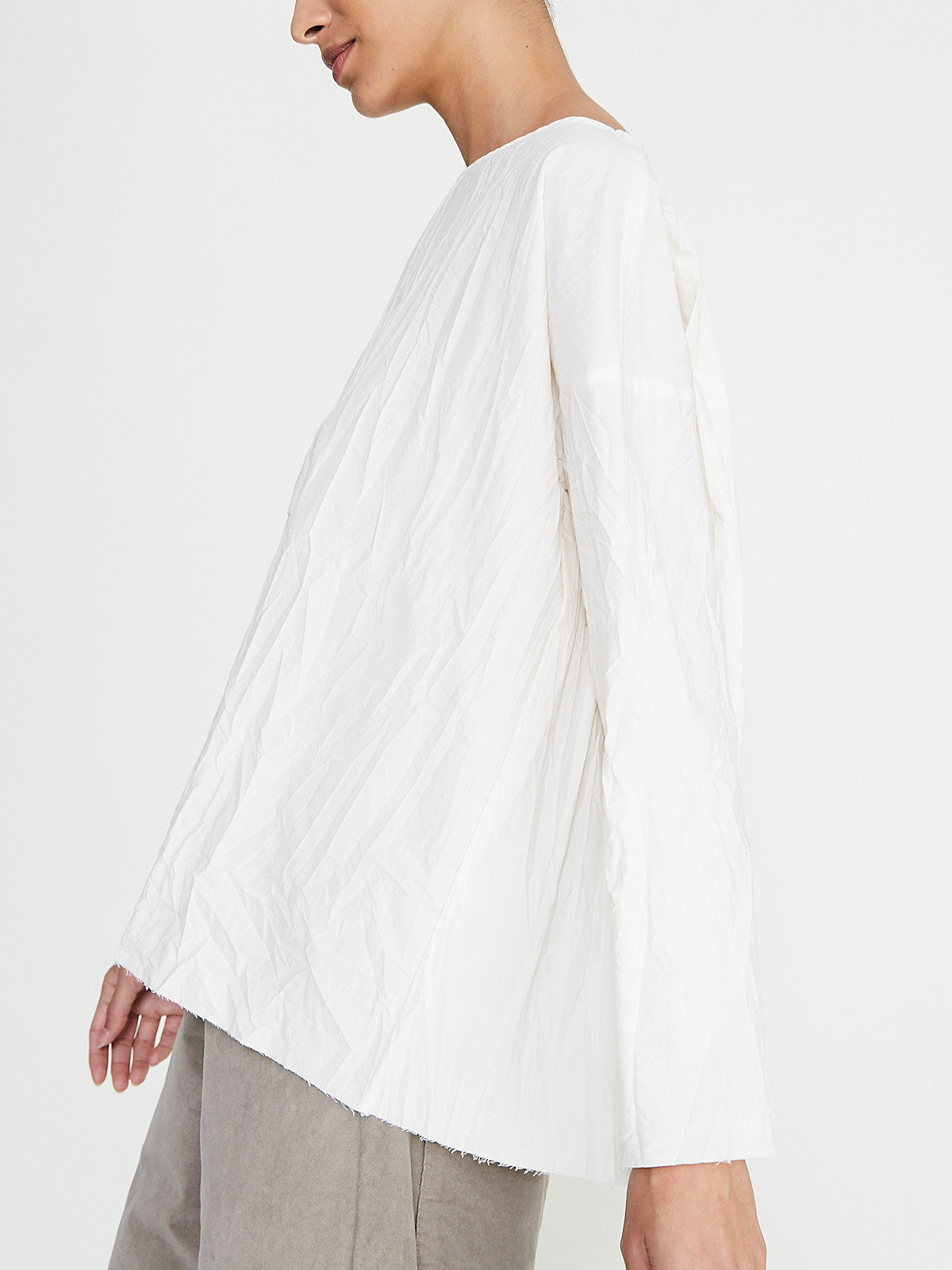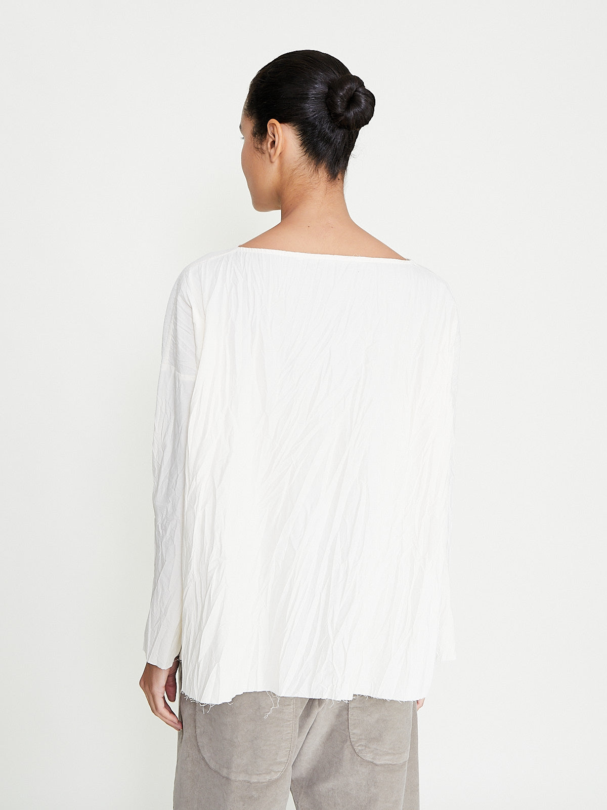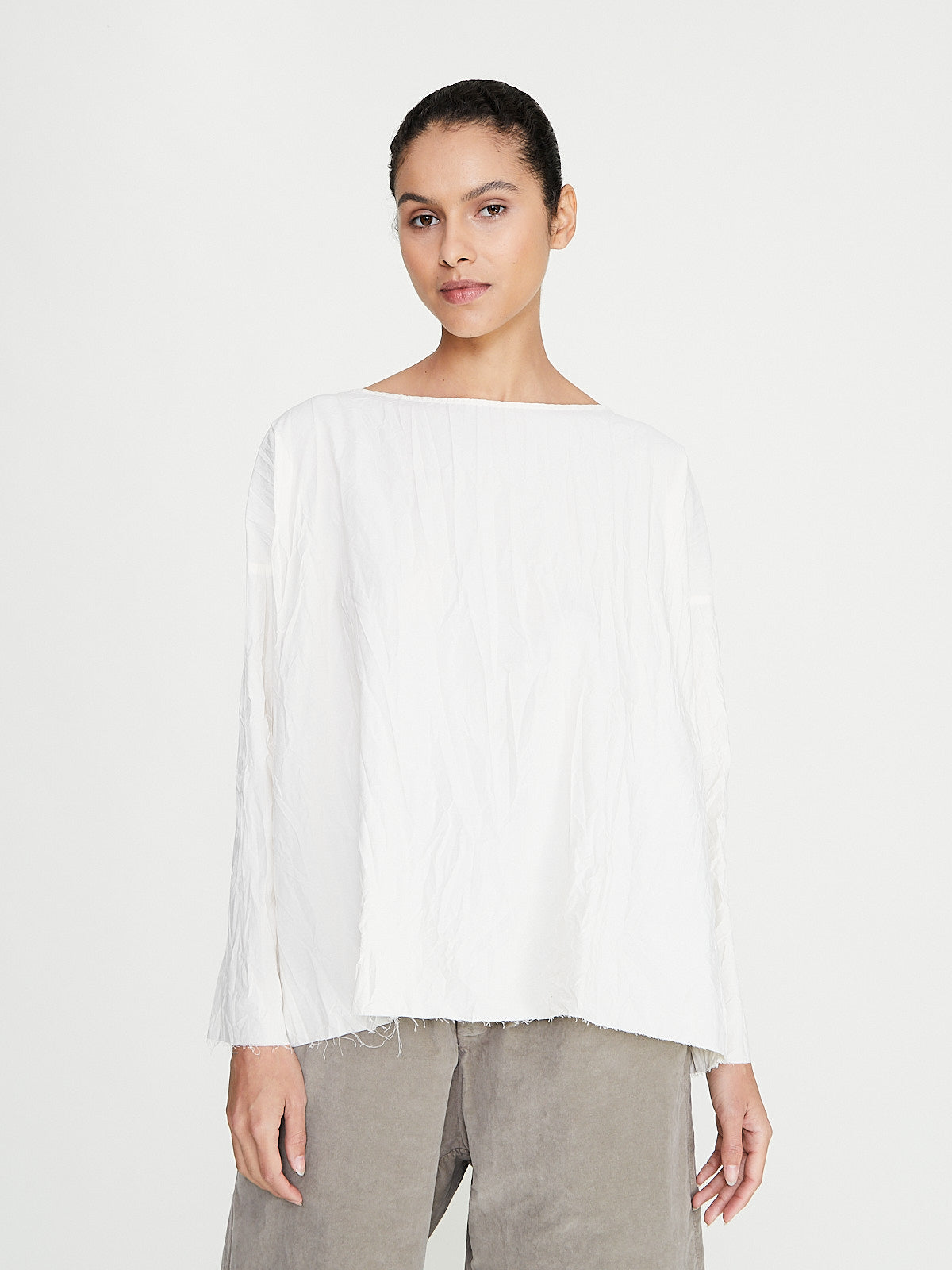Oversized top in natural light wrinkled cotton. Boatneck and long sleeves with a dropped shoulder. Raw cuffs and bottom hem. Boxy fit.