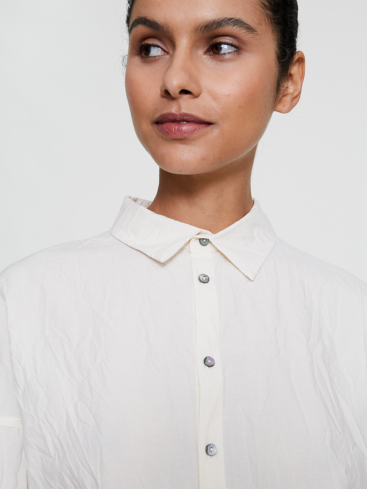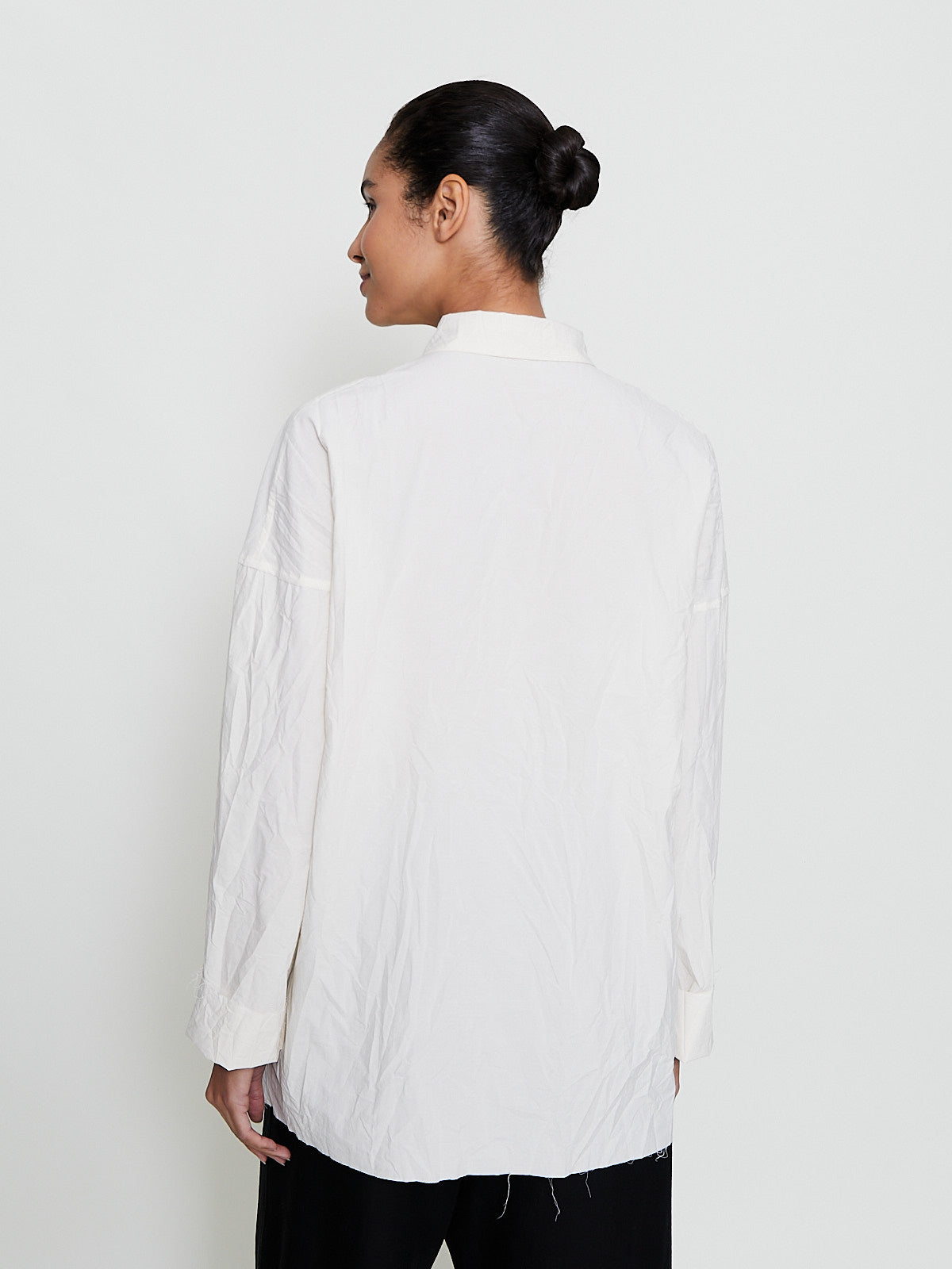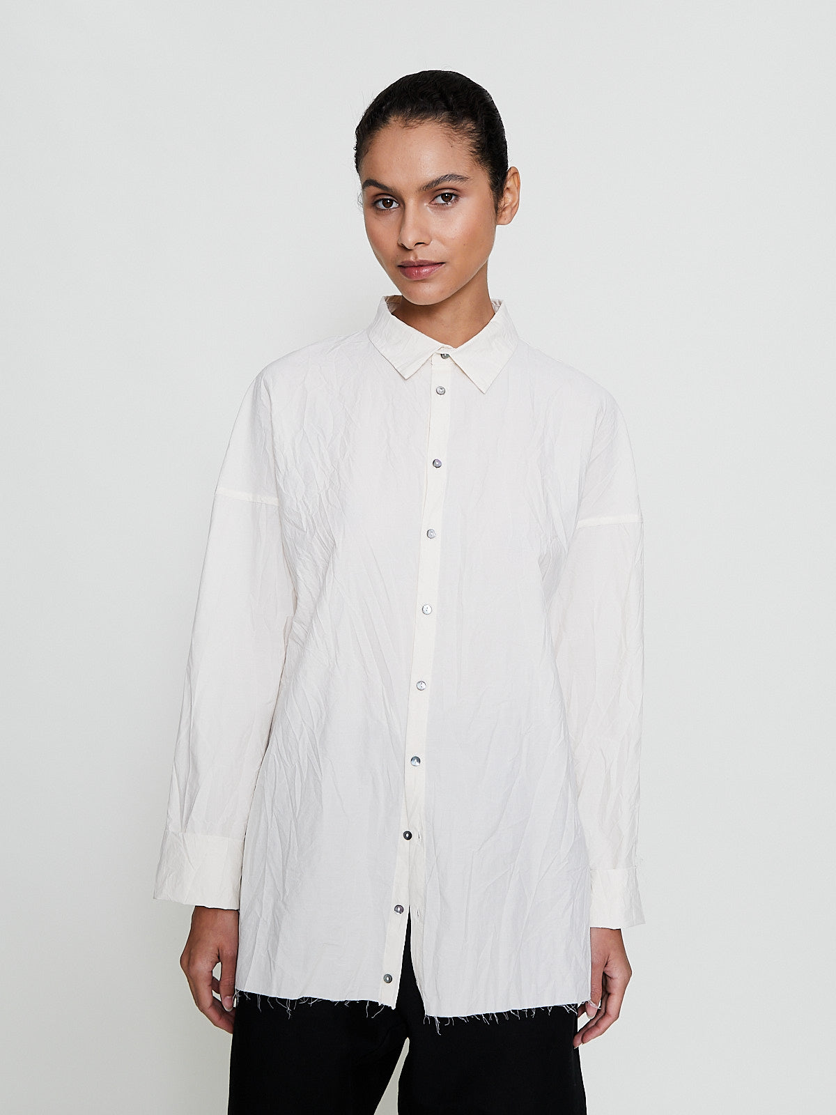 Oversized unisex shirt in natural light wrinkled cotton. Classic shirt collar, front button fastening and long sleeves with a dropped shoulder. Features raw cuffs and bottom hem.