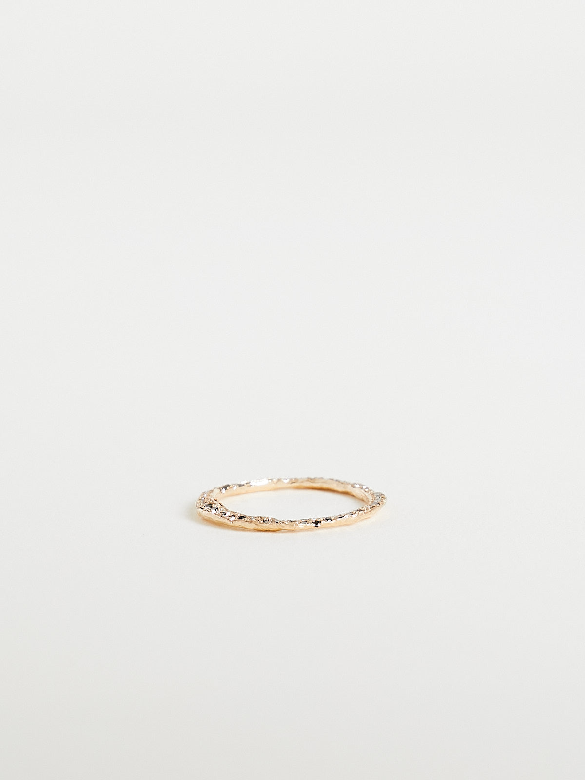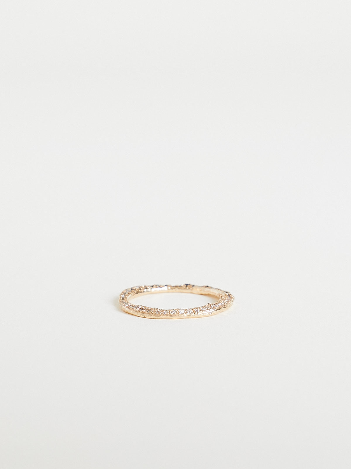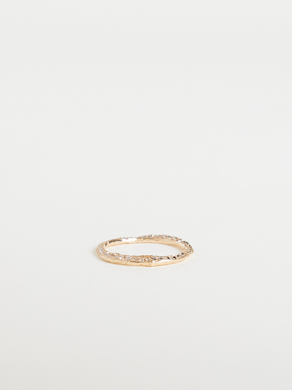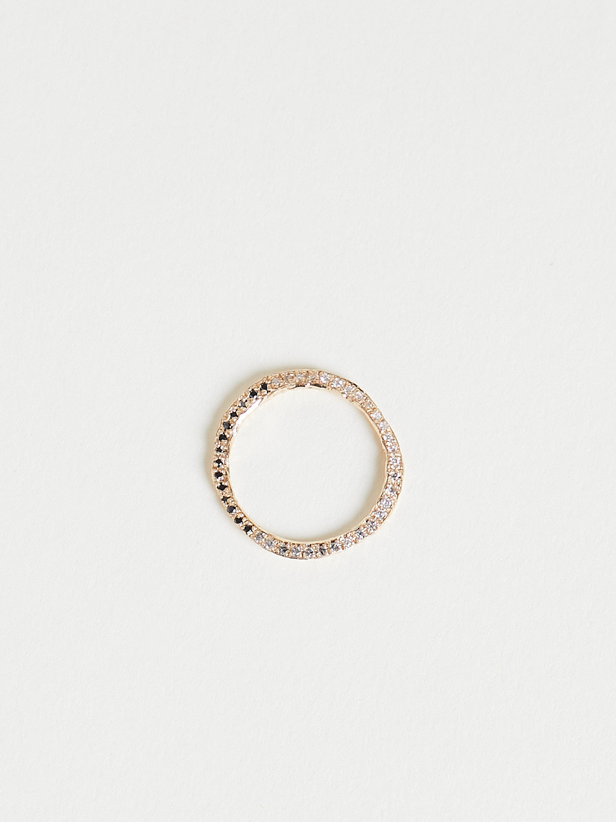 Handcrafted irregular-shaped stacking ring in 14k yellow gold encrusted with white, black and grey pavé diamonds at the top.