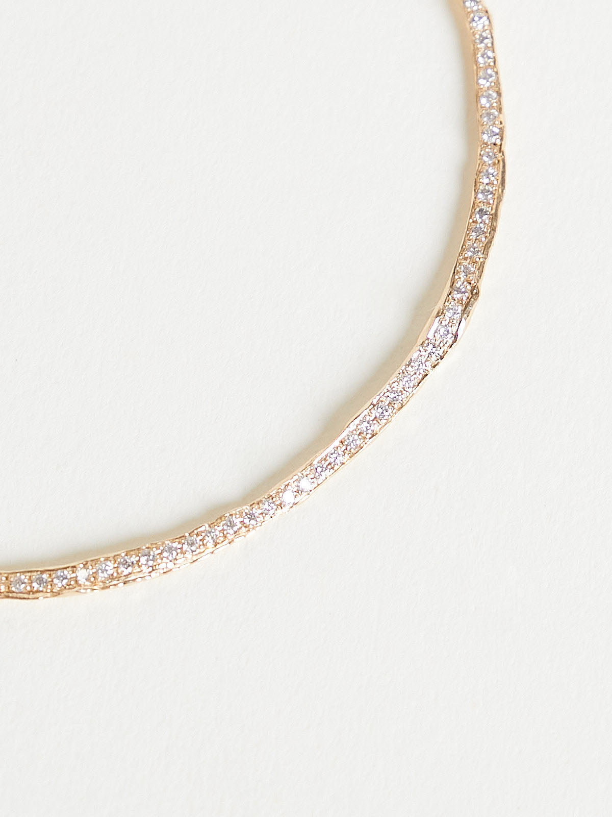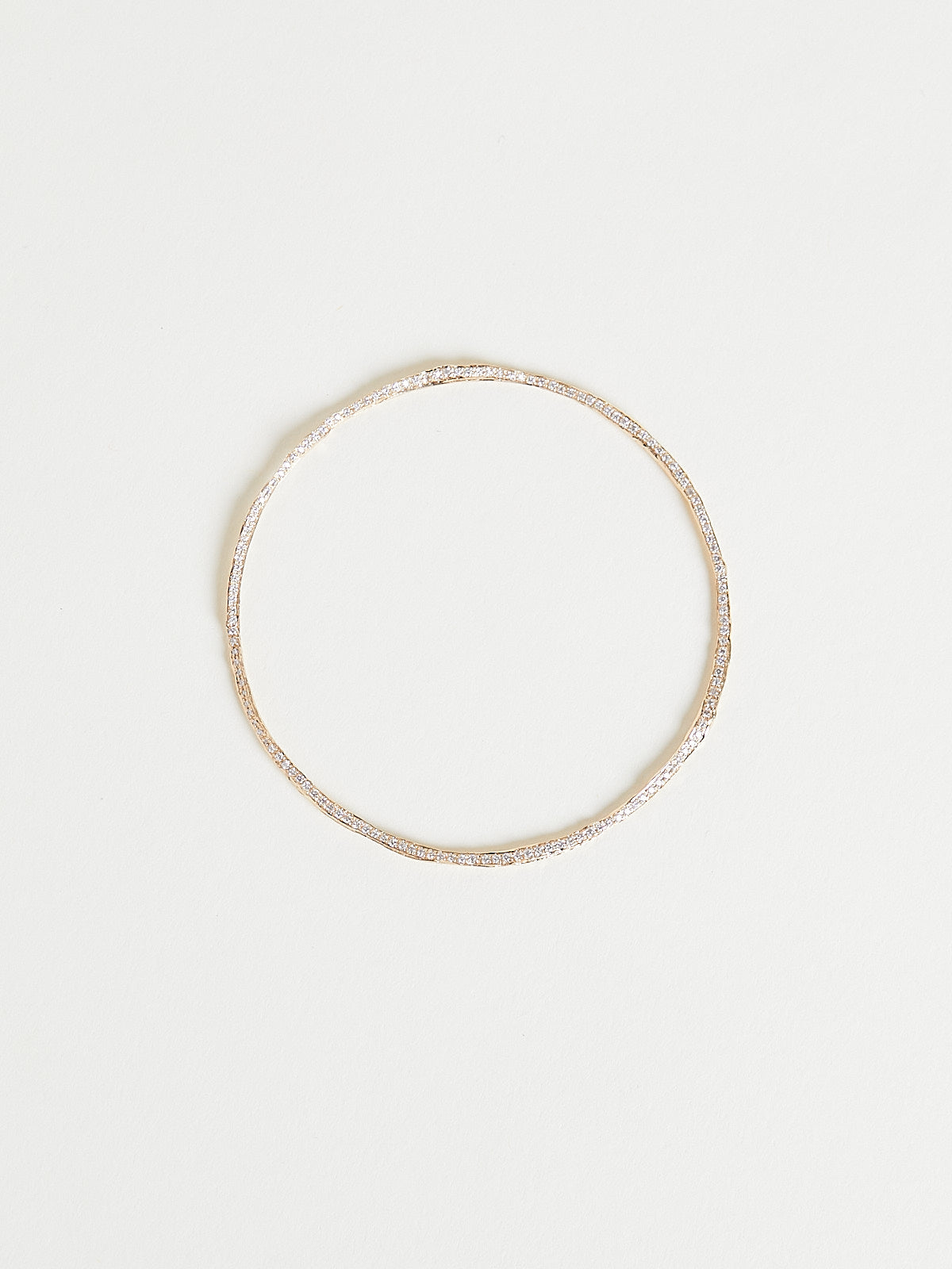 Handcrafted delicate irregular-shaped stacking bangle in 14k yellow gold encrusted with white pavé diamonds.