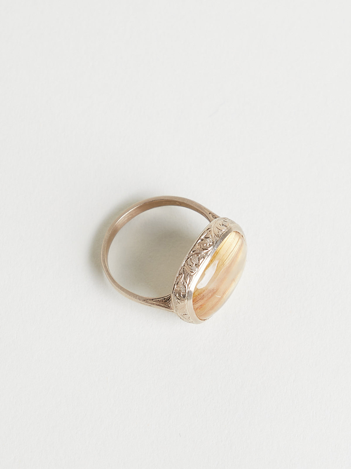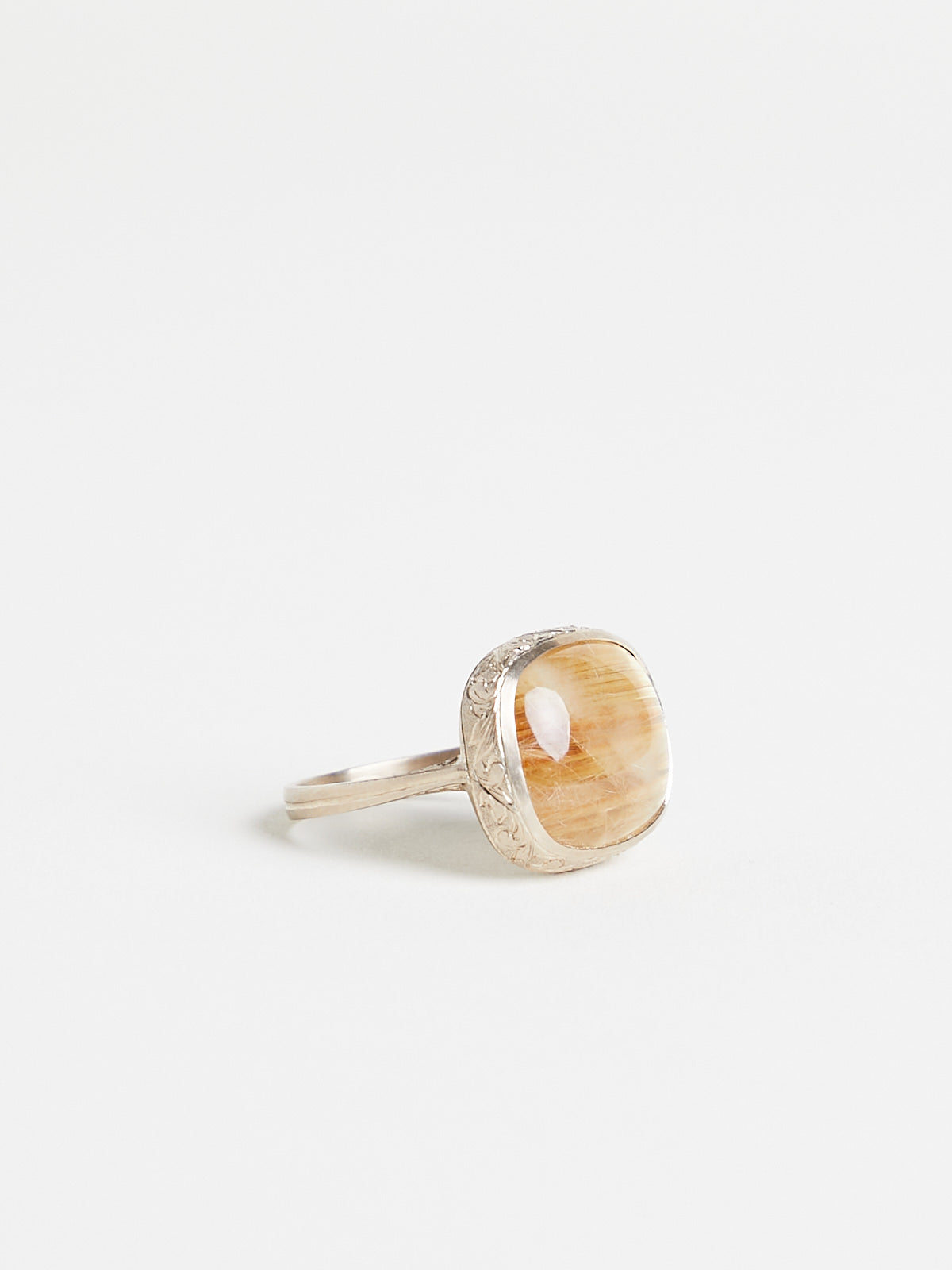 Ring in 9k white gold with a bezel-set 9.5ct rutilated quartz. Features ornamental engraving on the setting.