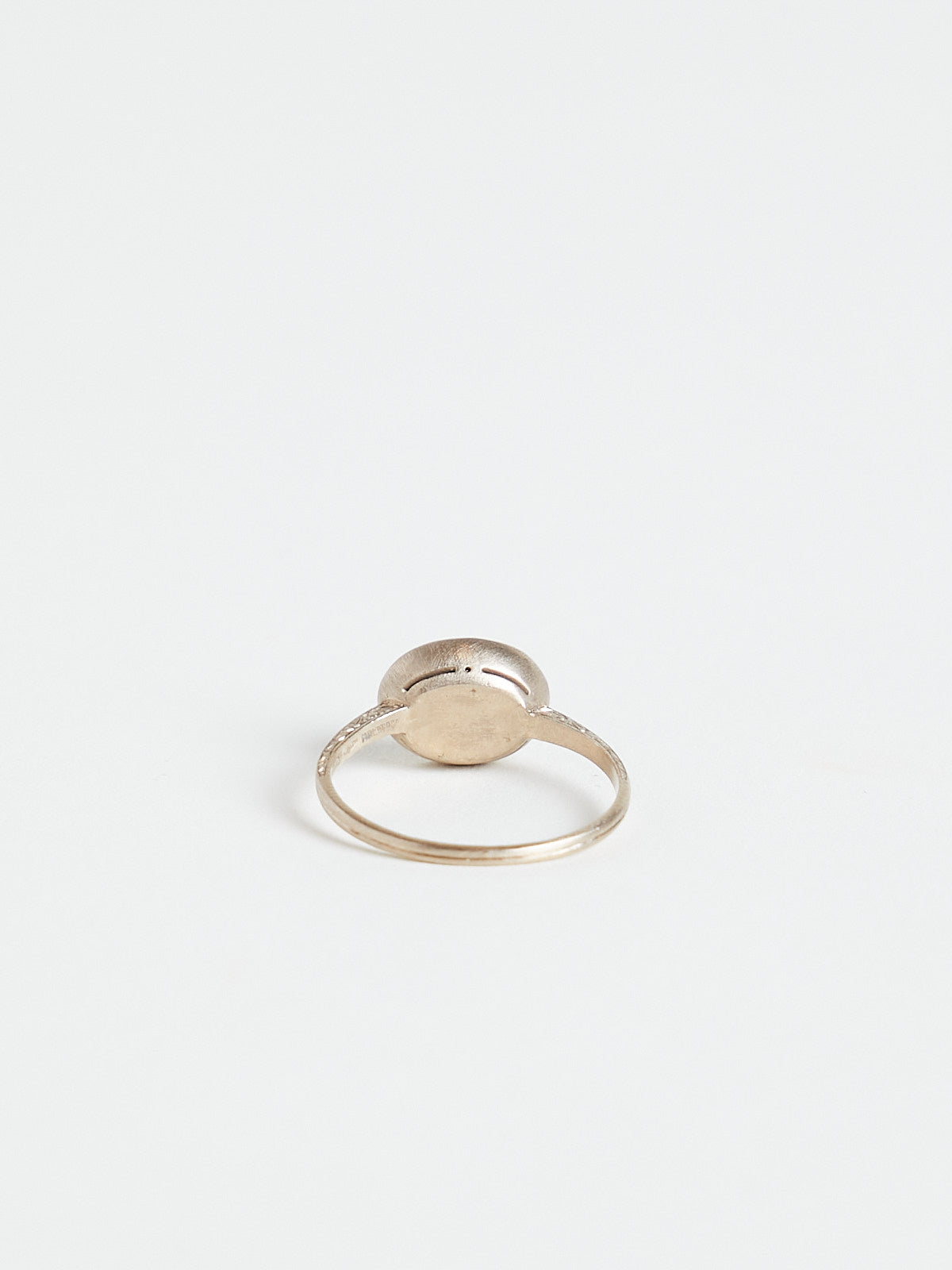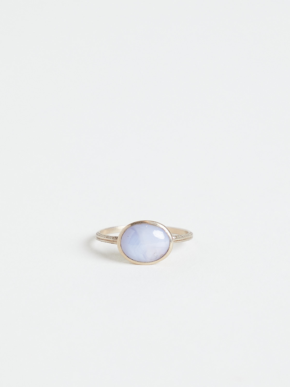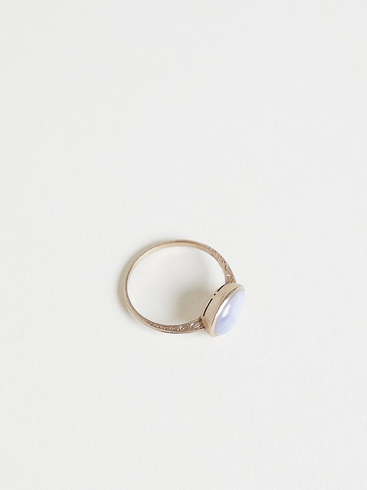 Ring in 18k white gold palladium with an oval 2.35ct blue corundum. Features an ornamental detail on the side of the band.
