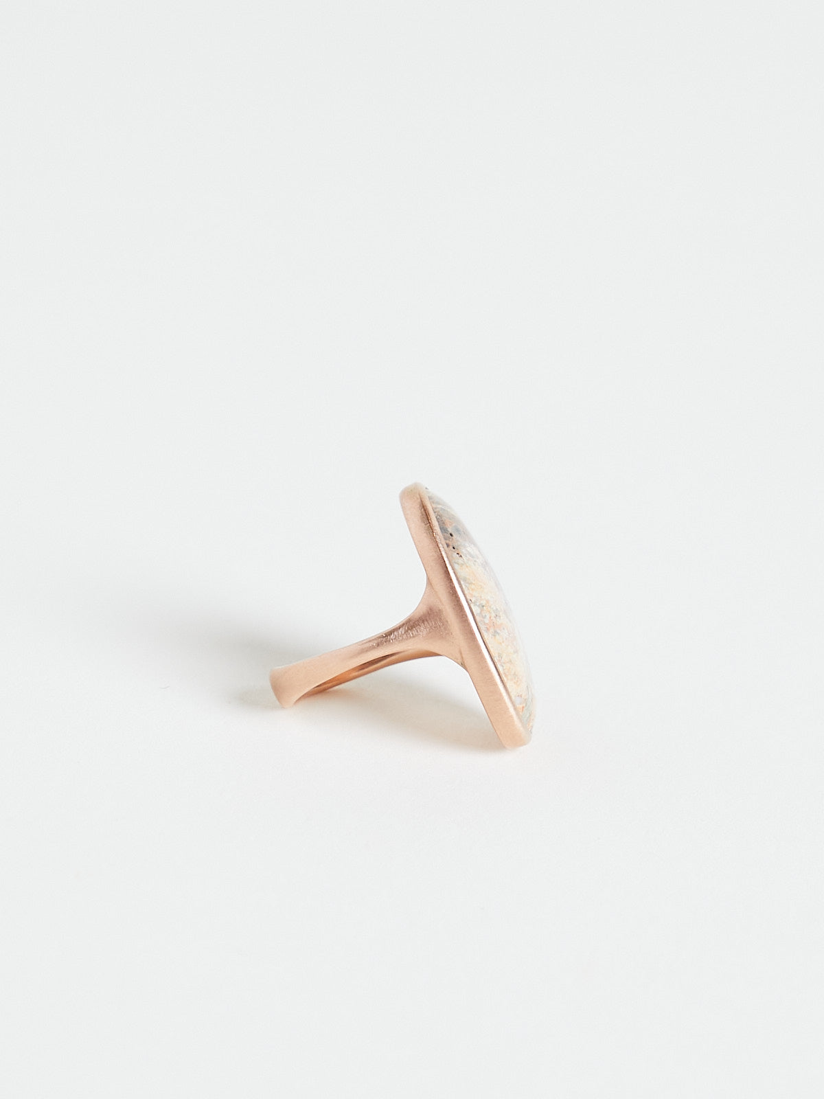 Ring in 9k rose gold with an oval 12.73ct bezel-set melange jasper cabochon.