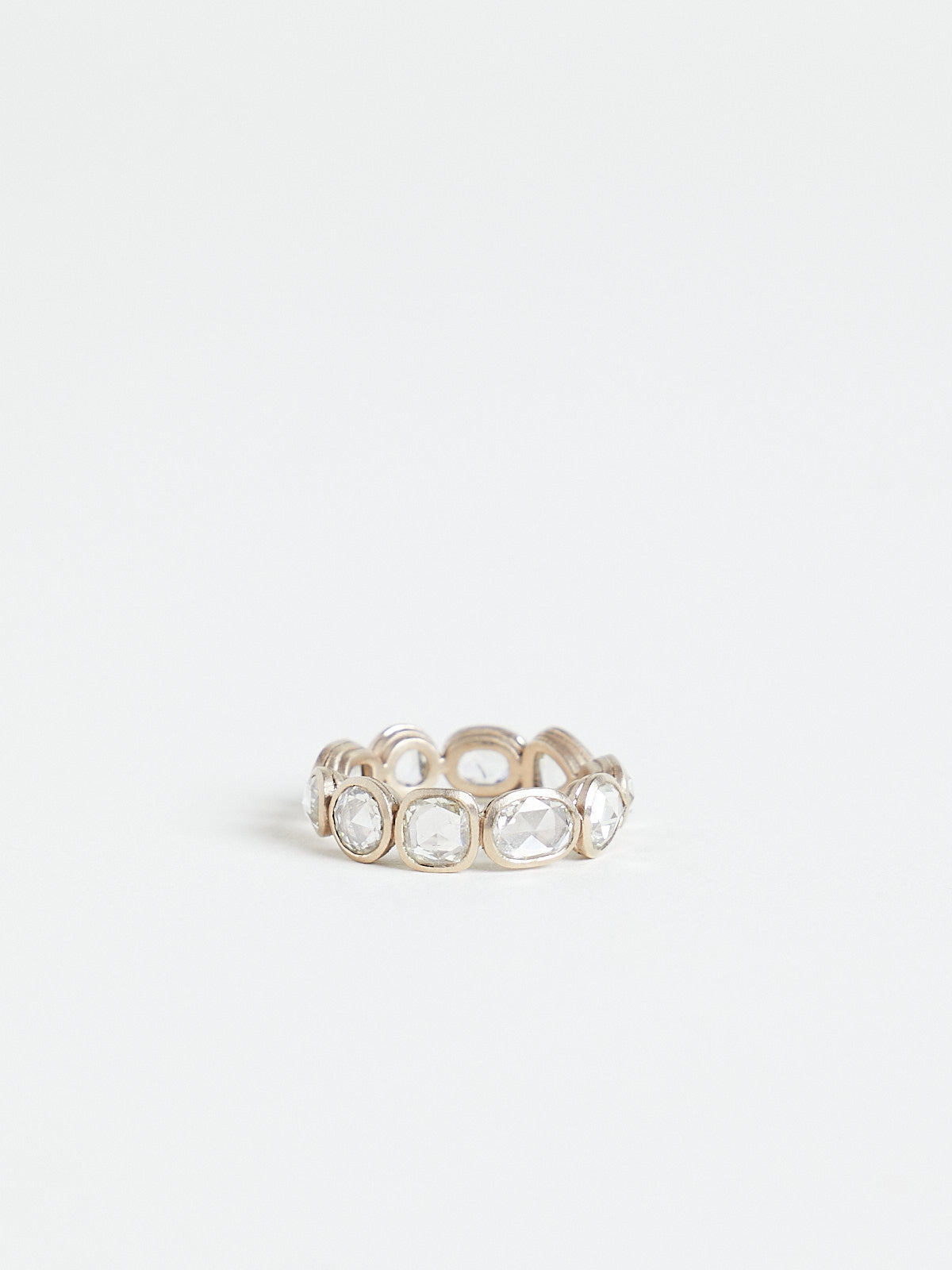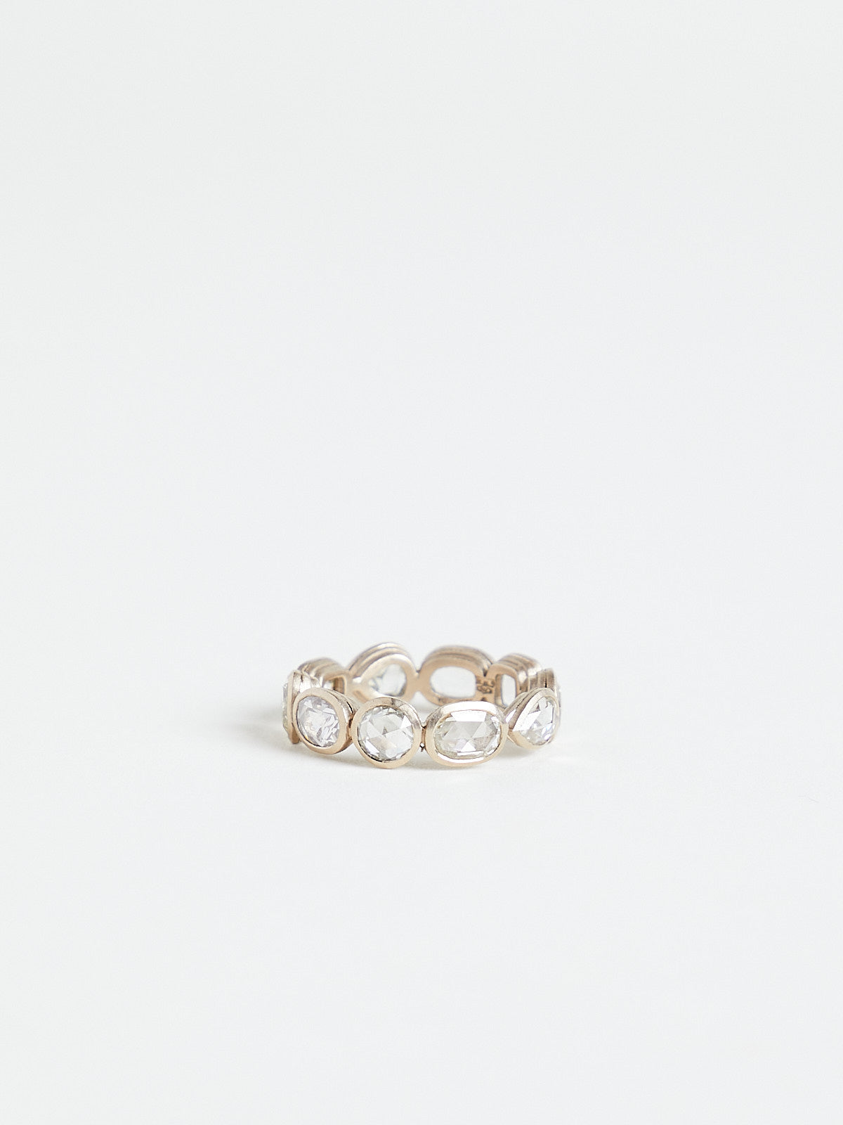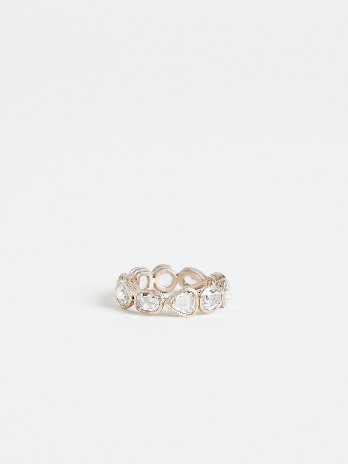 Eternity ring in 18k white gold/palladium with faceted bezel-set 4.52ct white diamonds in different shapes.