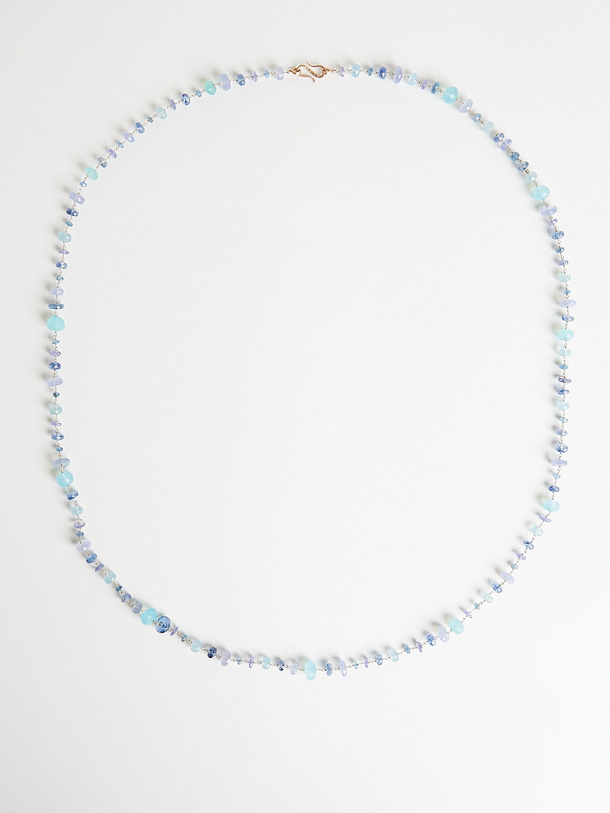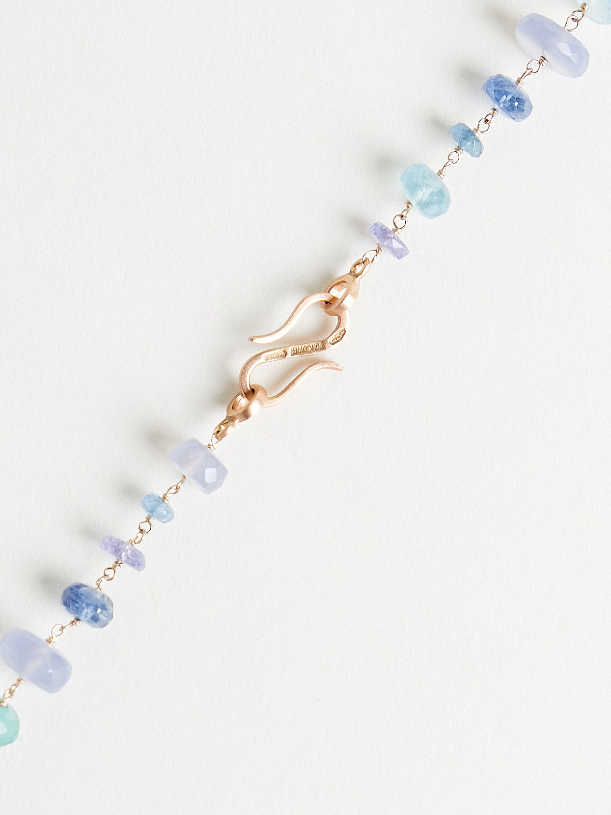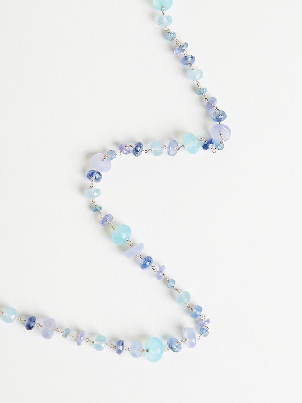 Rosary-style necklace in 18k white gold and aquamarine, kyanite, sea agate and chalcedony beads (115ct). Features a s hook clasp in 18k rose gold.