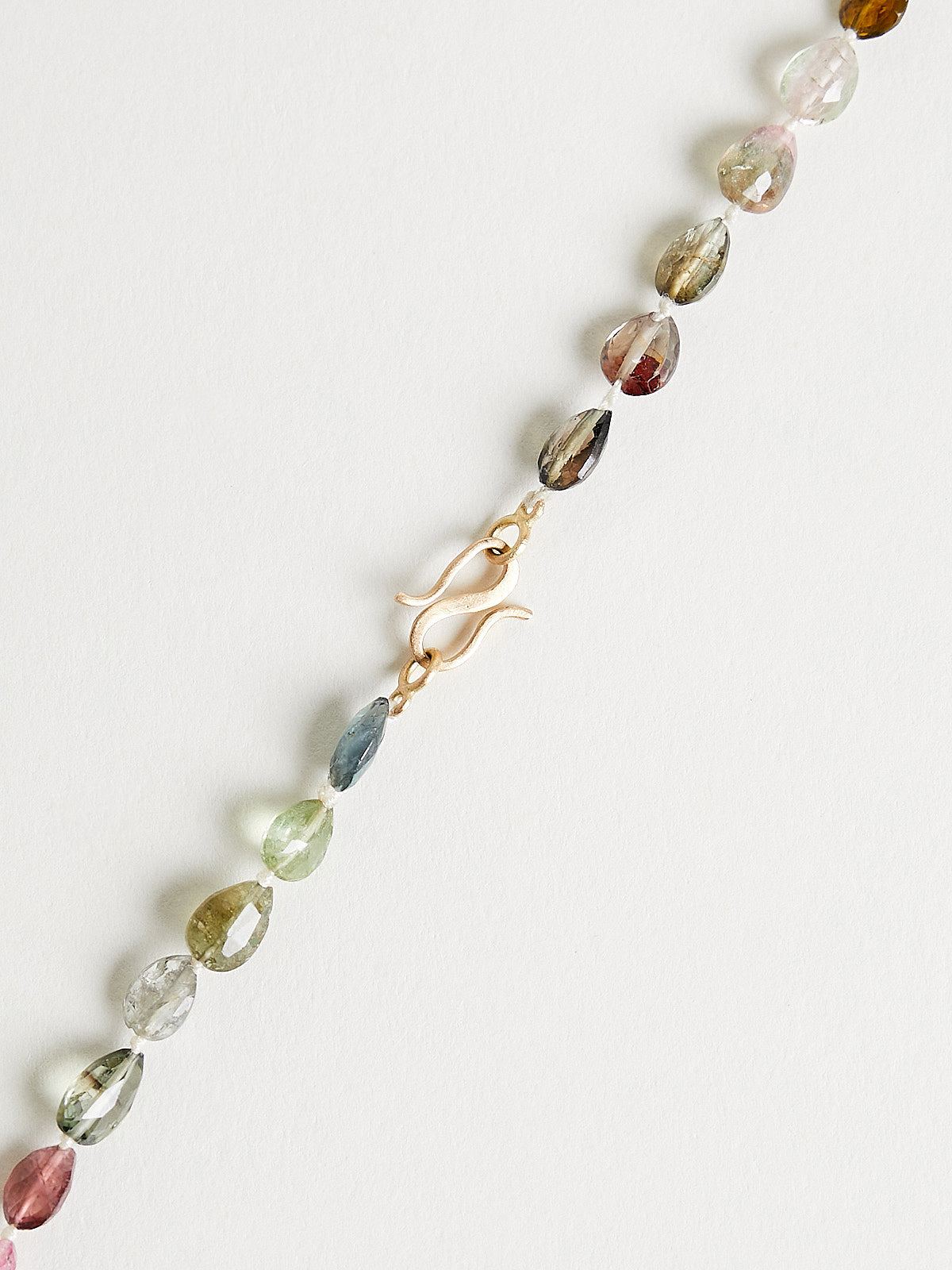 Long necklace with 133.13ct multicoloured tourmaline beads on a cotton wire. Features a s hook clasp in 18k yellow gold.