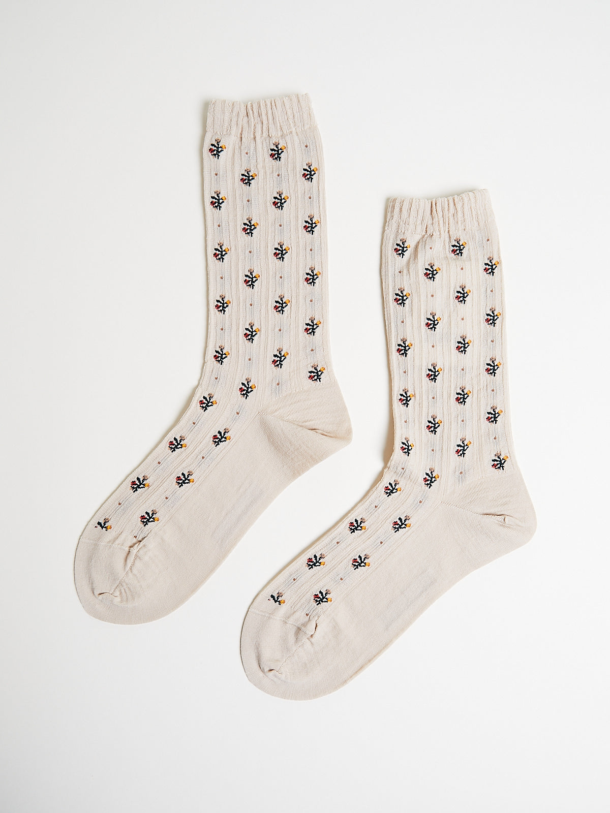 Crew socks in a light beige wool blend with a textured stripe base and a floral motif. Features a ruched cuff.