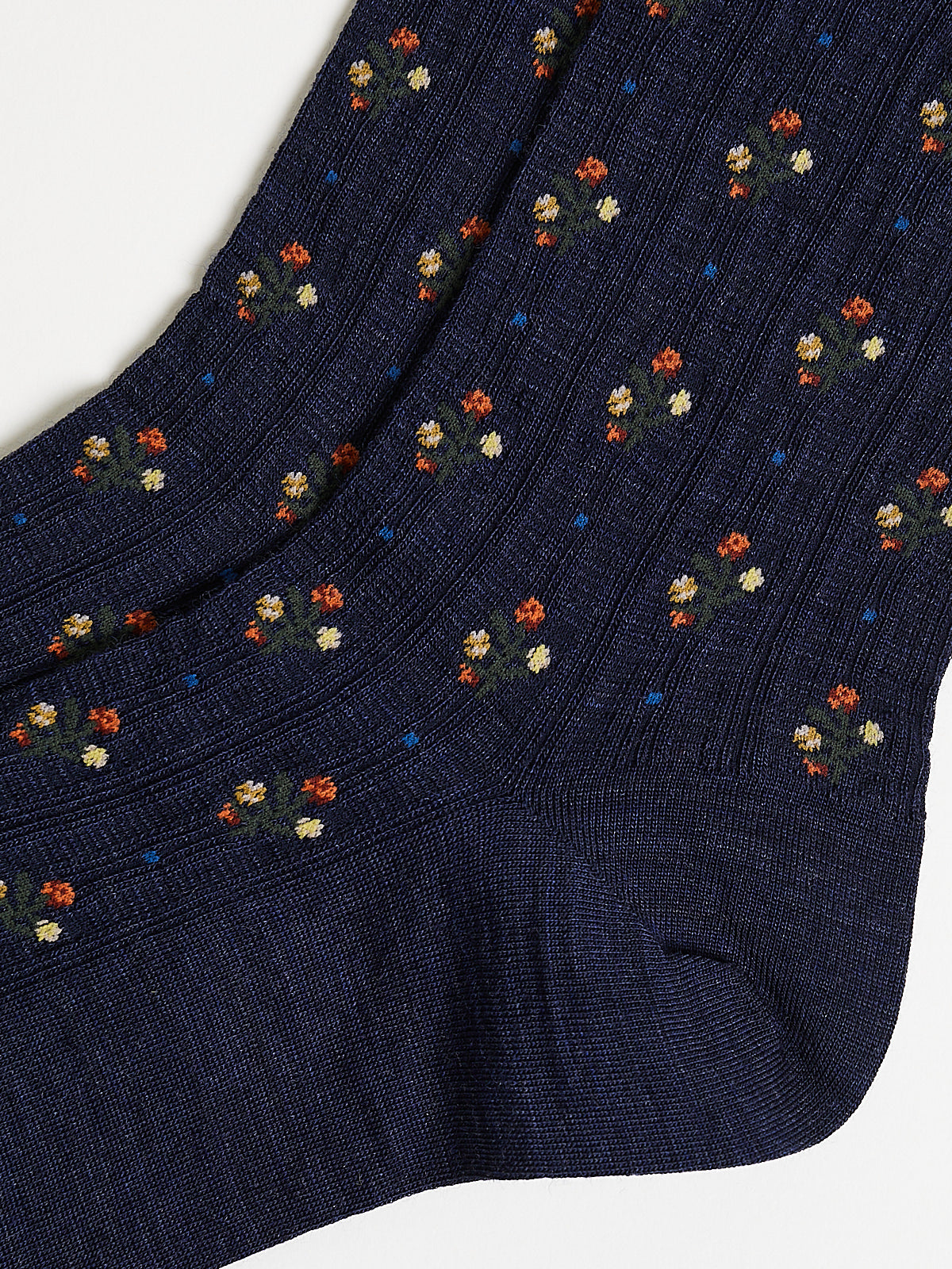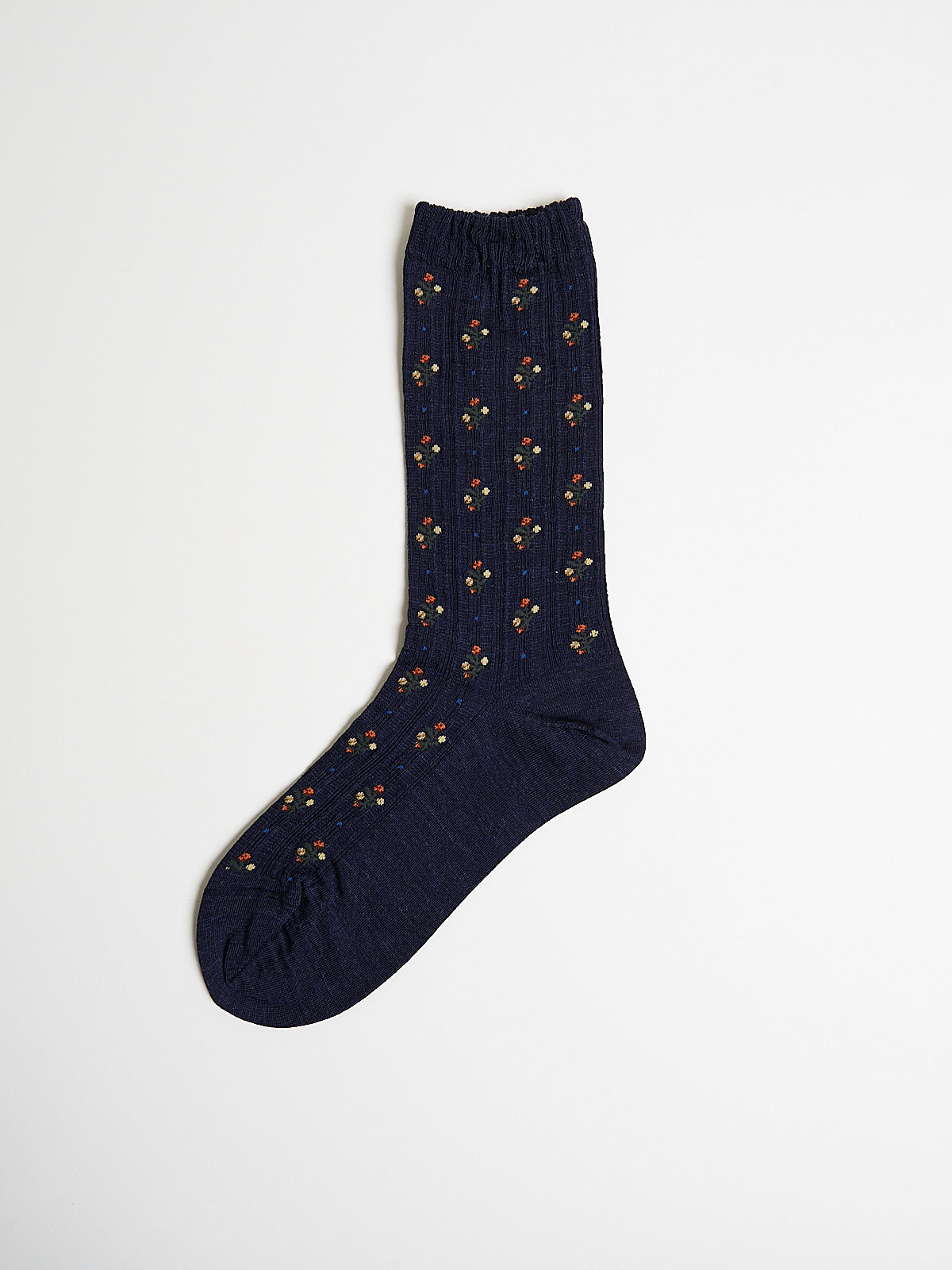 Crew socks in a navy wool blend with a textured stripe base and a floral motif. Features a ruched cuff.