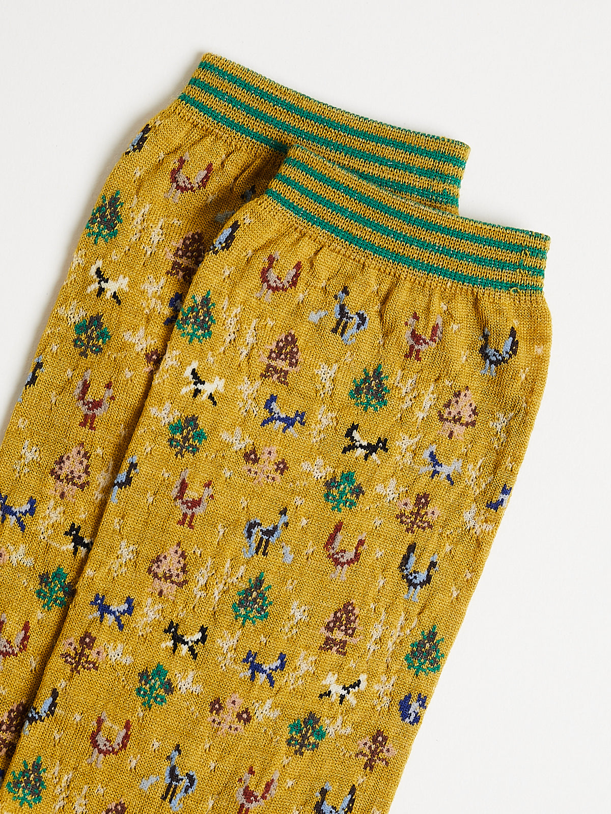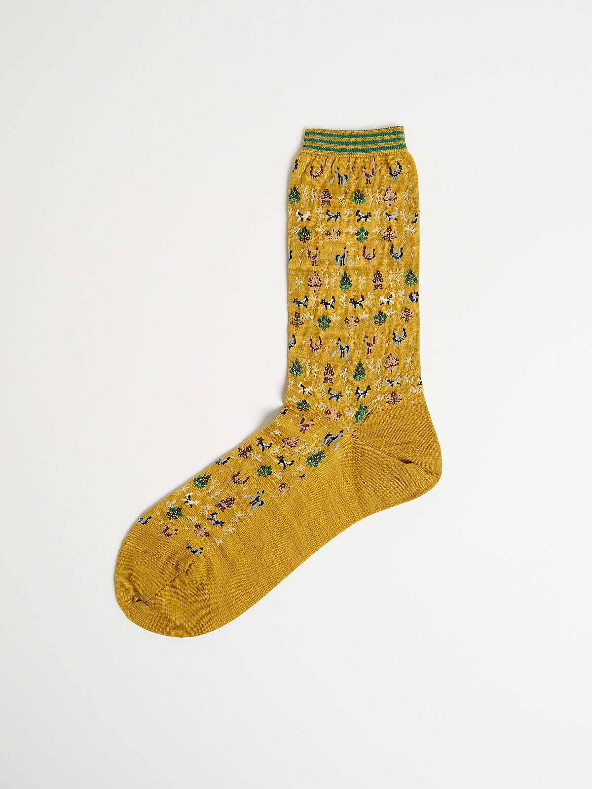 Crew socks in a mustard wool blend with a forest and animal motif. Features a striped cuff.