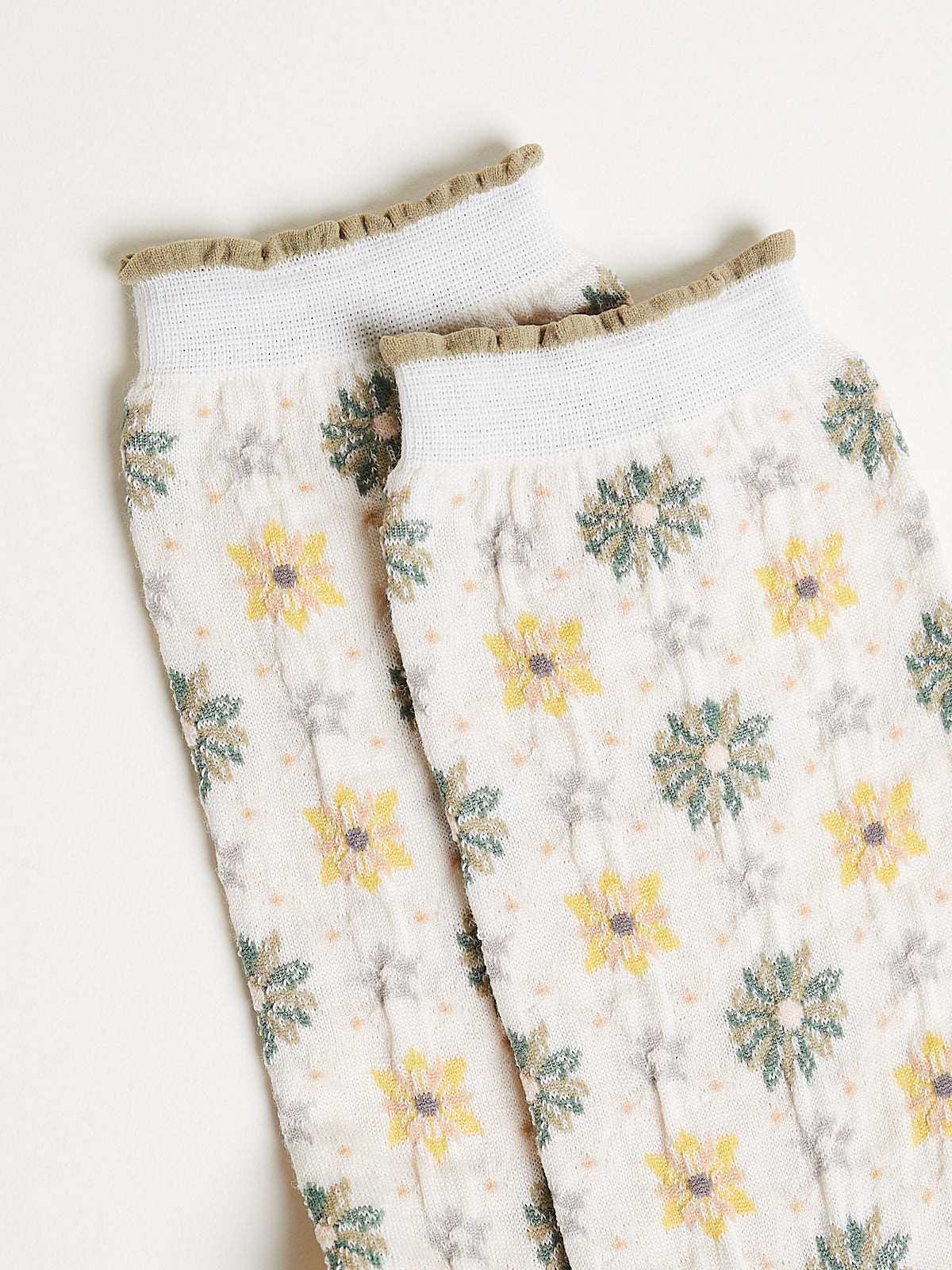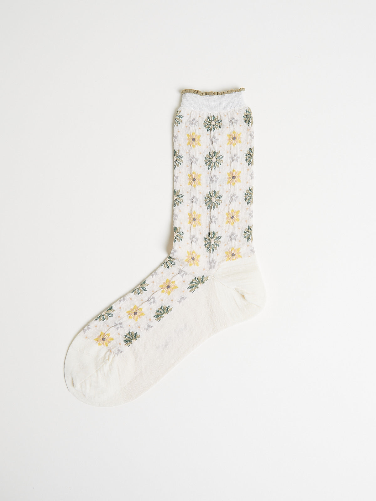 Crew socks in an ivory wool blend with a kaleidoscope motif. Features a ruched cuff.