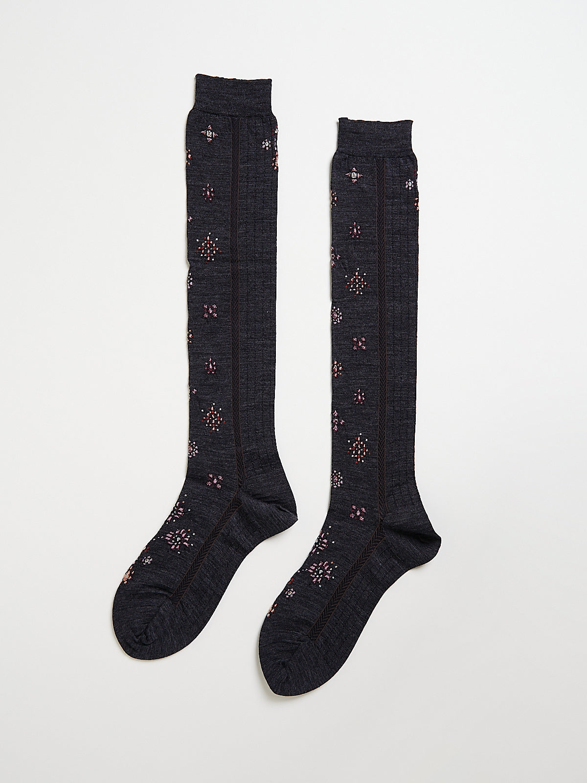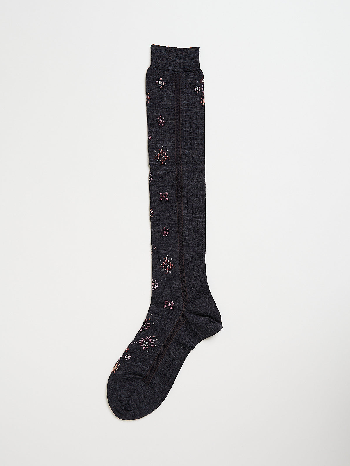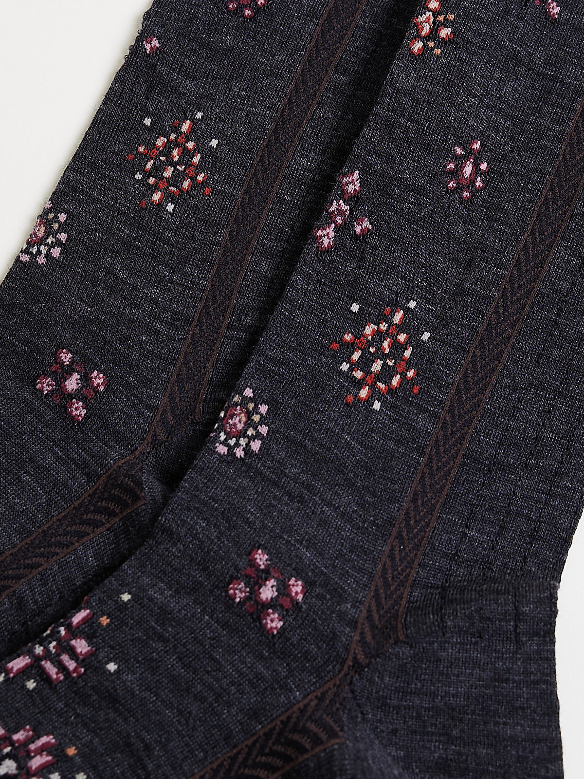 Knee-high socks in a charcoal grey wool blend with a multicoloured gemstone-inspired motif and a herringbone stripe on the side. Features a fine-rib cuff.