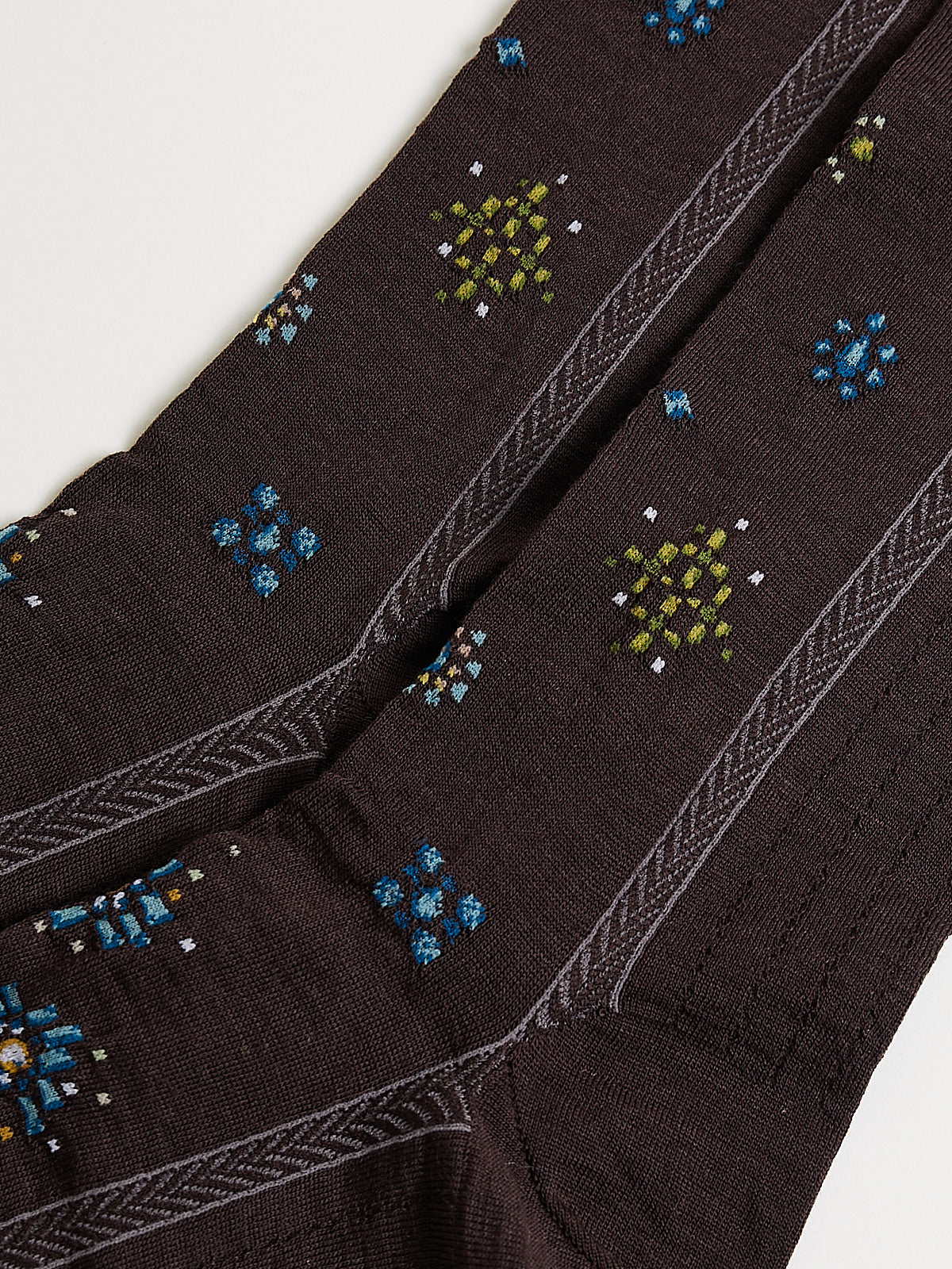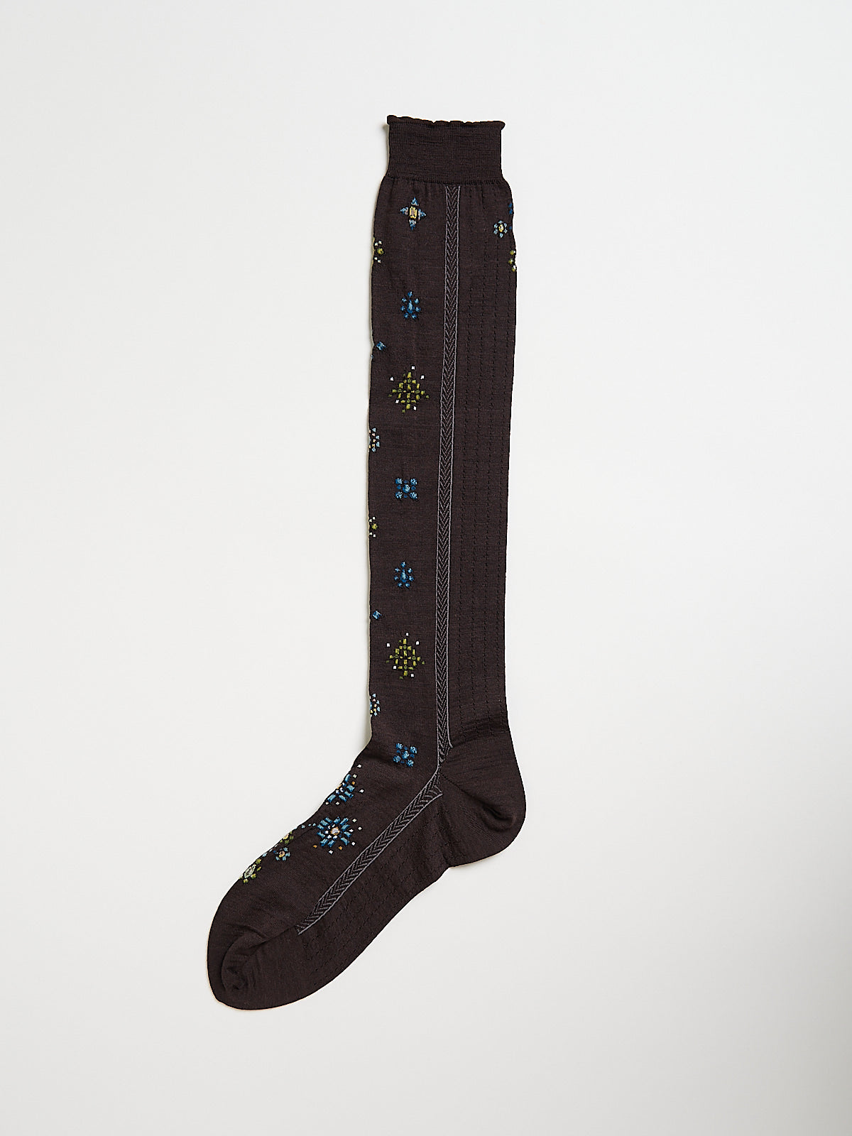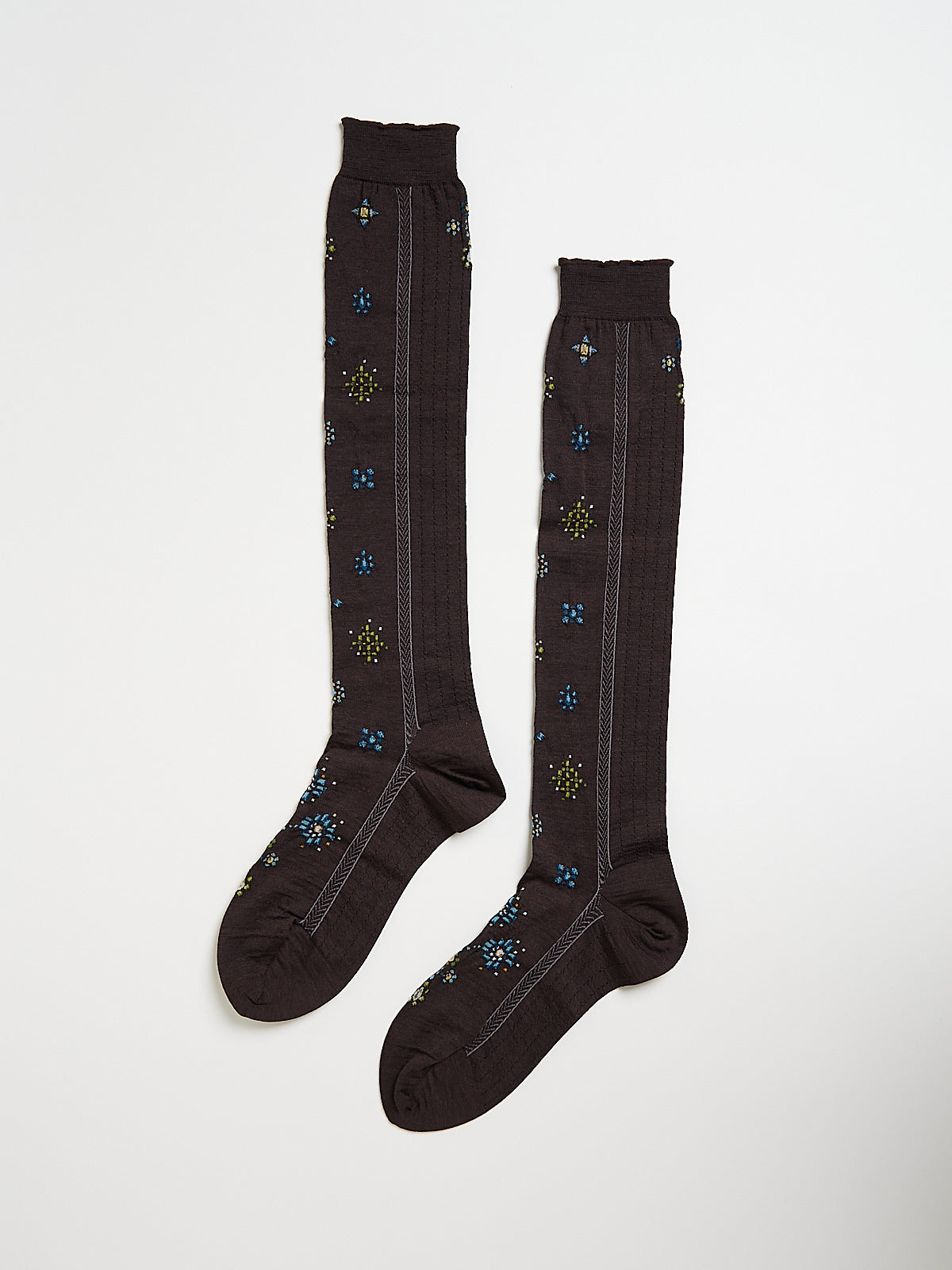 Knee-high socks in a dark brown wool blend with a multicoloured gemstone-inspired motif and a herringbone stripe on the side. Features a fine-rib cuff.