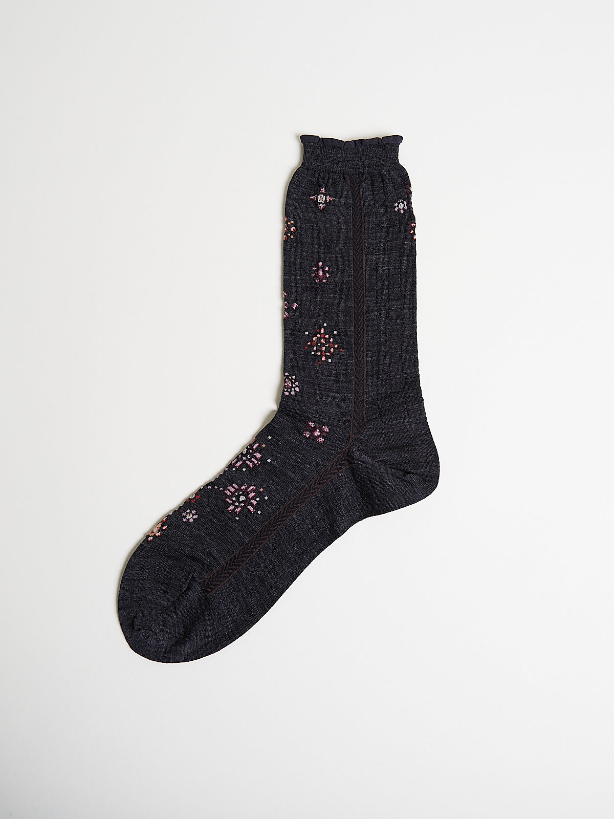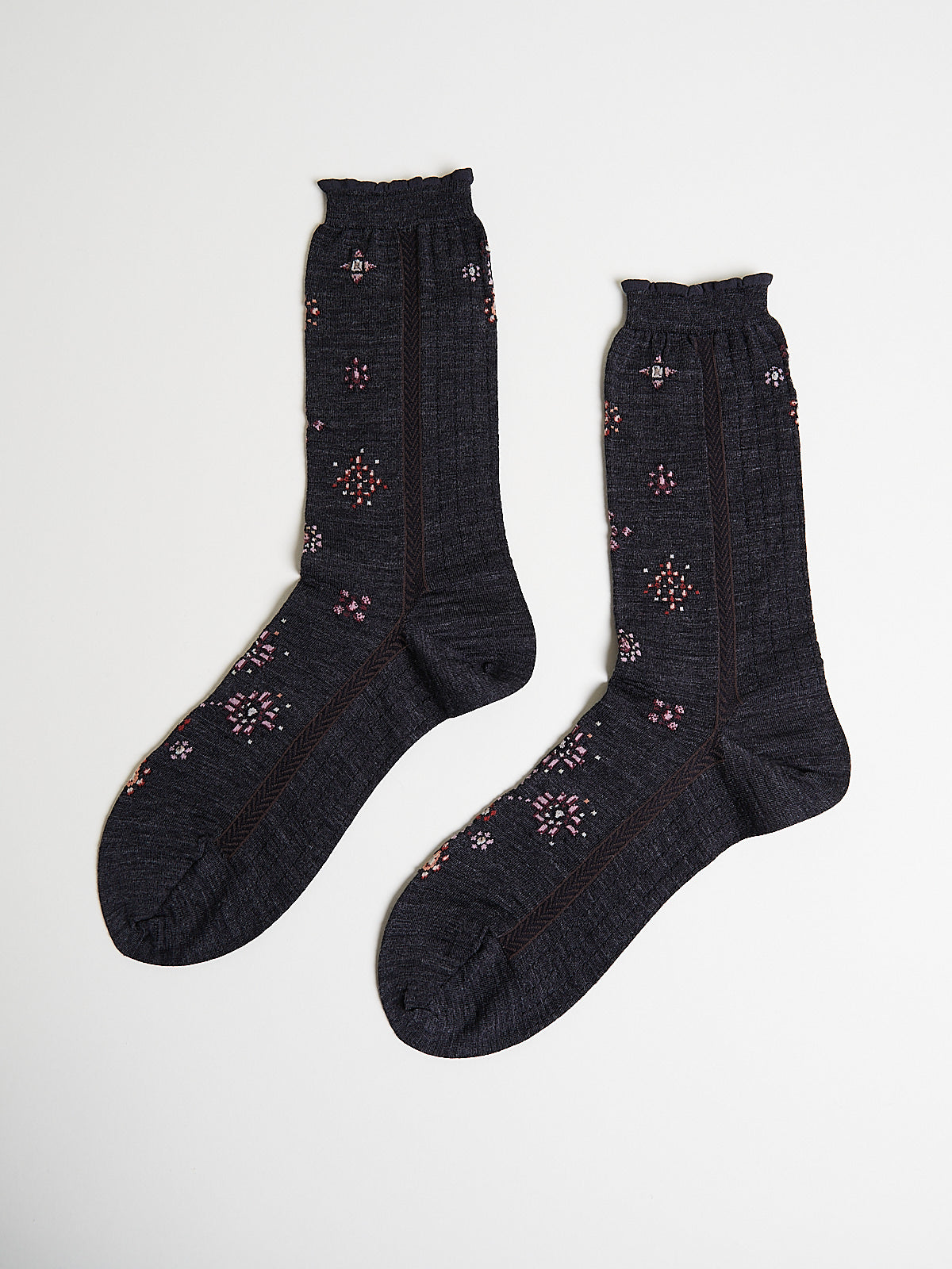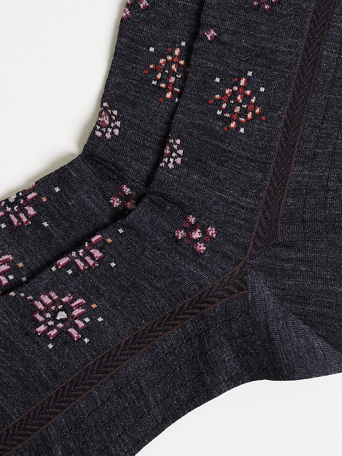 Crew socks in a charcoal grey wool blend with a multicoloured gemstone-inspired motif and a herringbone stripe on the side. Features a ruched cuff.