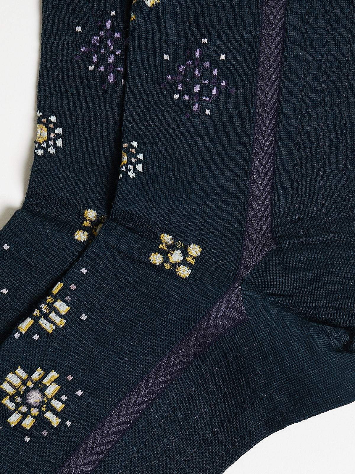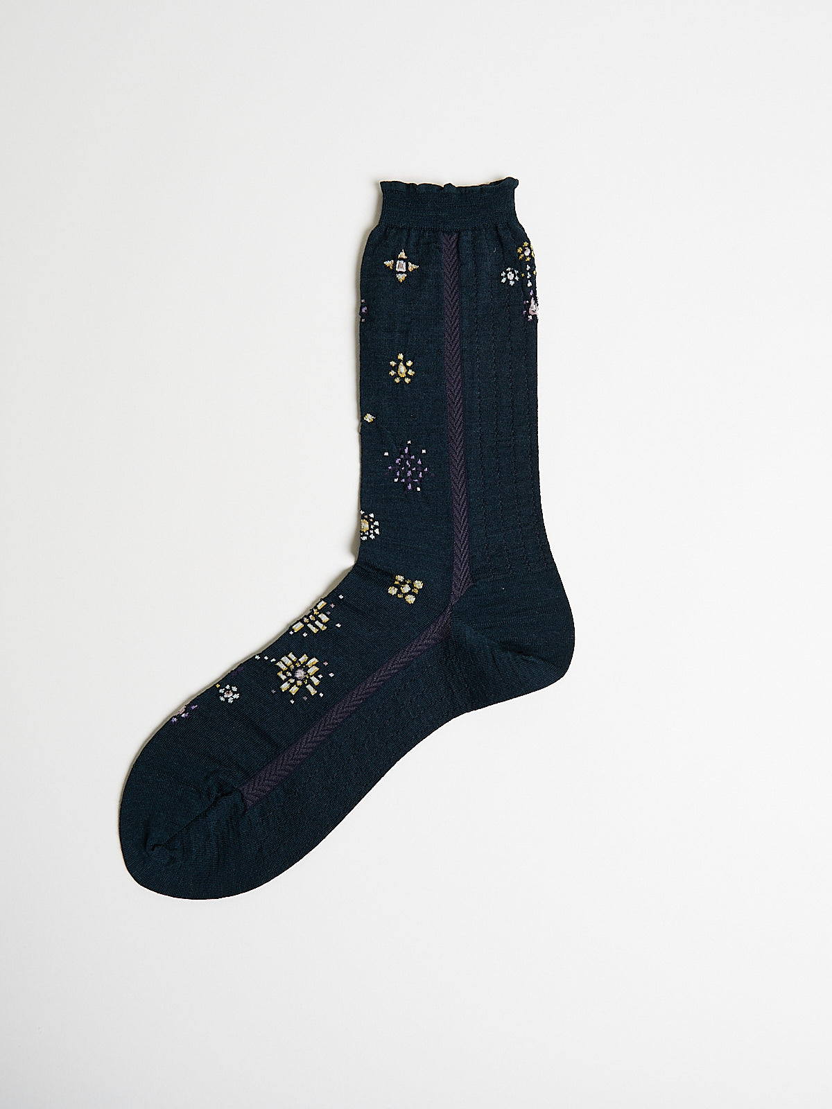 Crew socks in a dark green wool blend with a multicoloured gemstone-inspired motif and a herringbone stripe on the side. Features a ruched cuff.
