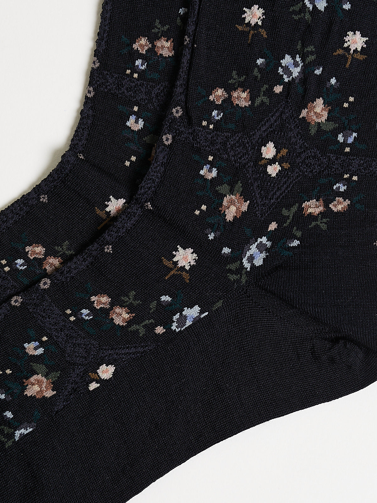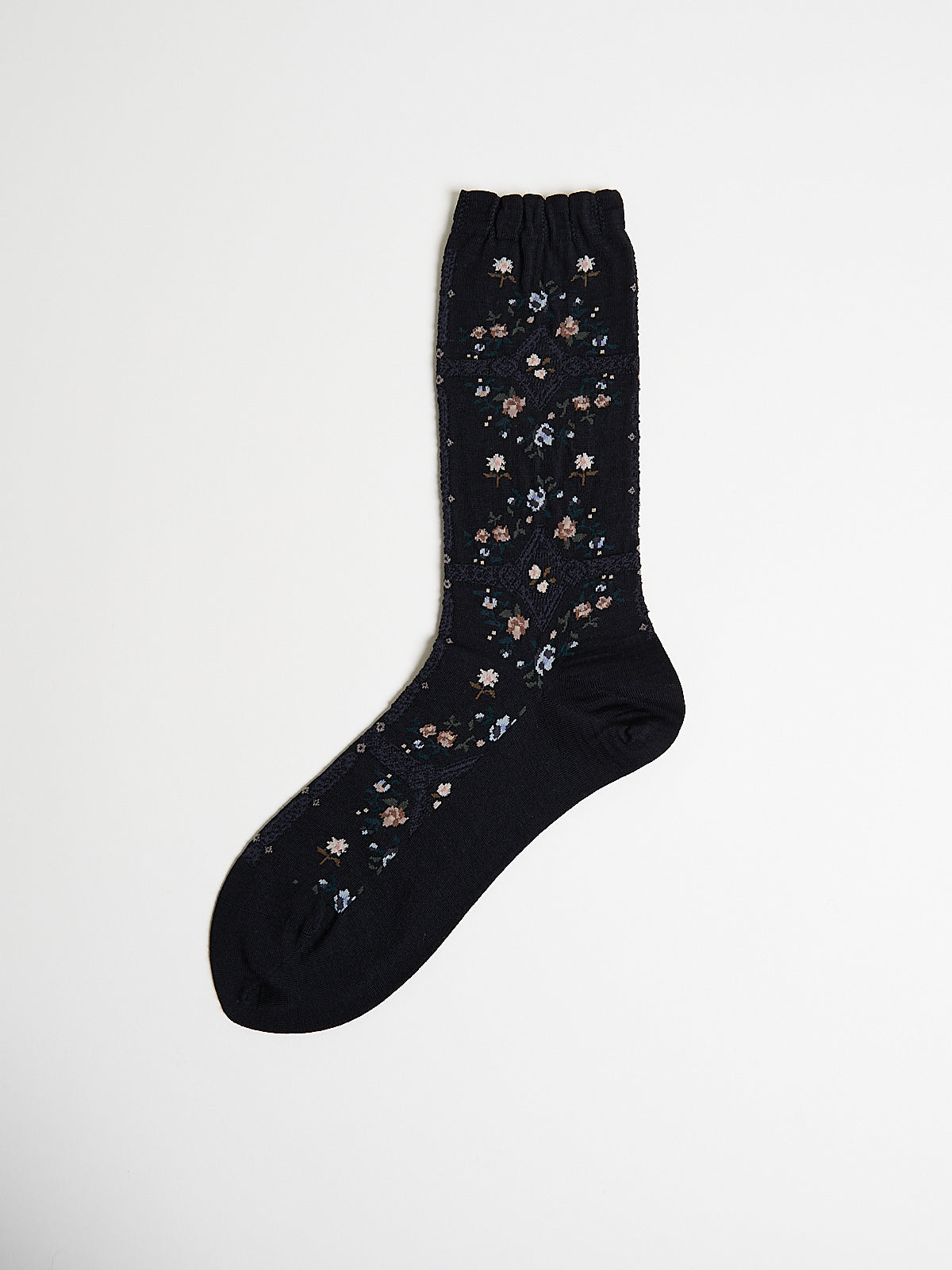 Crew socks in a black wool blend with a rose motif. Features a ruched cuff.