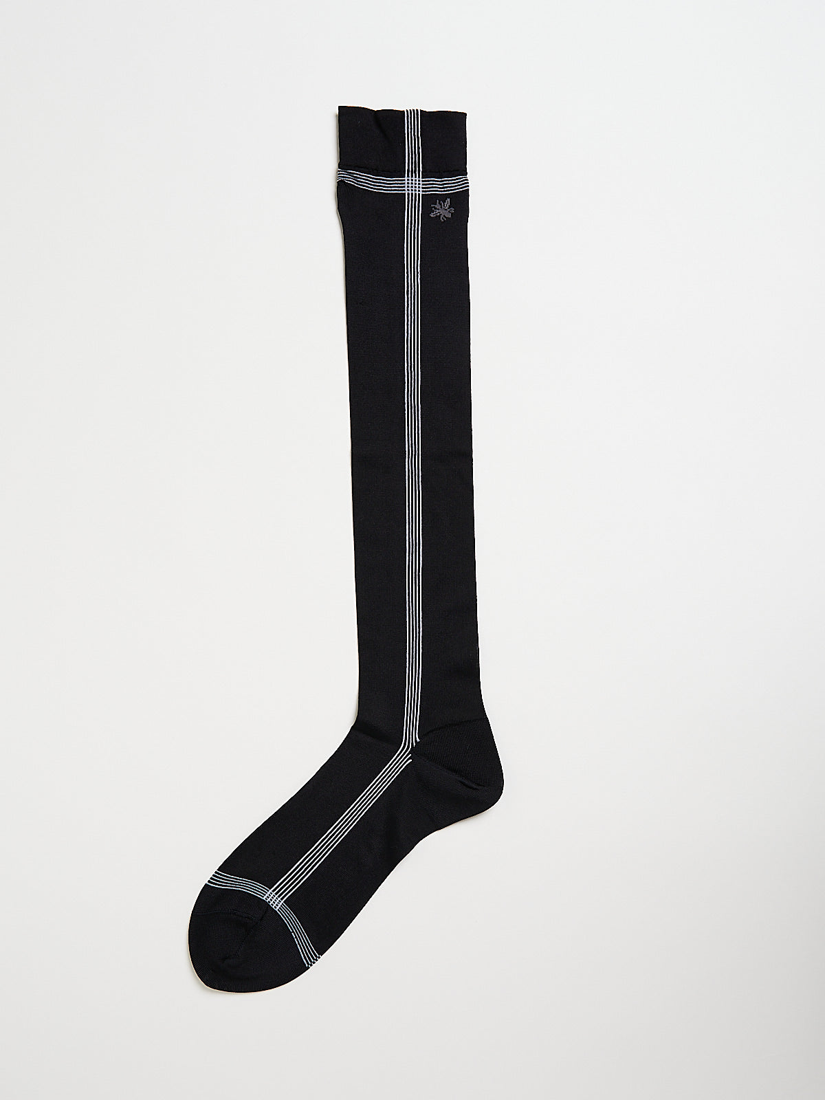 Knee-high socks in a black silk blend with a slight sheen. Features a stripe design and Antipast's signature bee motif on the leg.