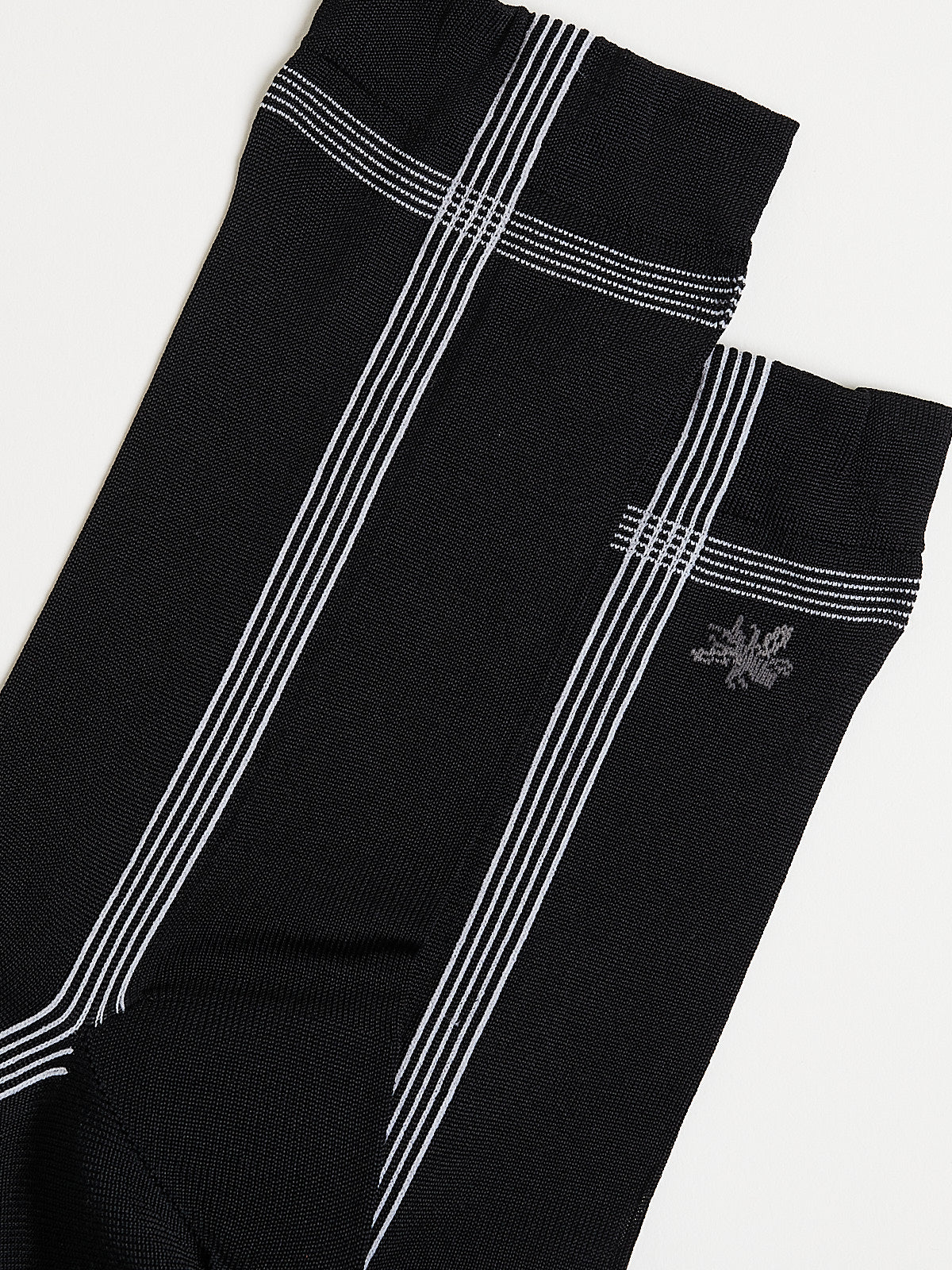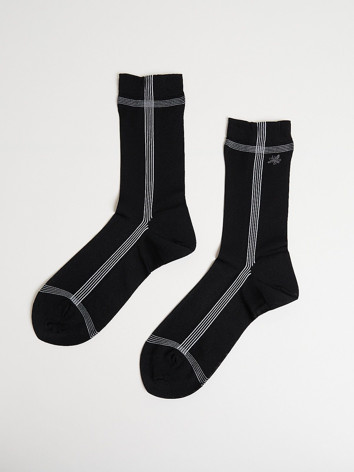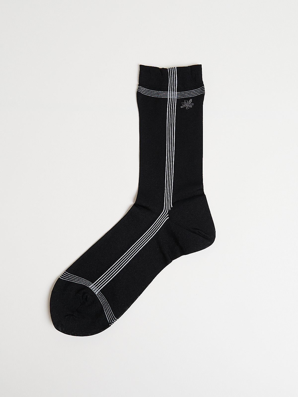 Crew socks in a black silk blend with a slight sheen. Features a stripe design and Antipast's signature bee motif on the leg.