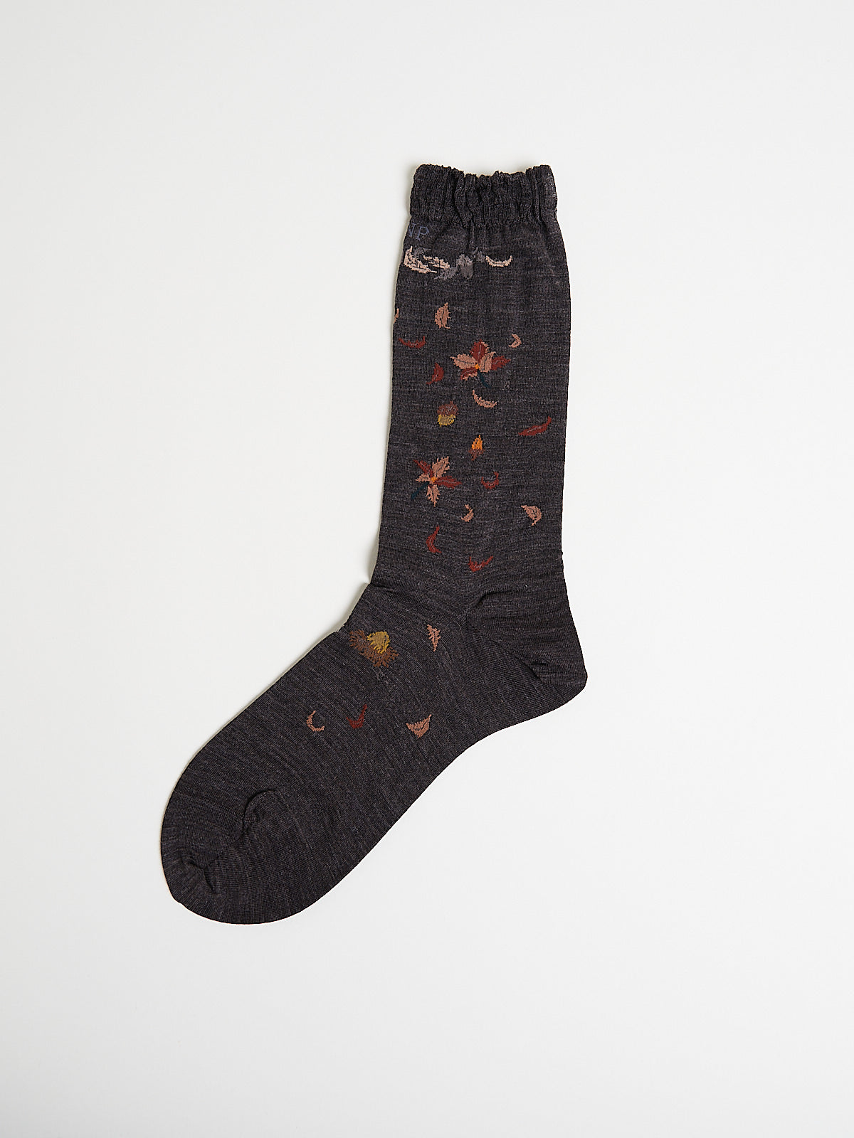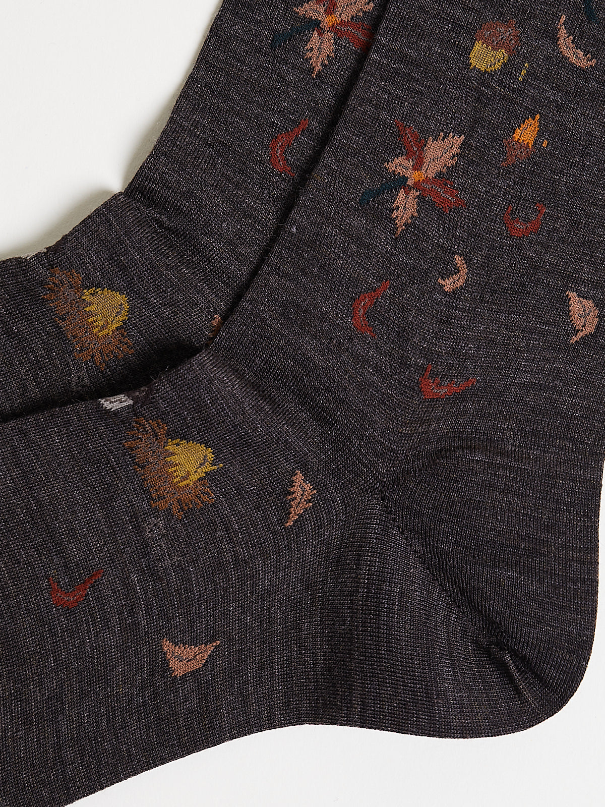 Crew socks in a dark brown wool blend with a windy acorn tree motif. Features a ruched cuff.