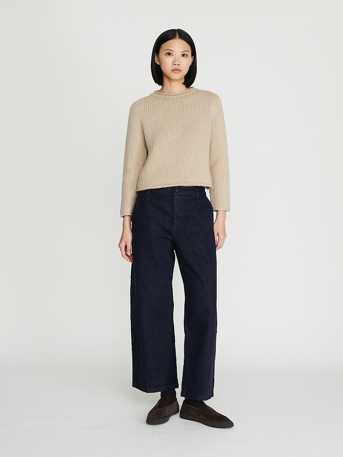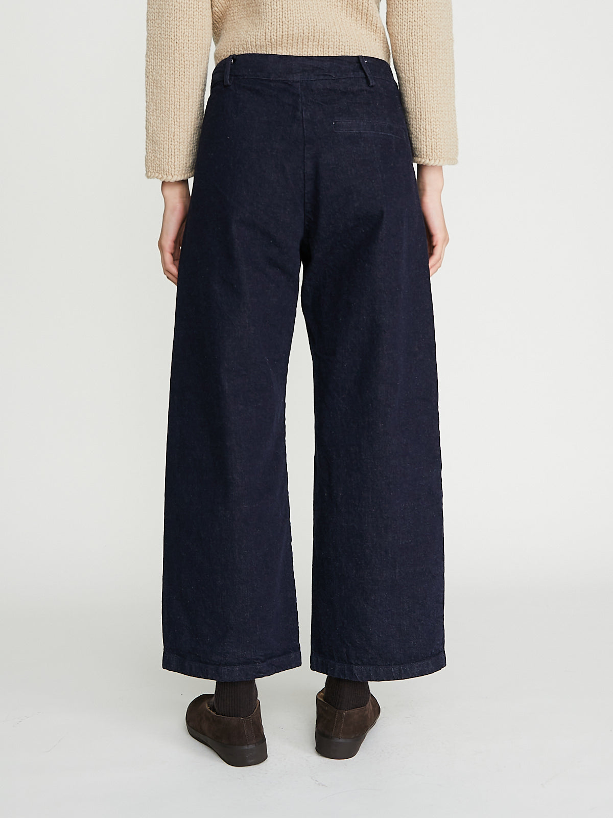 Wide-leg trouser in Japanese indigo cotton denim. Belt loops, single button and zip fly fastening. Slash pockets on the front and one welted pocket on the back. Barrel leg.