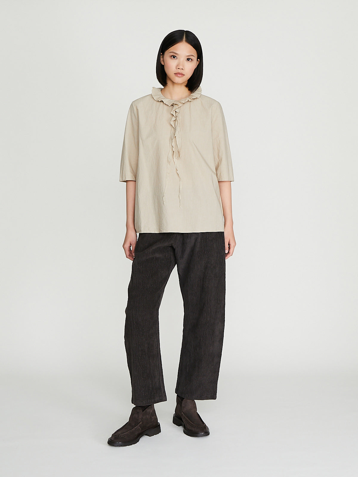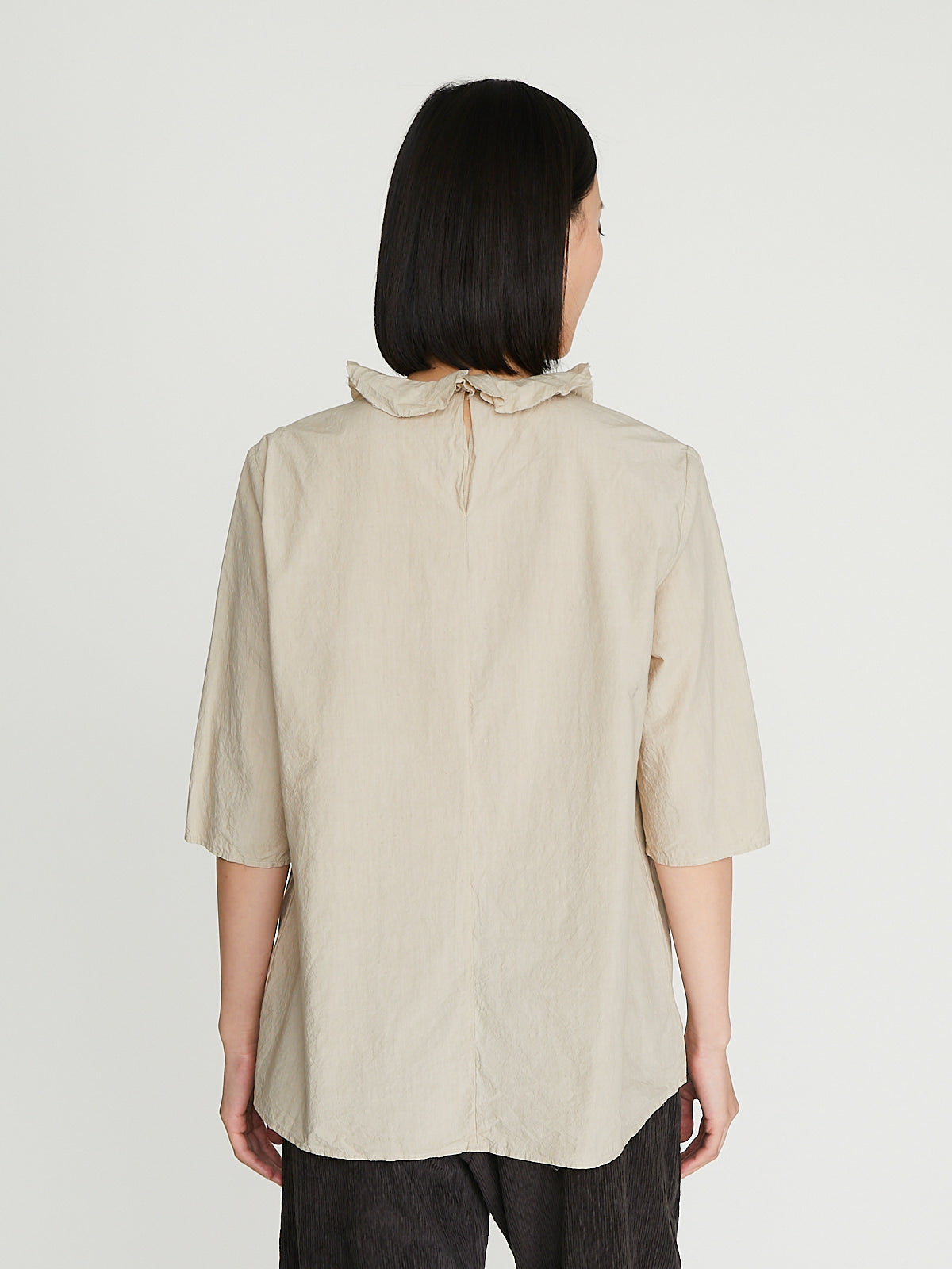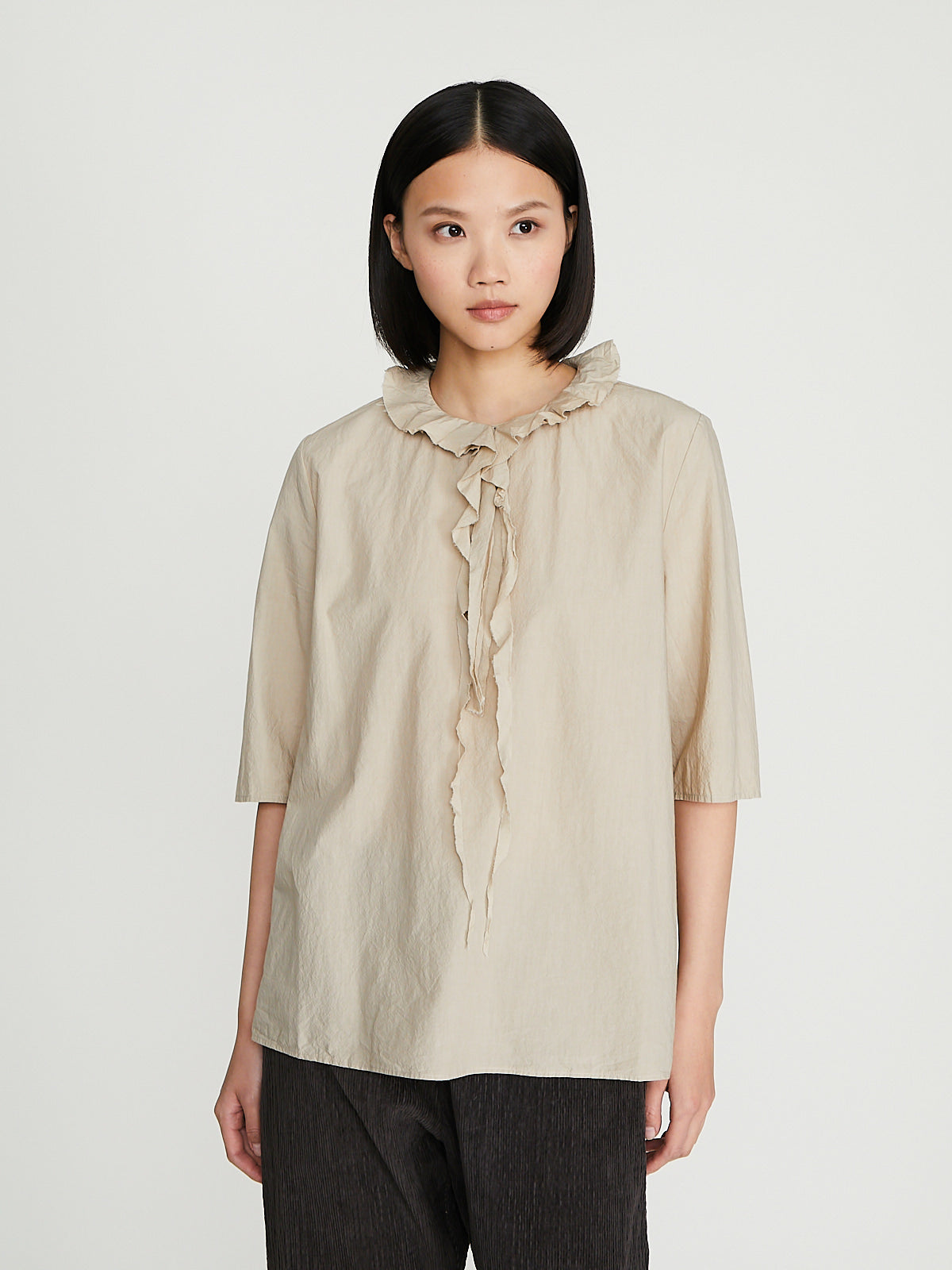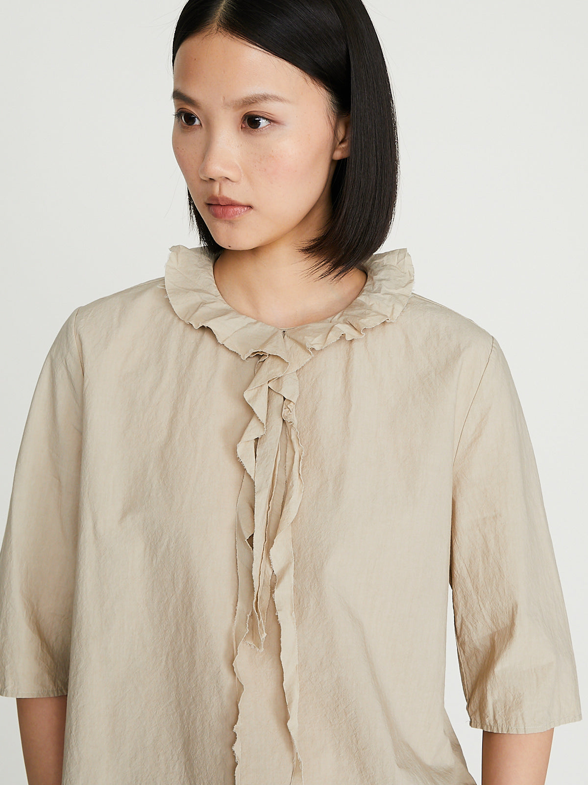 Relaxed short sleeve shirt in beige cotton poplin. Ruffled collar with a tie detail at the neck and a button fastening at the back. Boxy fit.