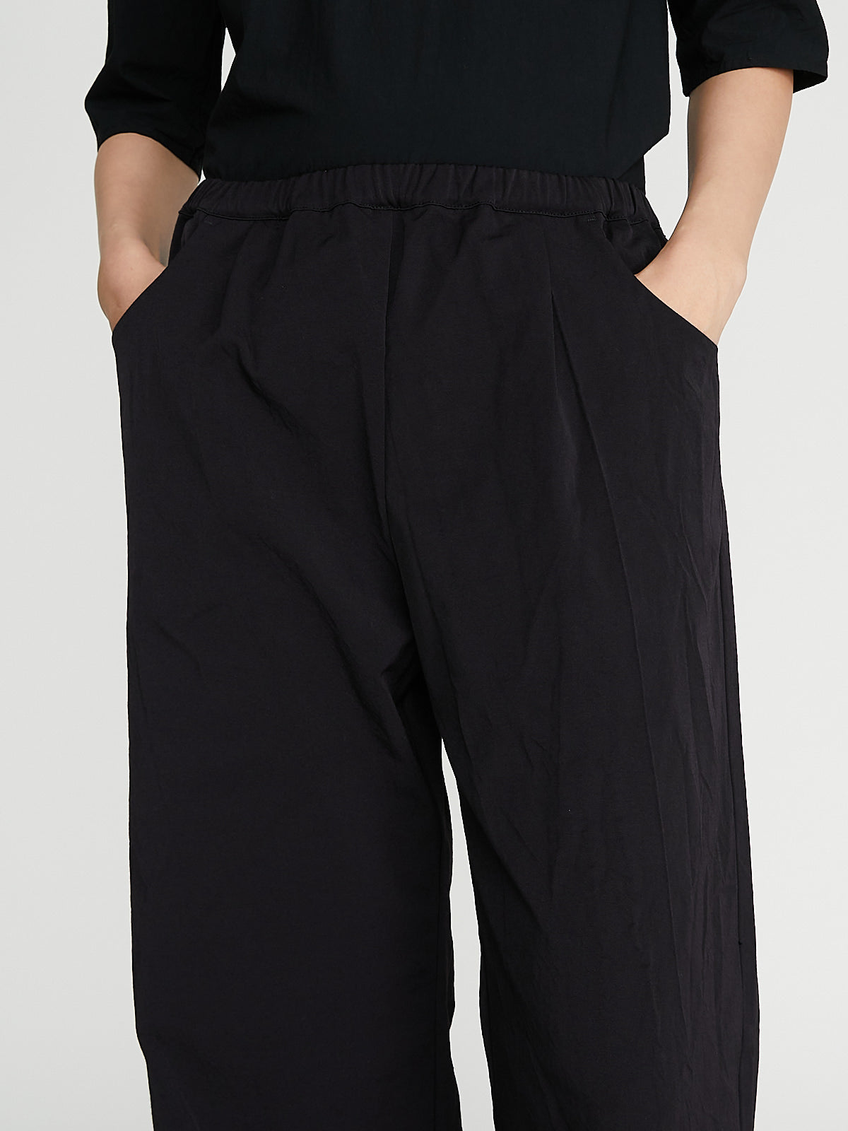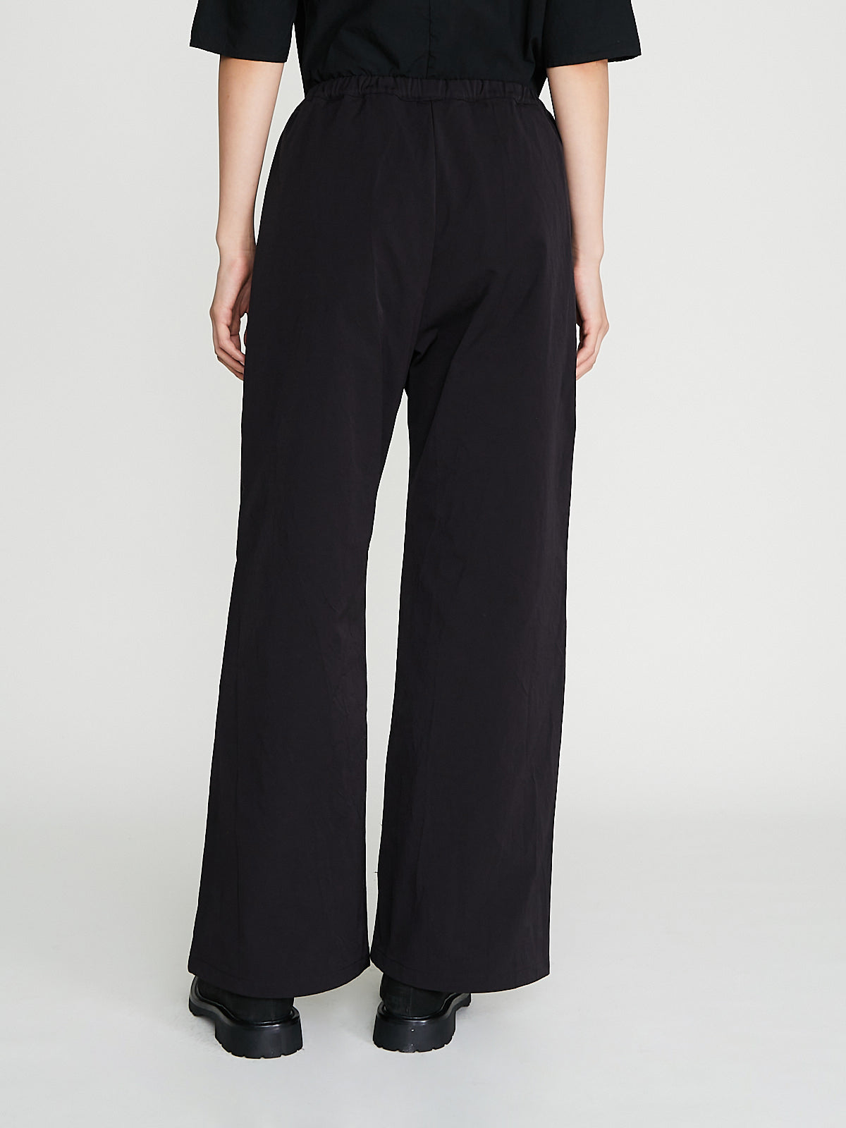 Regular trouser in brown technical cotton blend gabardine. Pull-on style with an elasticated waistband and scoop pockets on the front. Pin-tuck pleats on the front. Wide legs with a subtle flare.
