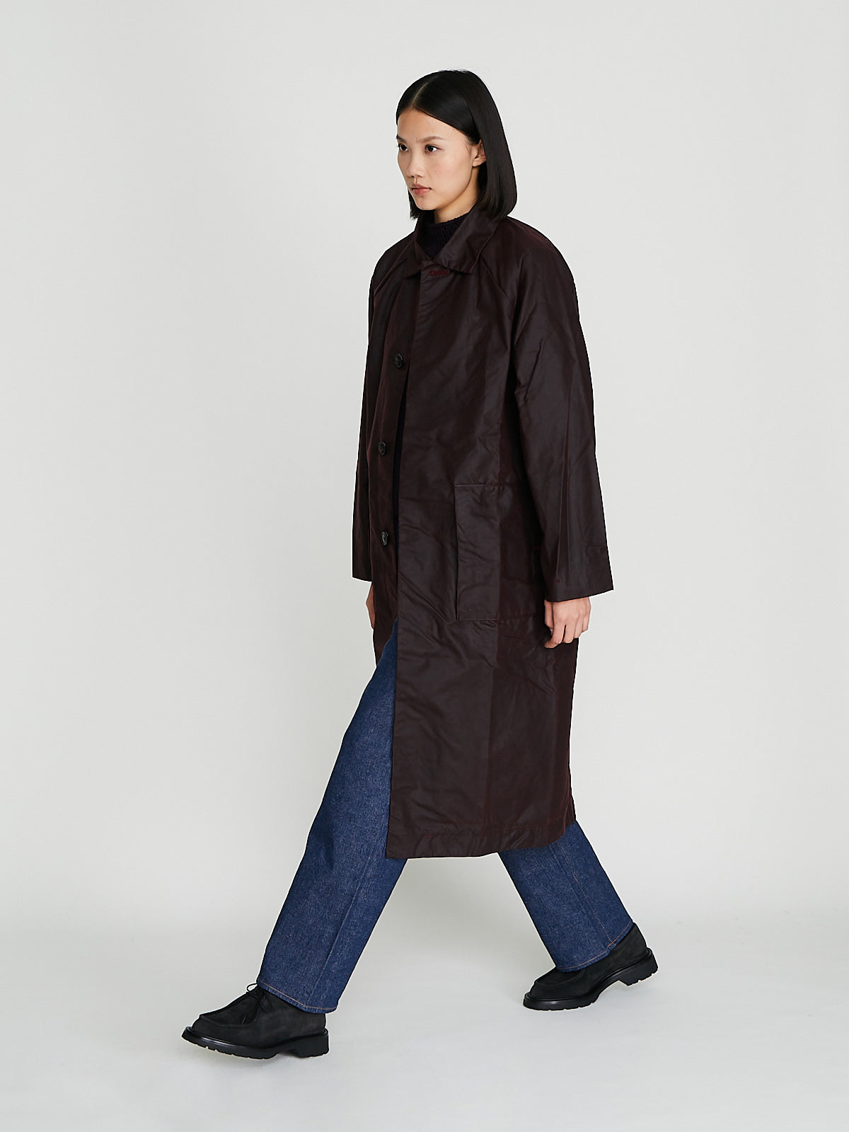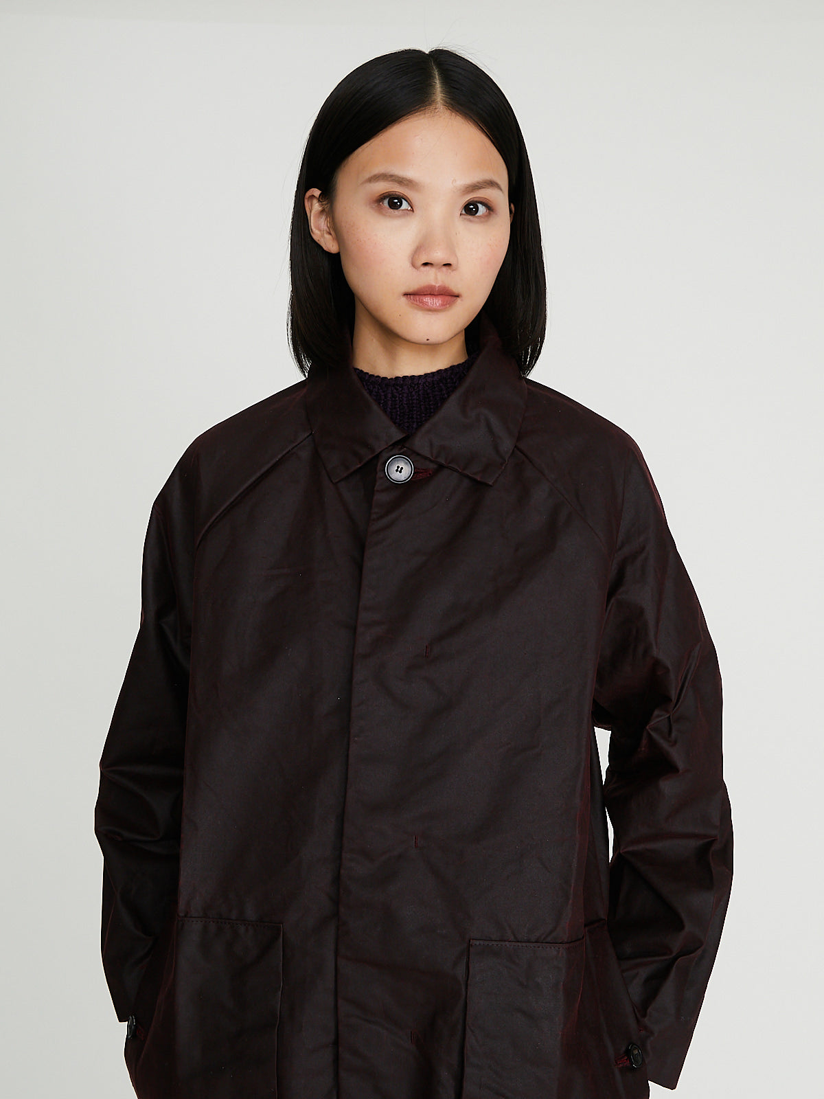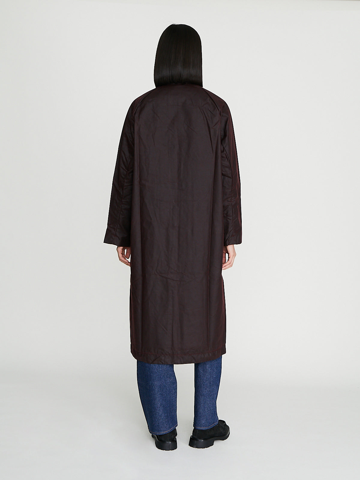 Unisex coat crafted from burgundy waxed BCI cotton from Scotland, by Halley Stevensons. This cotton has been treated with biodegradable oil, and is both water-repellent and breathable. With regular use, it will develop a unique patina, adding character to the garment over time.