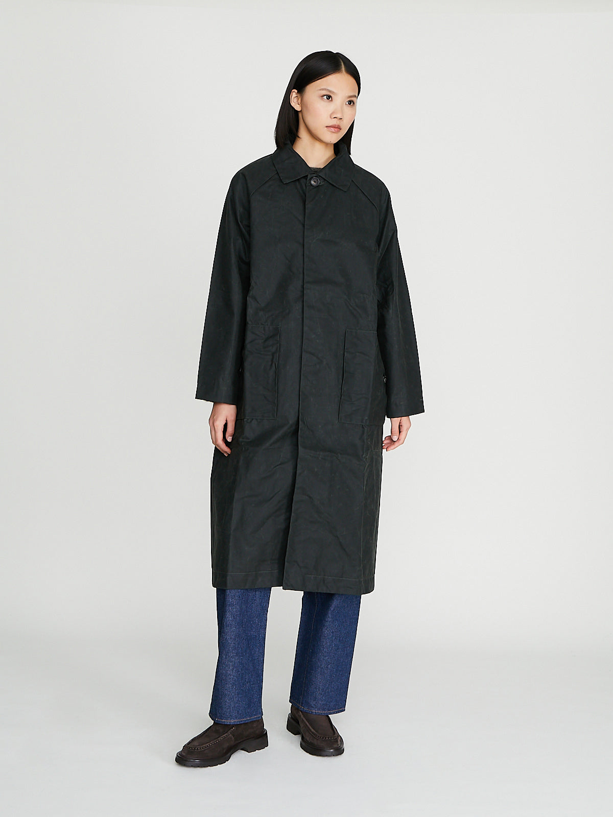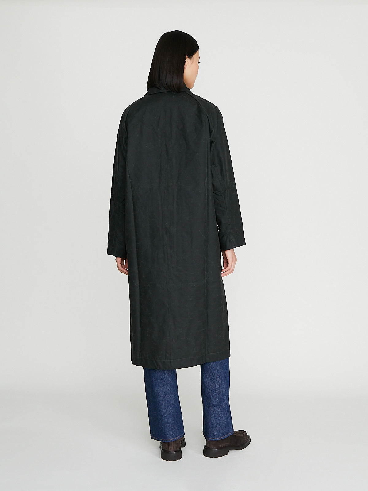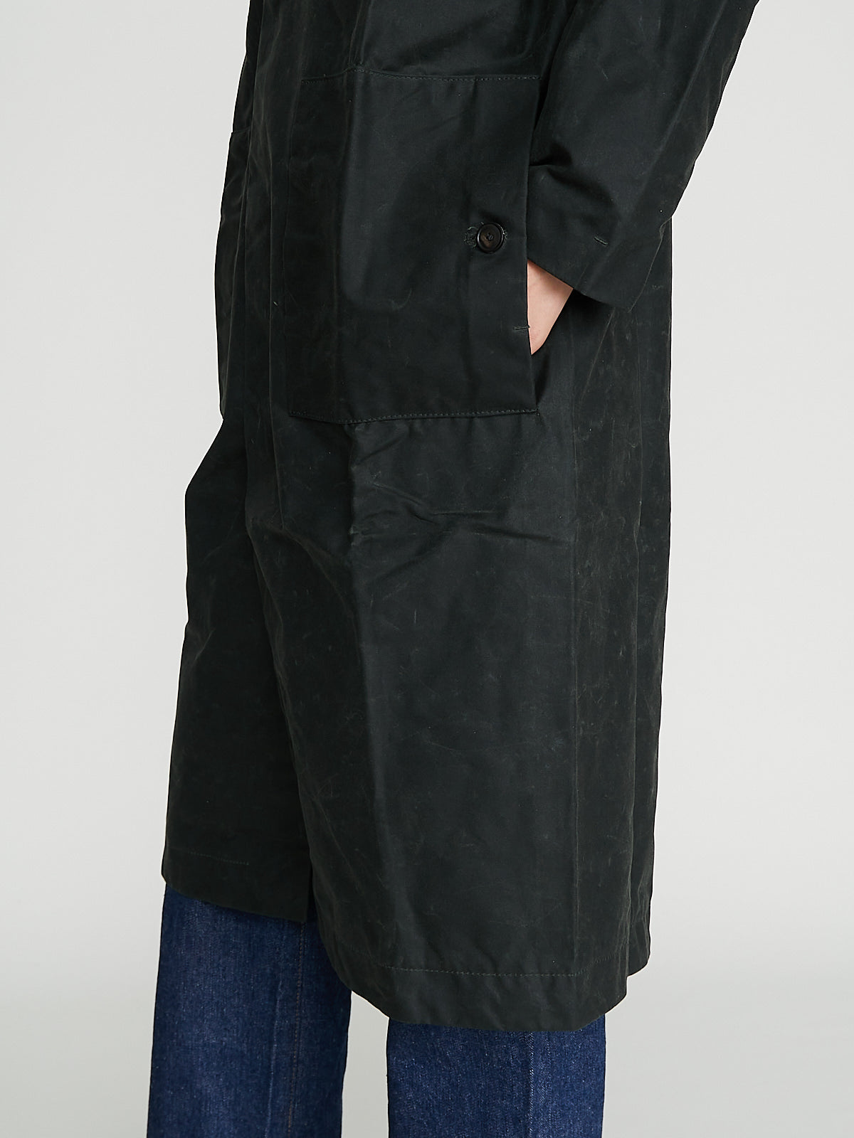 Unisex coat crafted from dark green waxed BCI cotton from Scotland, by Halley Stevensons. This cotton has been treated with biodegradable oil, and is both water-repellent and breathable. With regular use, it will develop a unique patina, adding character to the garment over time.