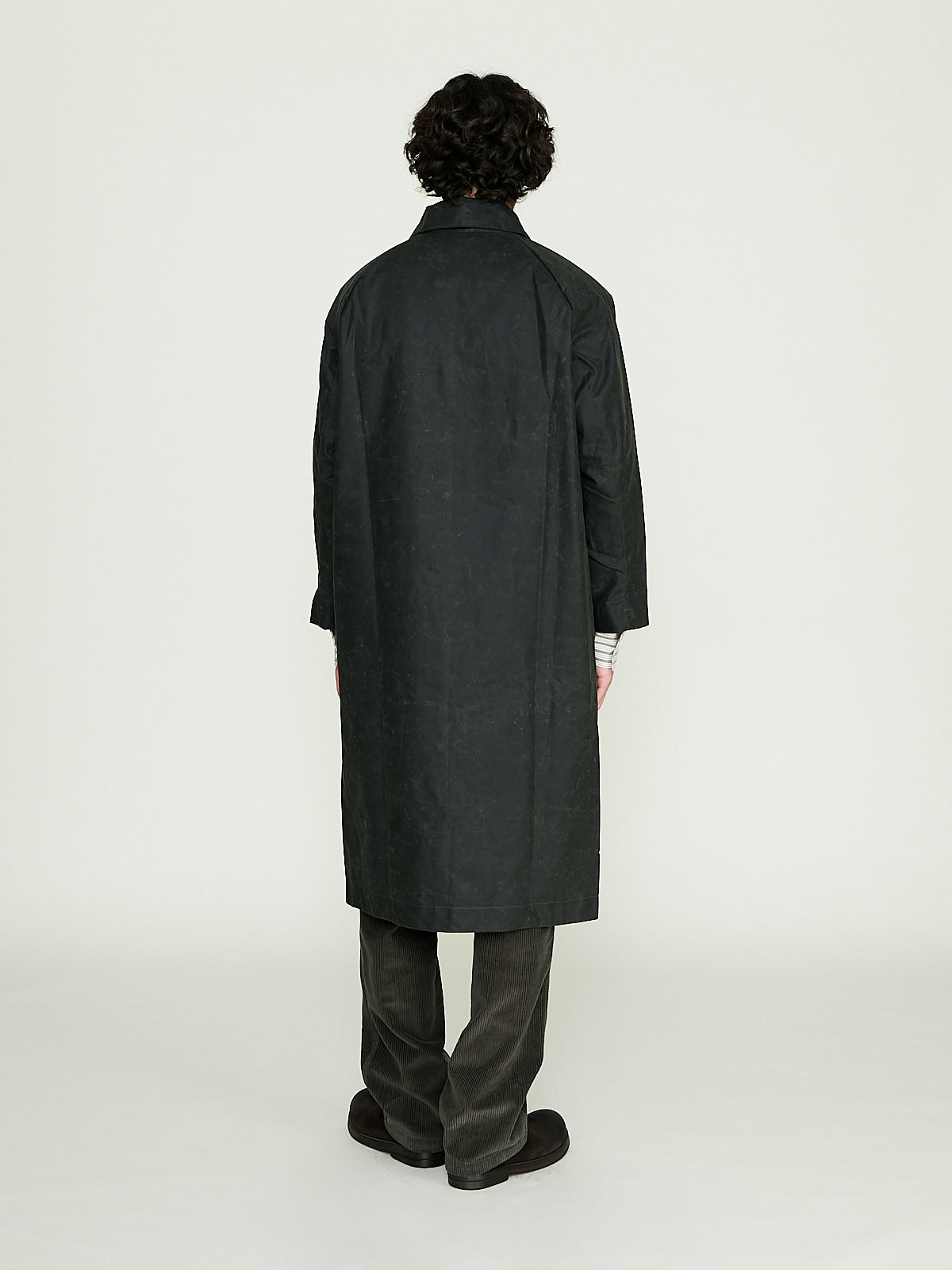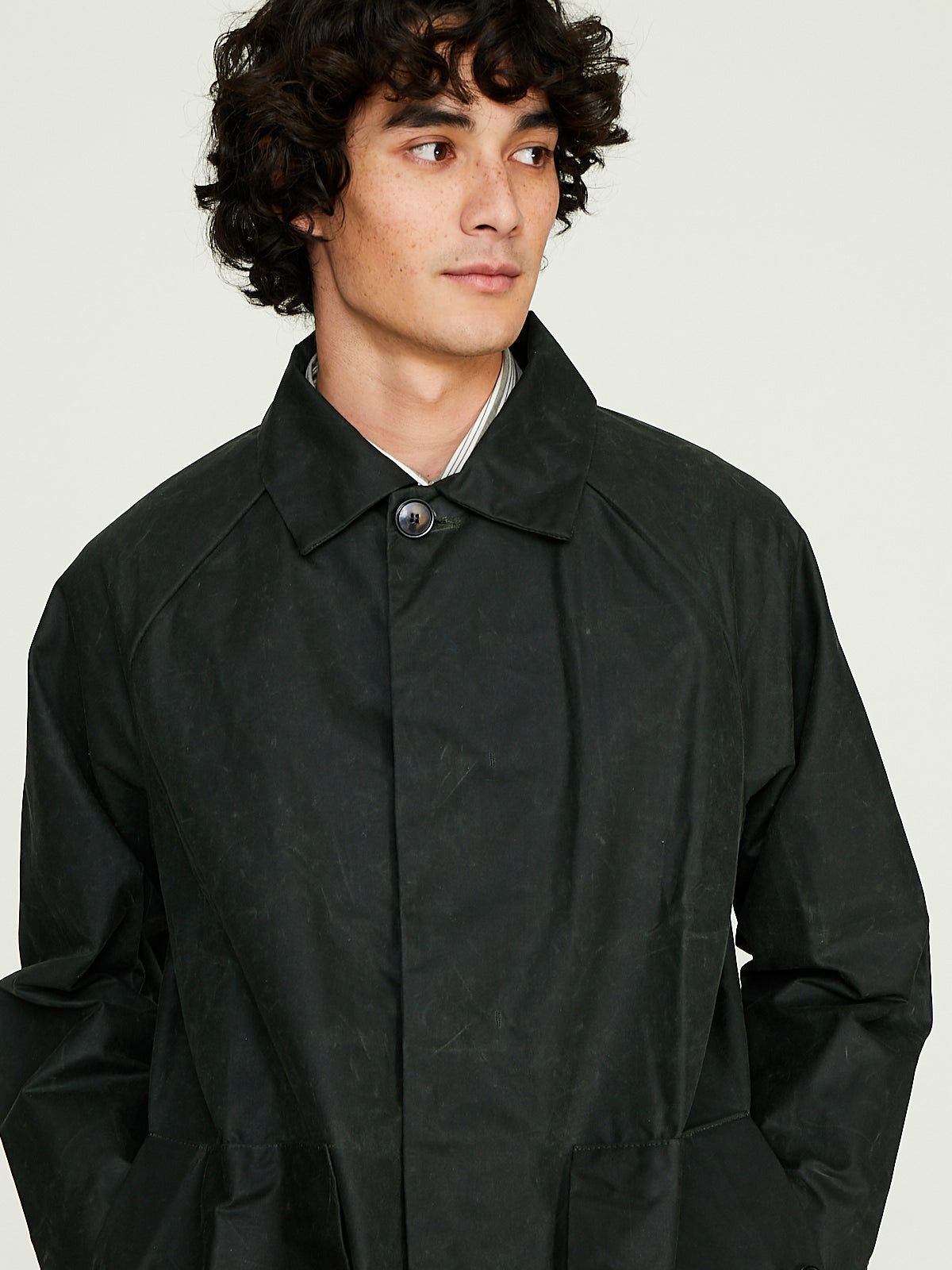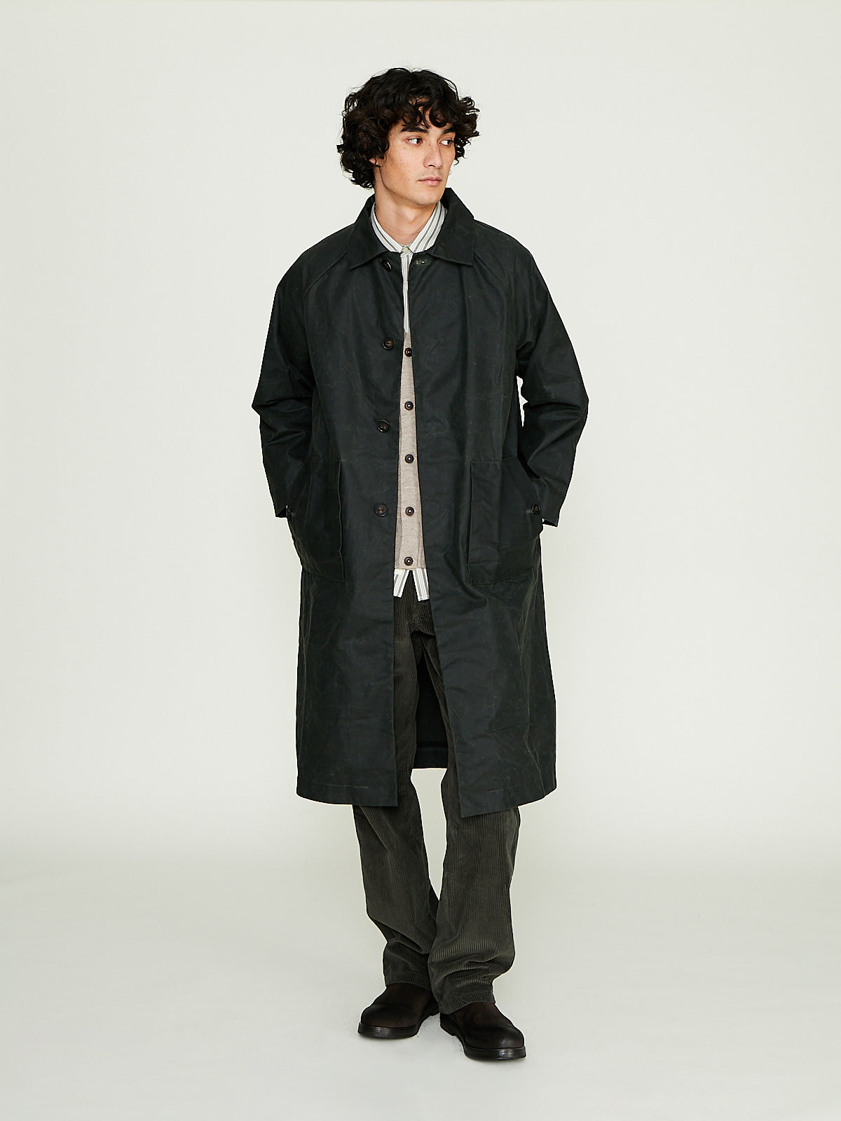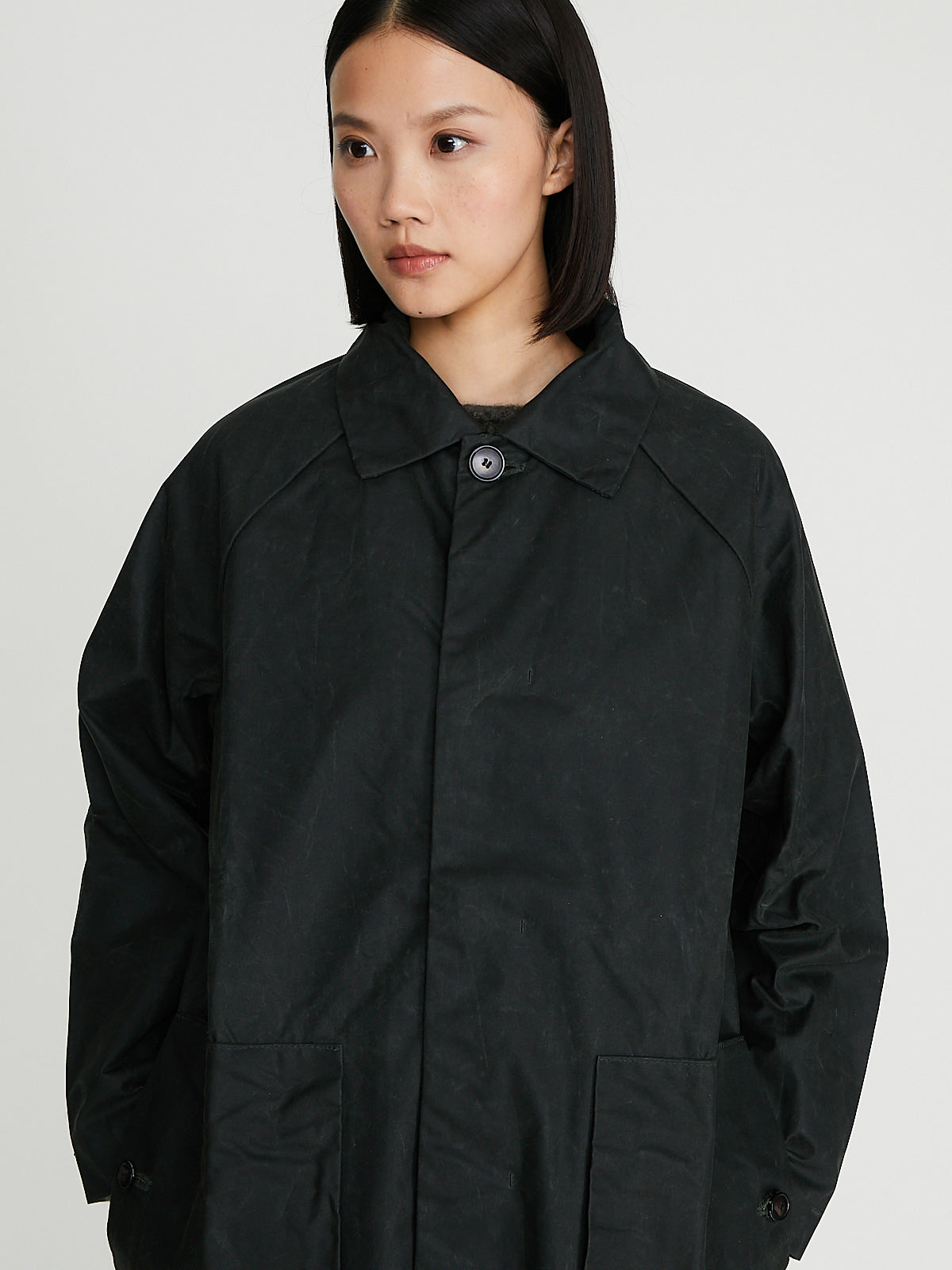 Unisex coat crafted from dark green waxed BCI cotton from Scotland, by Halley Stevensons. This cotton has been treated with biodegradable oil, and is both water-repellent and breathable. With regular use, it will develop a unique patina, adding character to the garment over time.