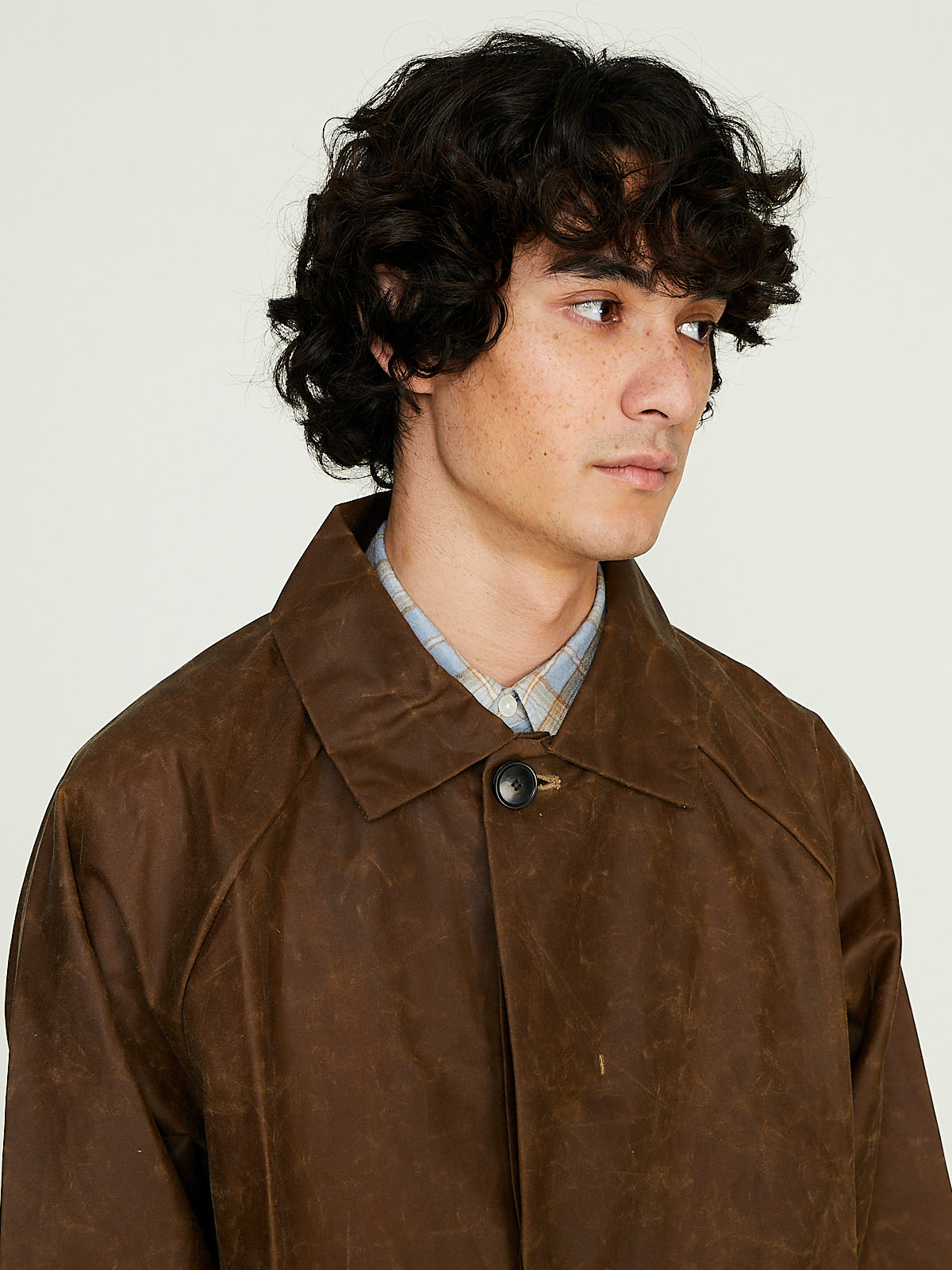 Unisex coat crafted from tan waxed BCI cotton from Scotland, by Halley Stevensons. This cotton has been treated with biodegradable oil, and is both water-repellent and breathable. With regular use, it will develop a unique patina, adding character to the garment over time.