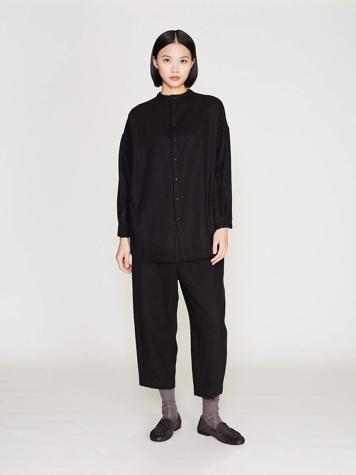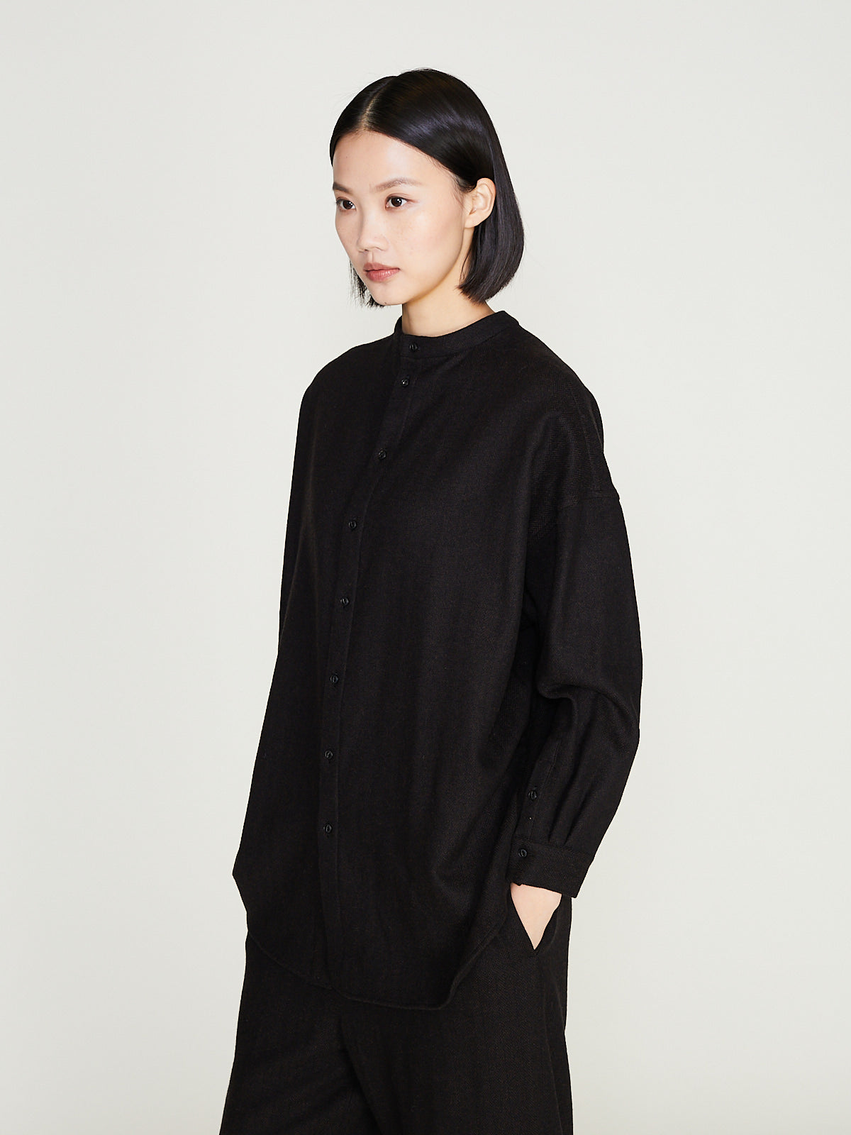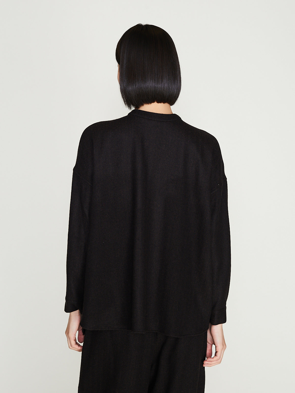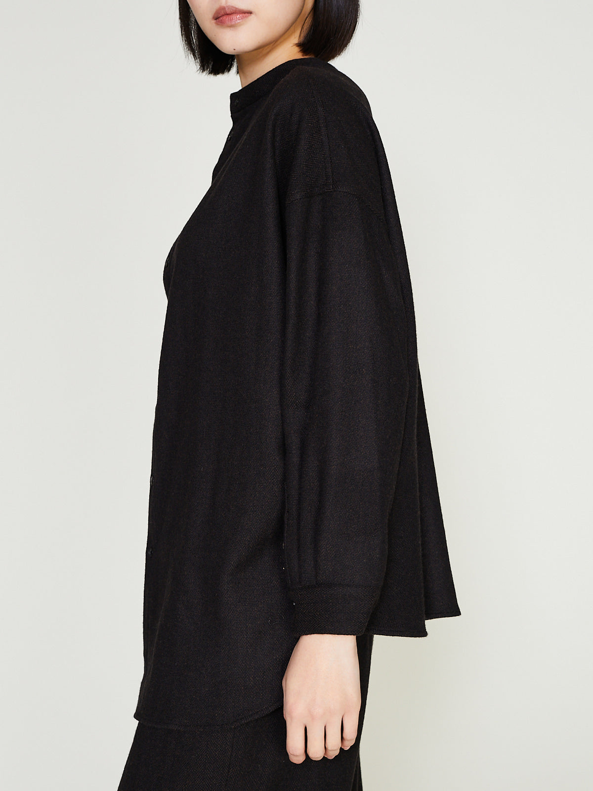 Relaxed shirt in a brown wool/silk herringbone. Round neckline, button fastening. Long sleeves with a dropped shoulder and buttoned cuffs. Can be worn with the buttons on the front or back.