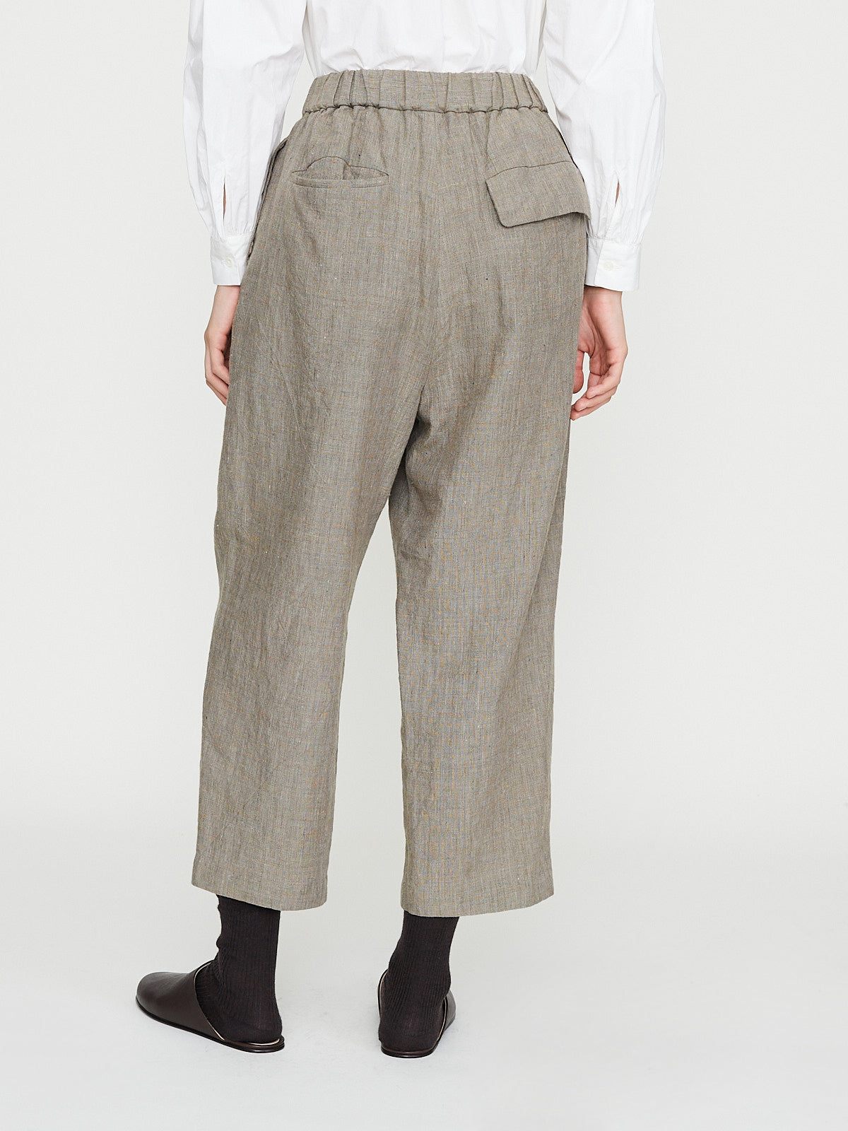 Oversized easy pants in khaki linen/wool Hakeme chambray. Pull-on style with an elasticated waistband and side seam pockets. One welted slip pocket and a flap pocket on the back. Cropped wide legs that taper at the cuffs.