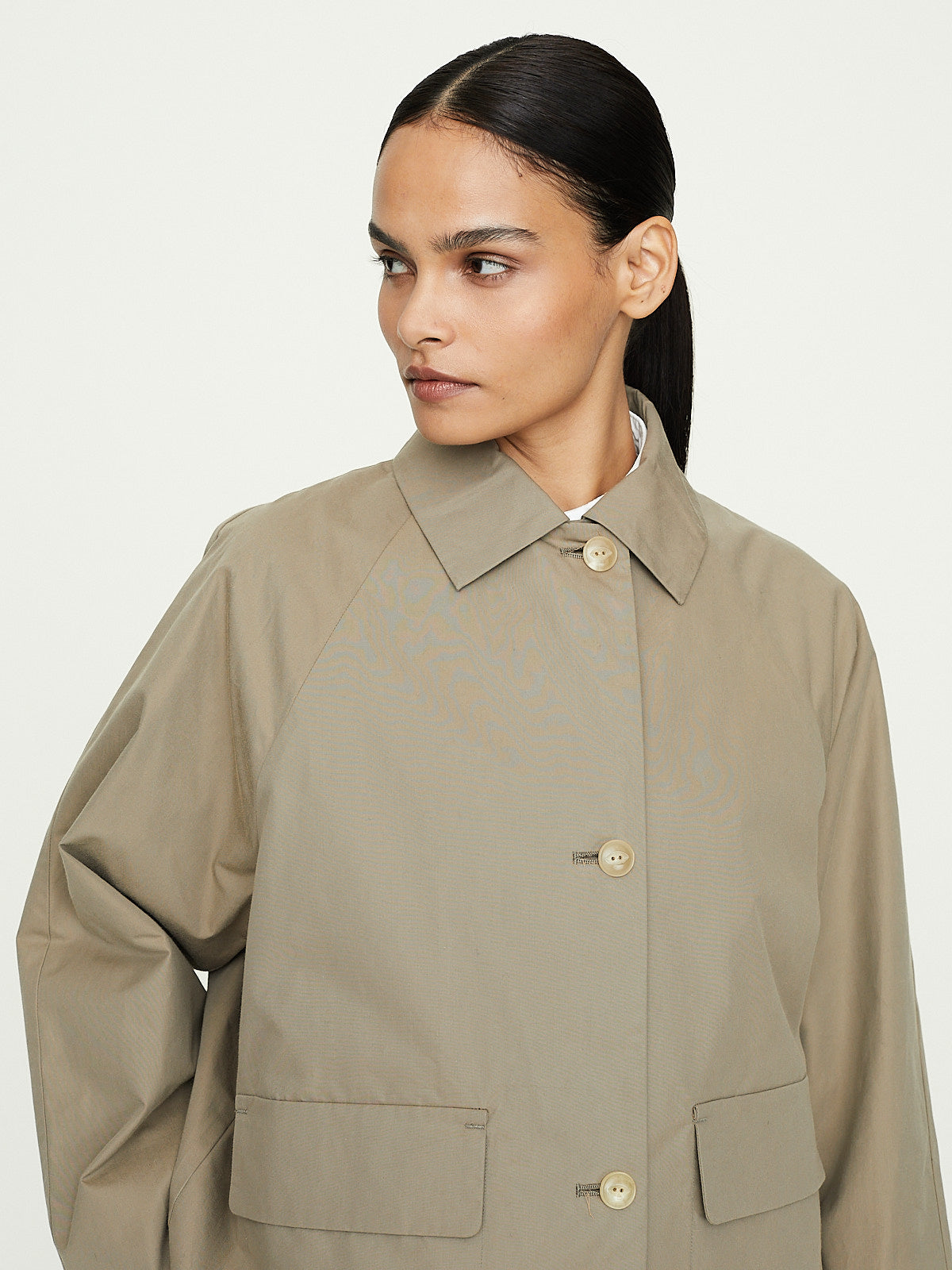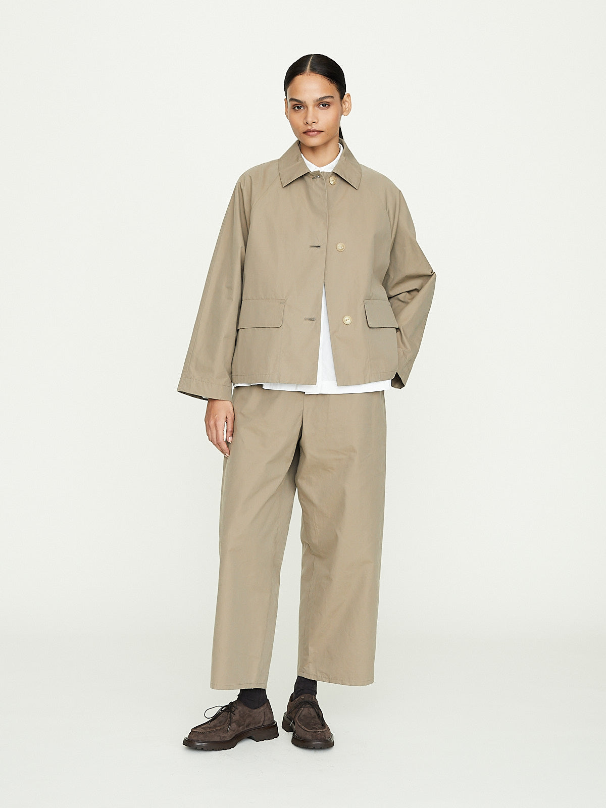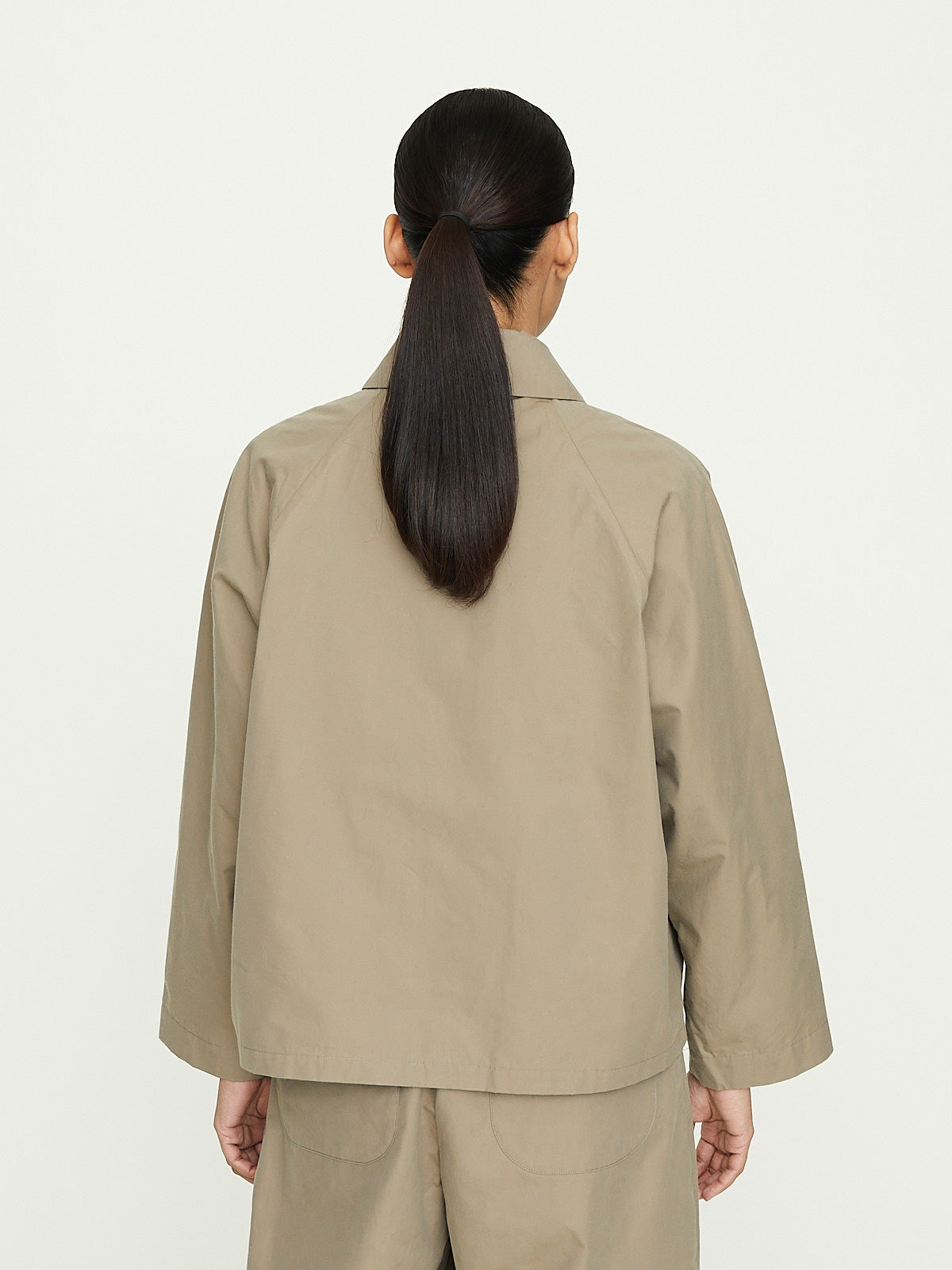 Cropped boxy jacket in a khaki cotton canvas. Bal collar, front button fastening and wide raglan bracelet sleeves. Flap pockets on the front. Oversized fit.