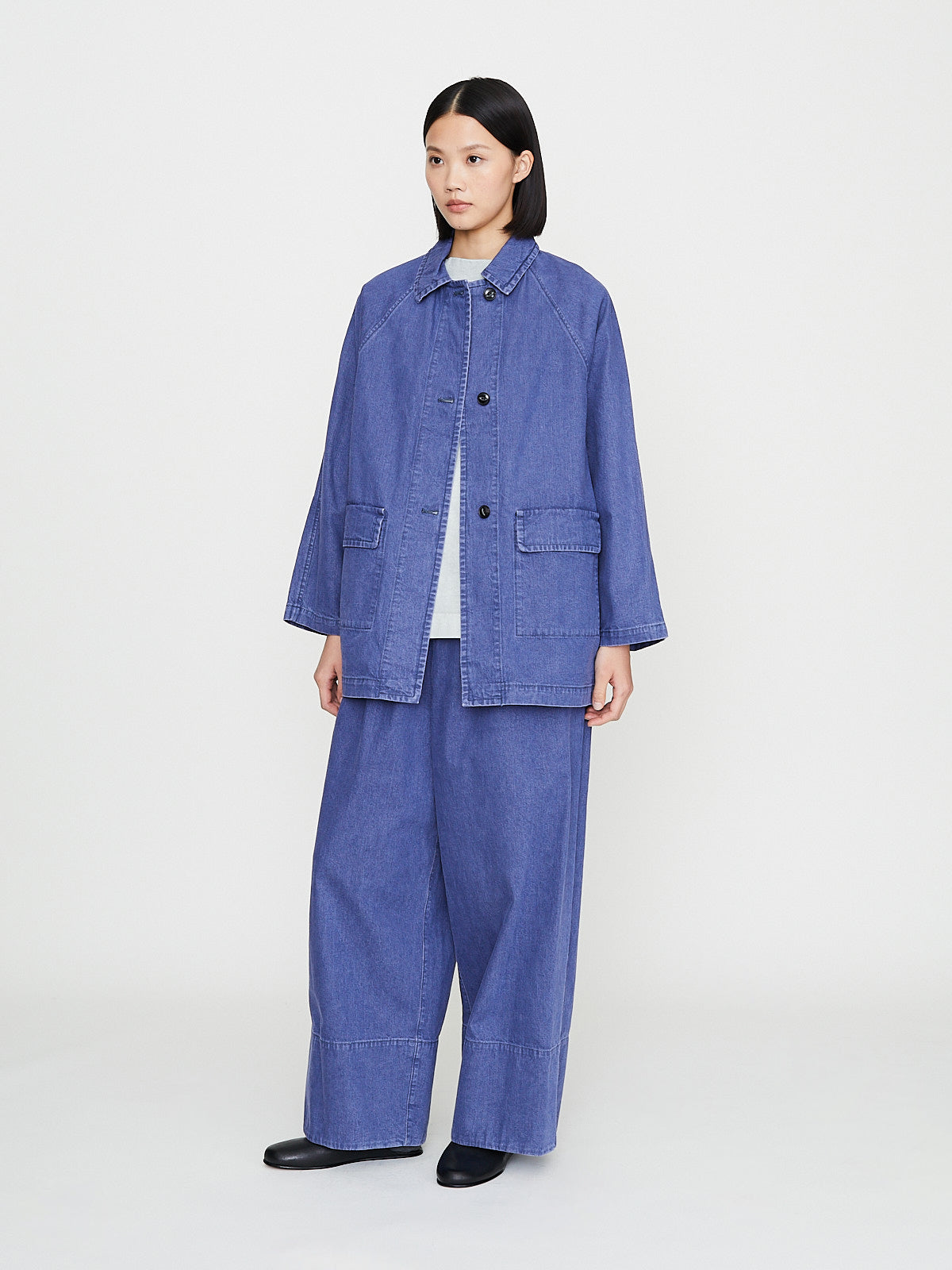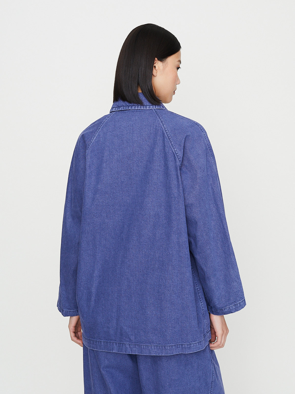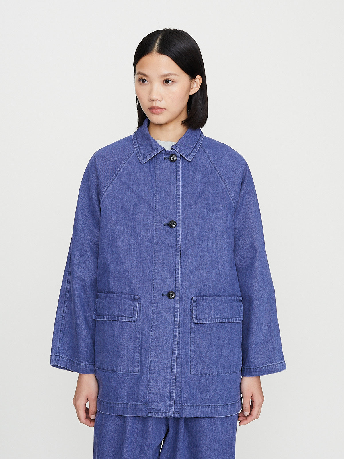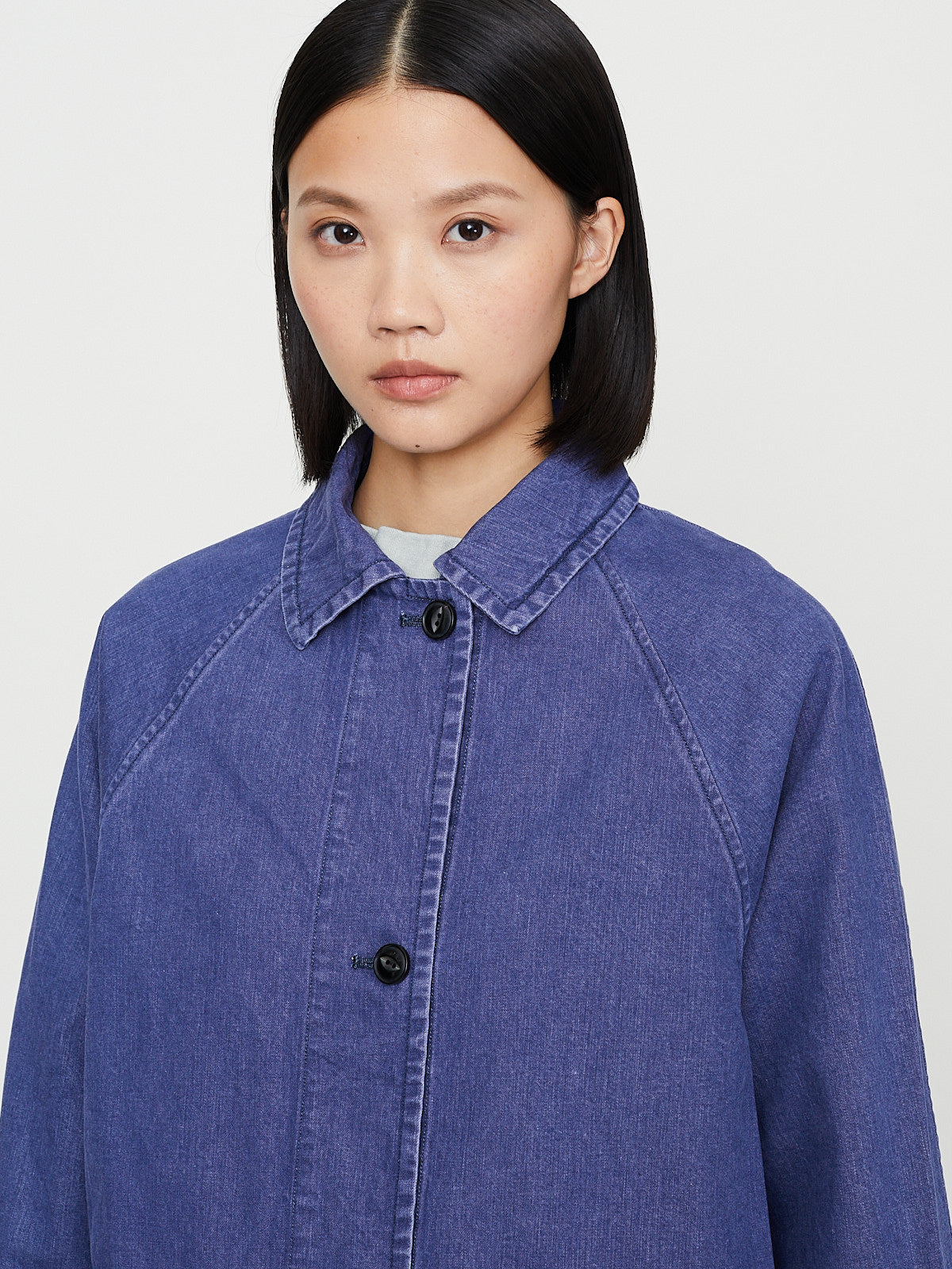 Workwear-inspired long jacket in blue/grey sulfur-dyed light cotton denim. Bal collar, front button fastening and wide raglan bracelet sleeves. Flap pockets on the front. Contrasting topstitching throughout. Relaxed fit.