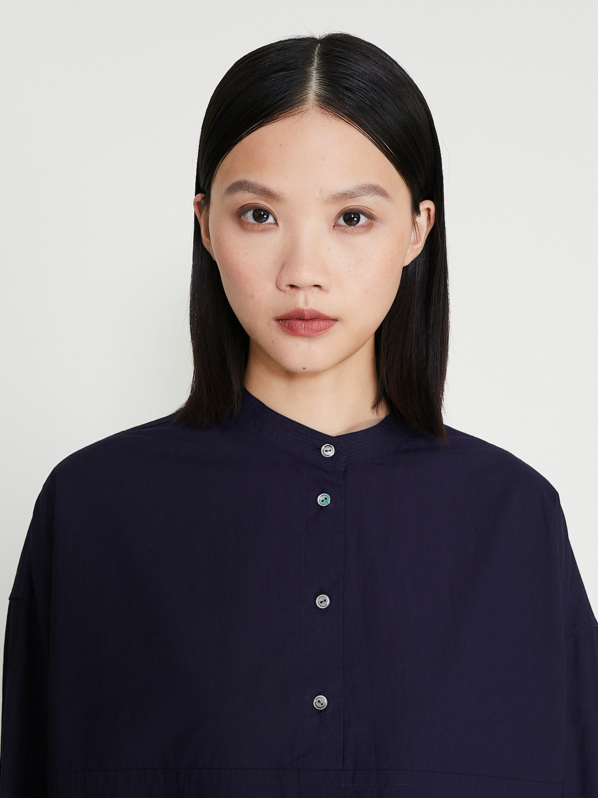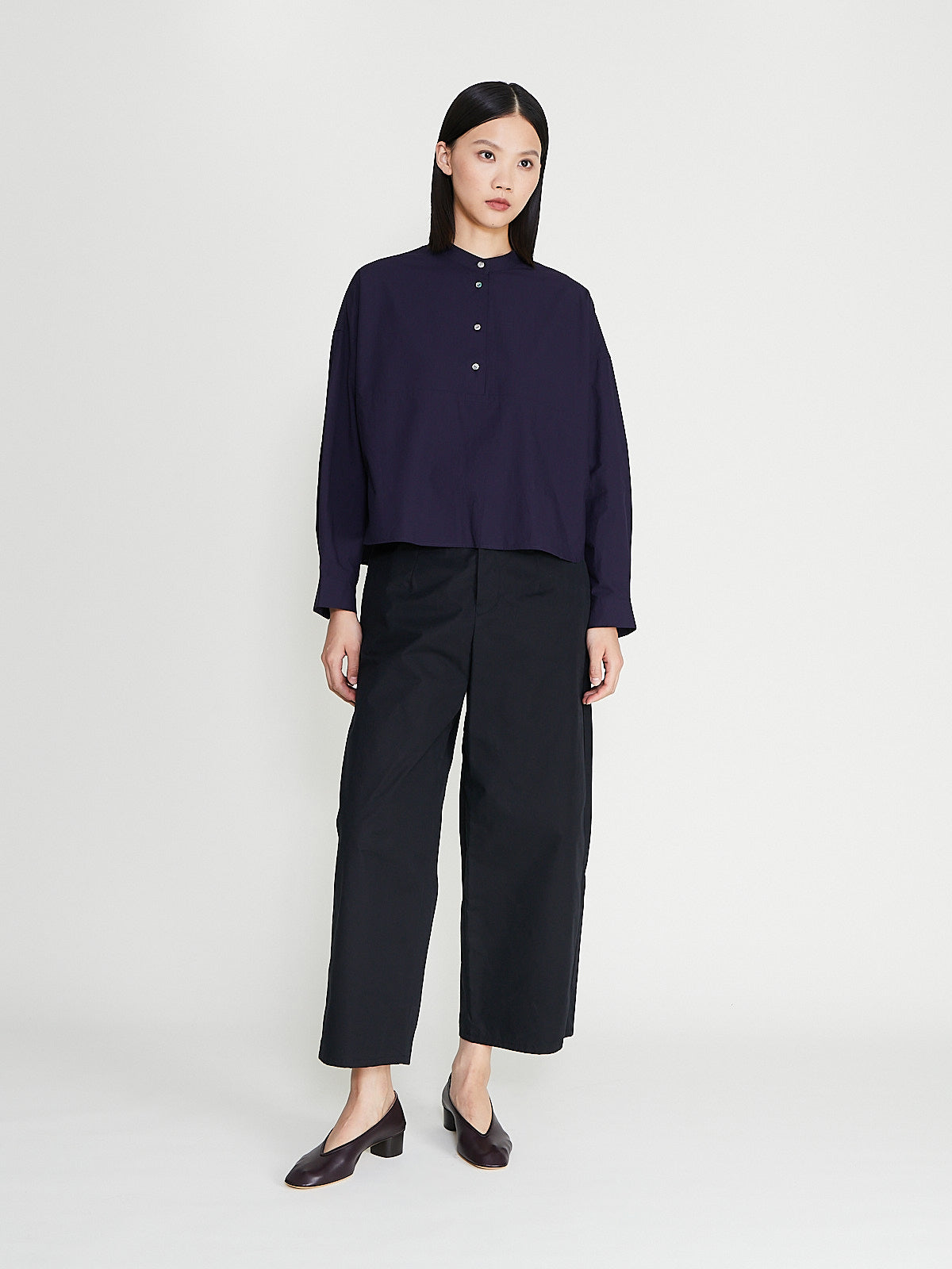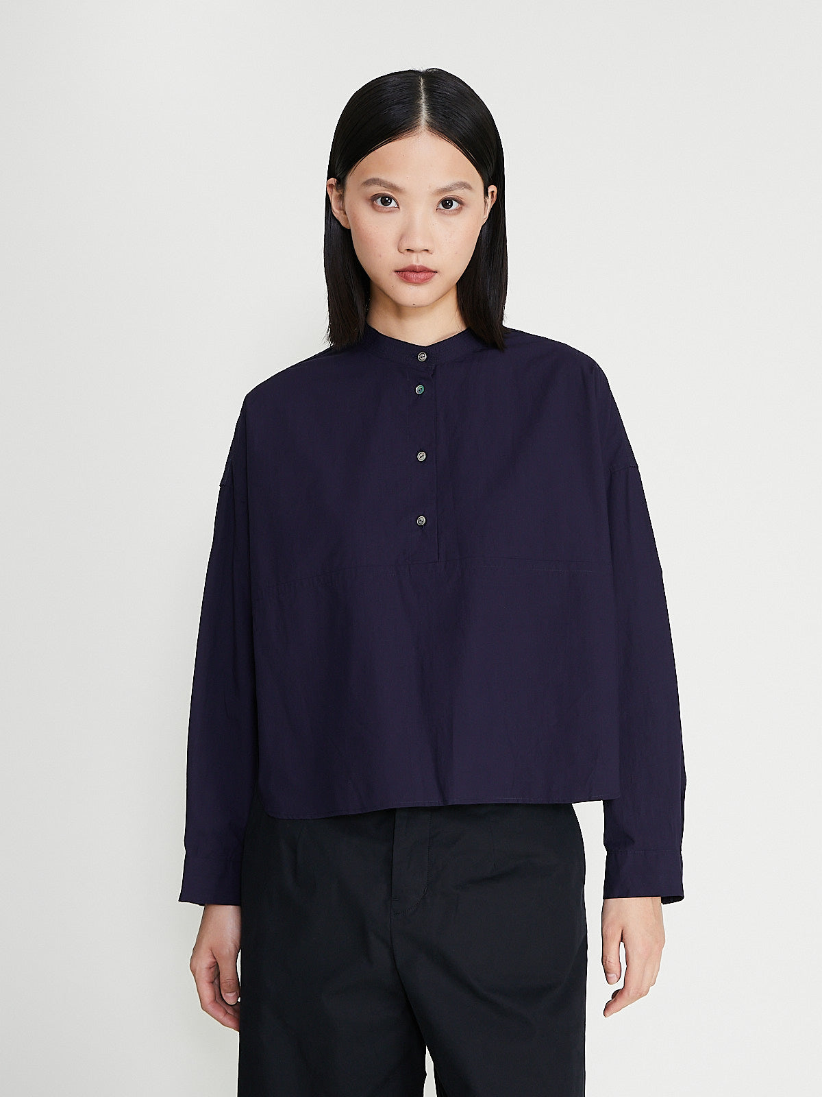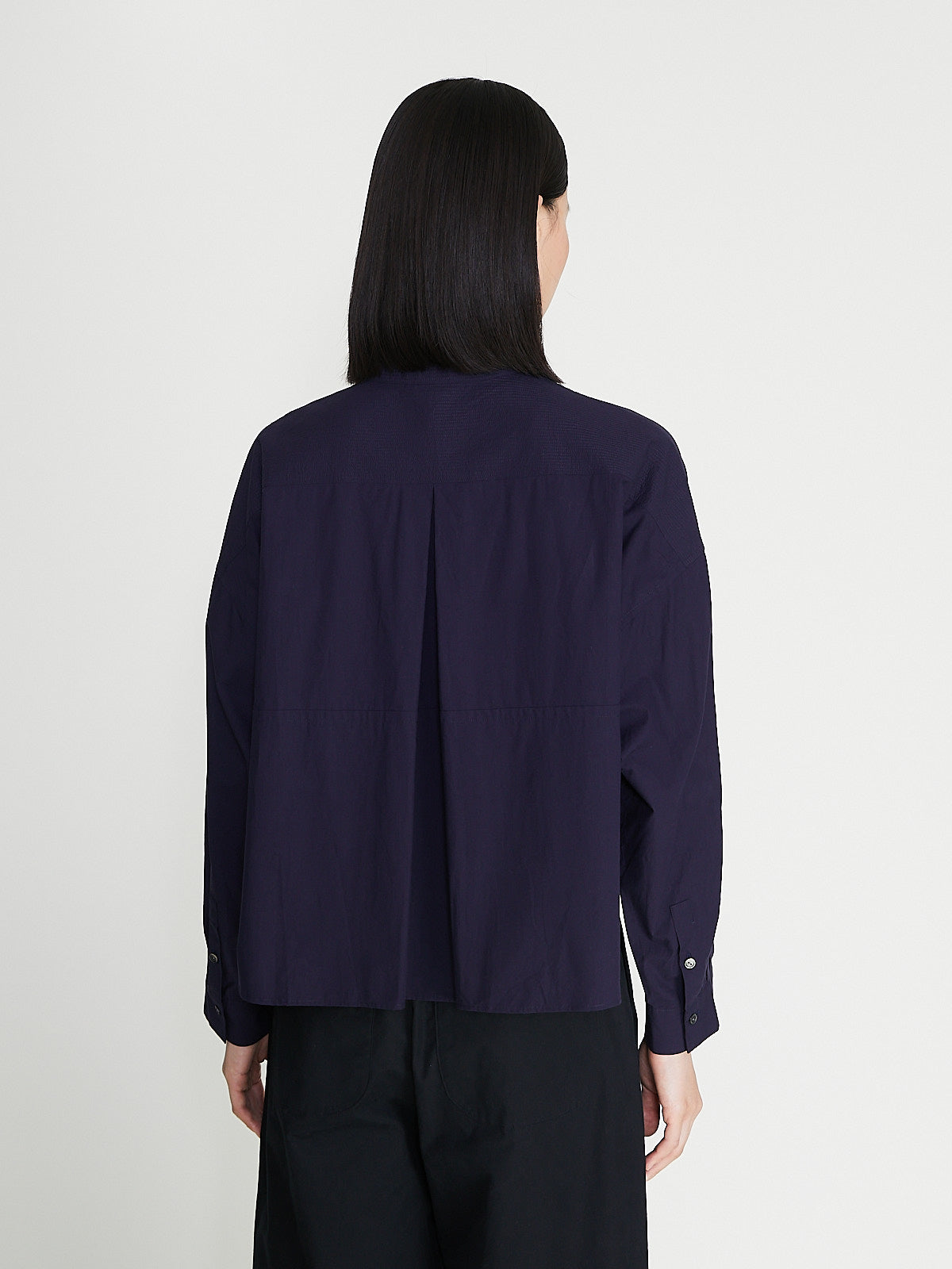 Boxy shirt in purplish navy cotton. Banded cotton, partial front button fastening and long sleeves with a dropped shoulder and buttoned cuffs. Features a back yoke with a pleat detail.