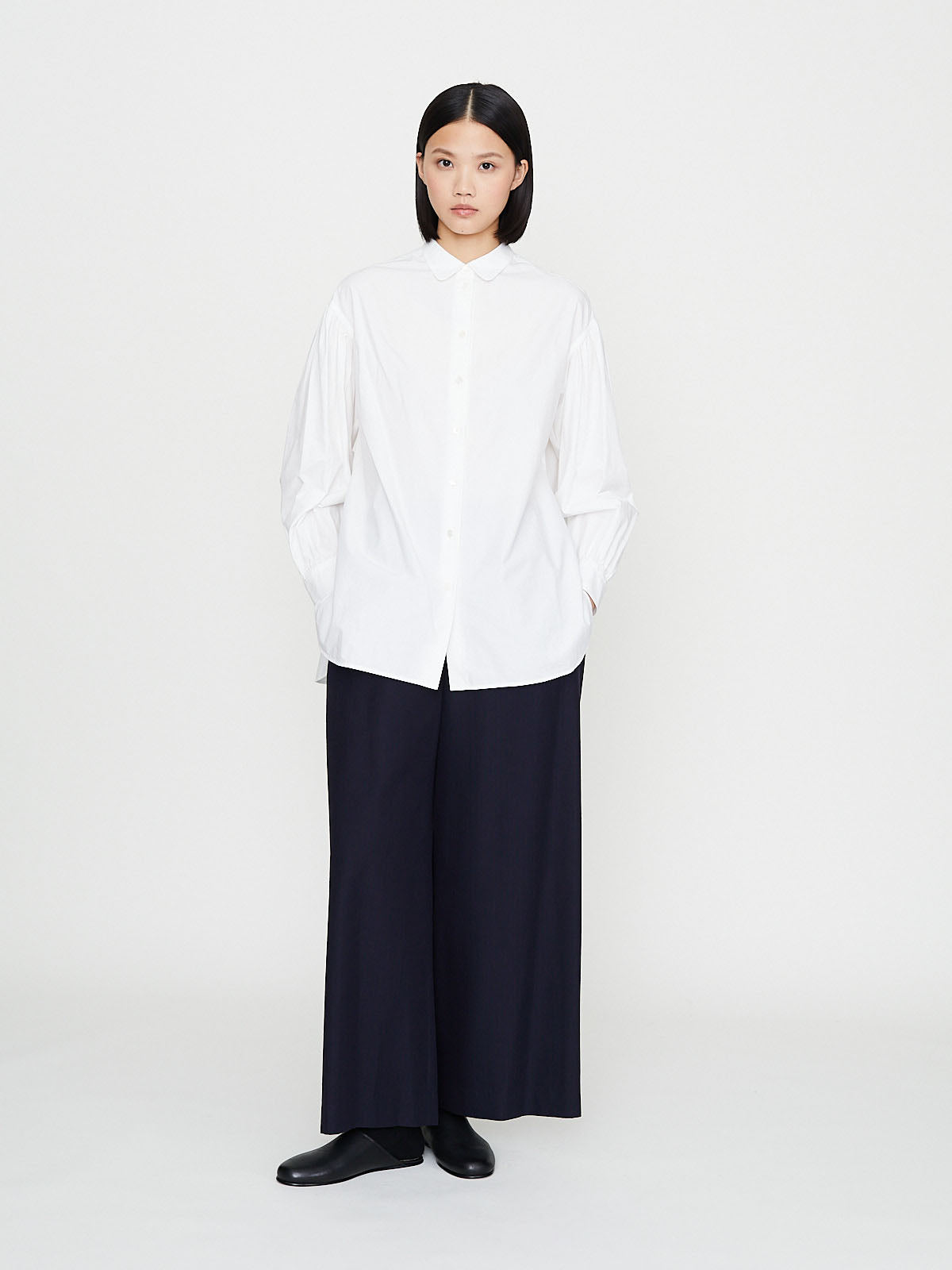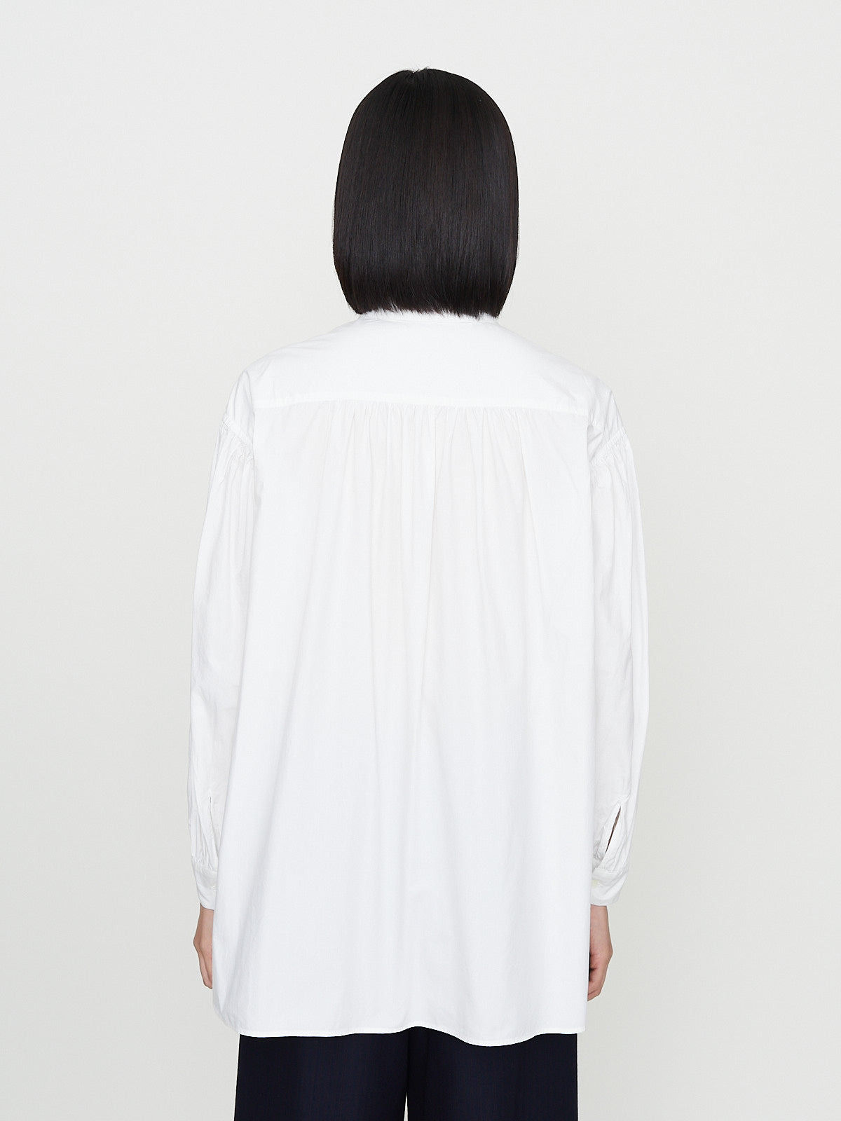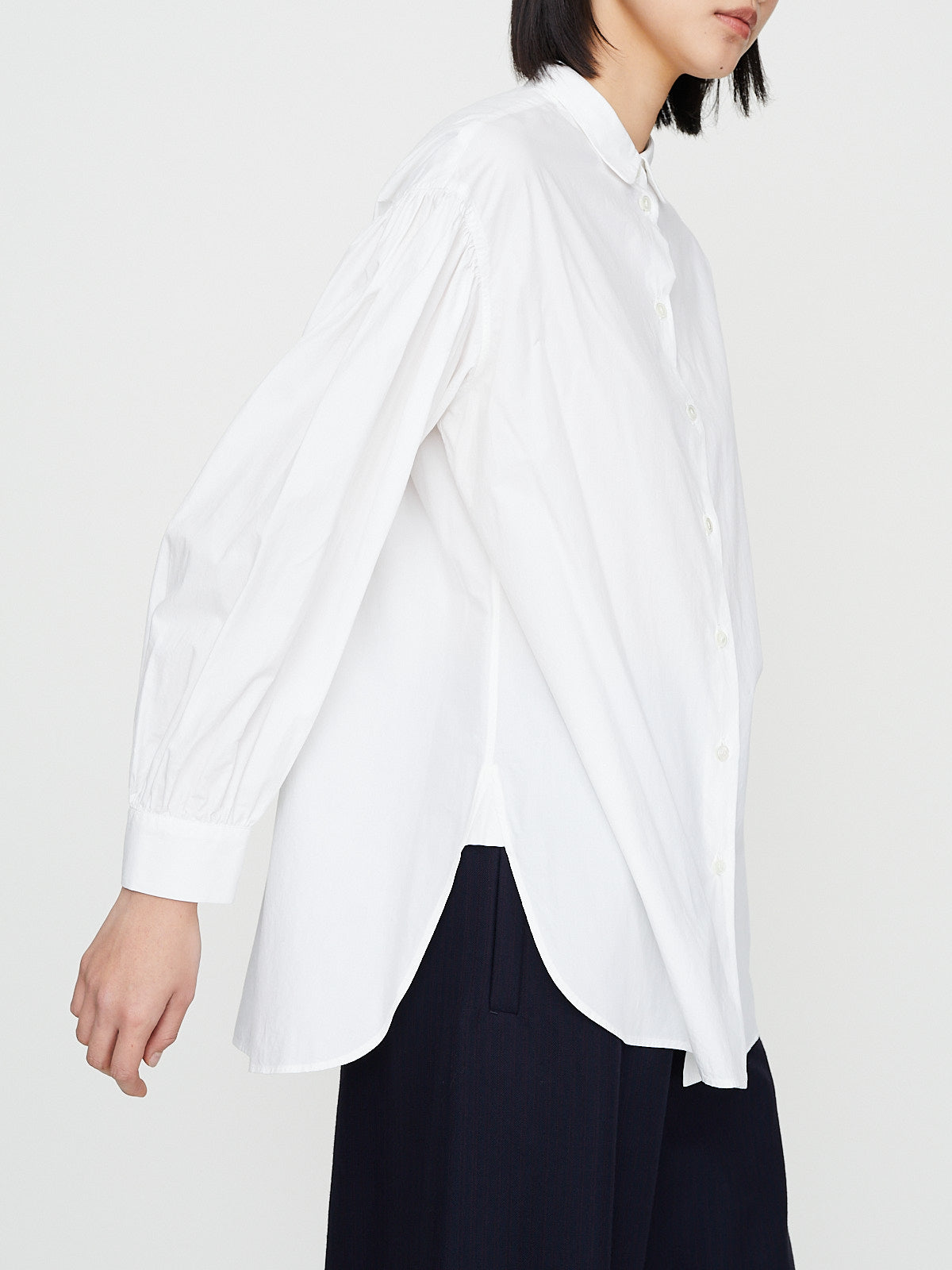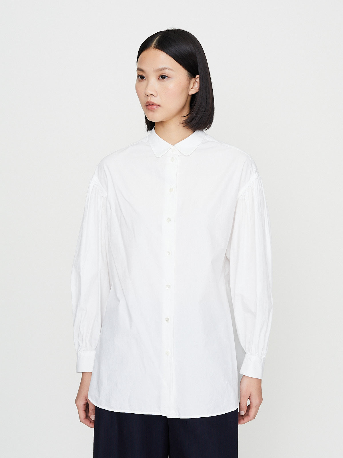 Relaxed shirt in off white high count special cotton. Peter Pan collar, front button fastening and long sleeves with buttoned cuffs. Features a dropped shoulder and a curved hemline. Gathering detailing at the shoulder seams and back yoke.