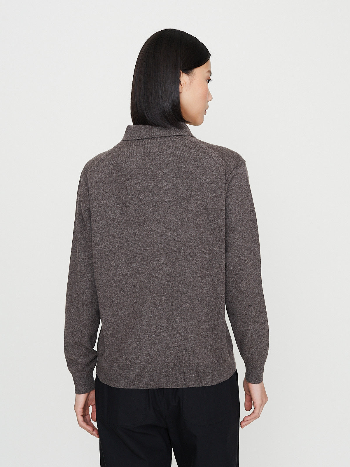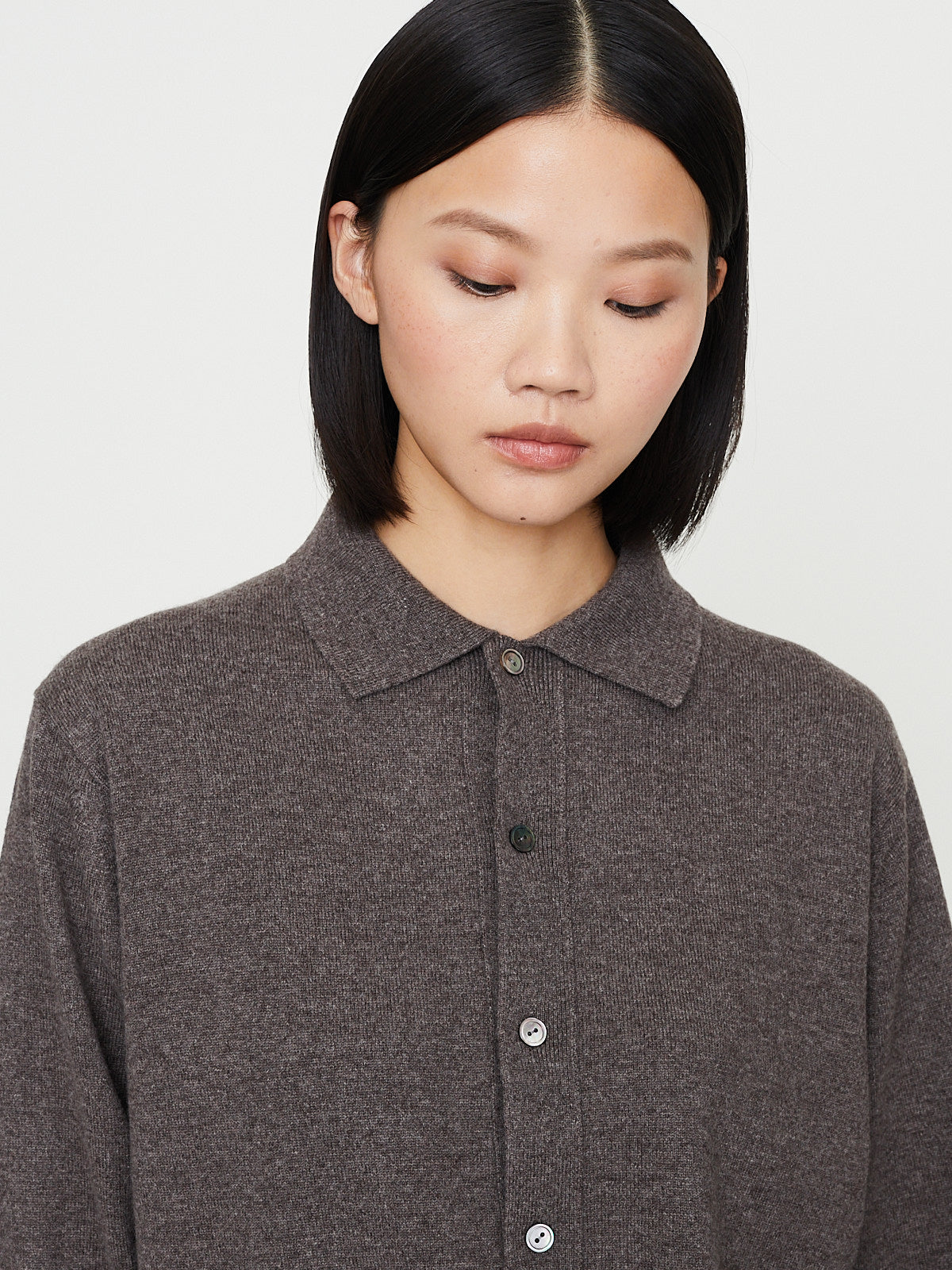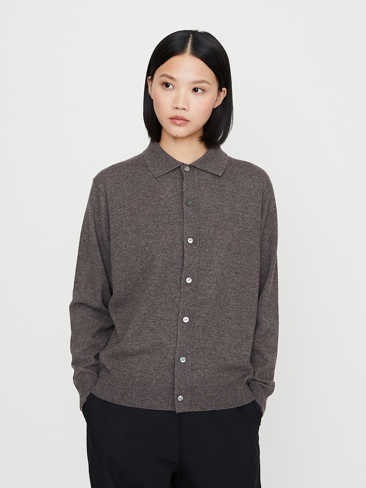Unisex cardigan in pure taupe cashmere. Polo collar, front button fastening and long half raglan sleeves with a dropped shoulder. Rib detail around the cuffs and bottom hem. Relaxed fit.