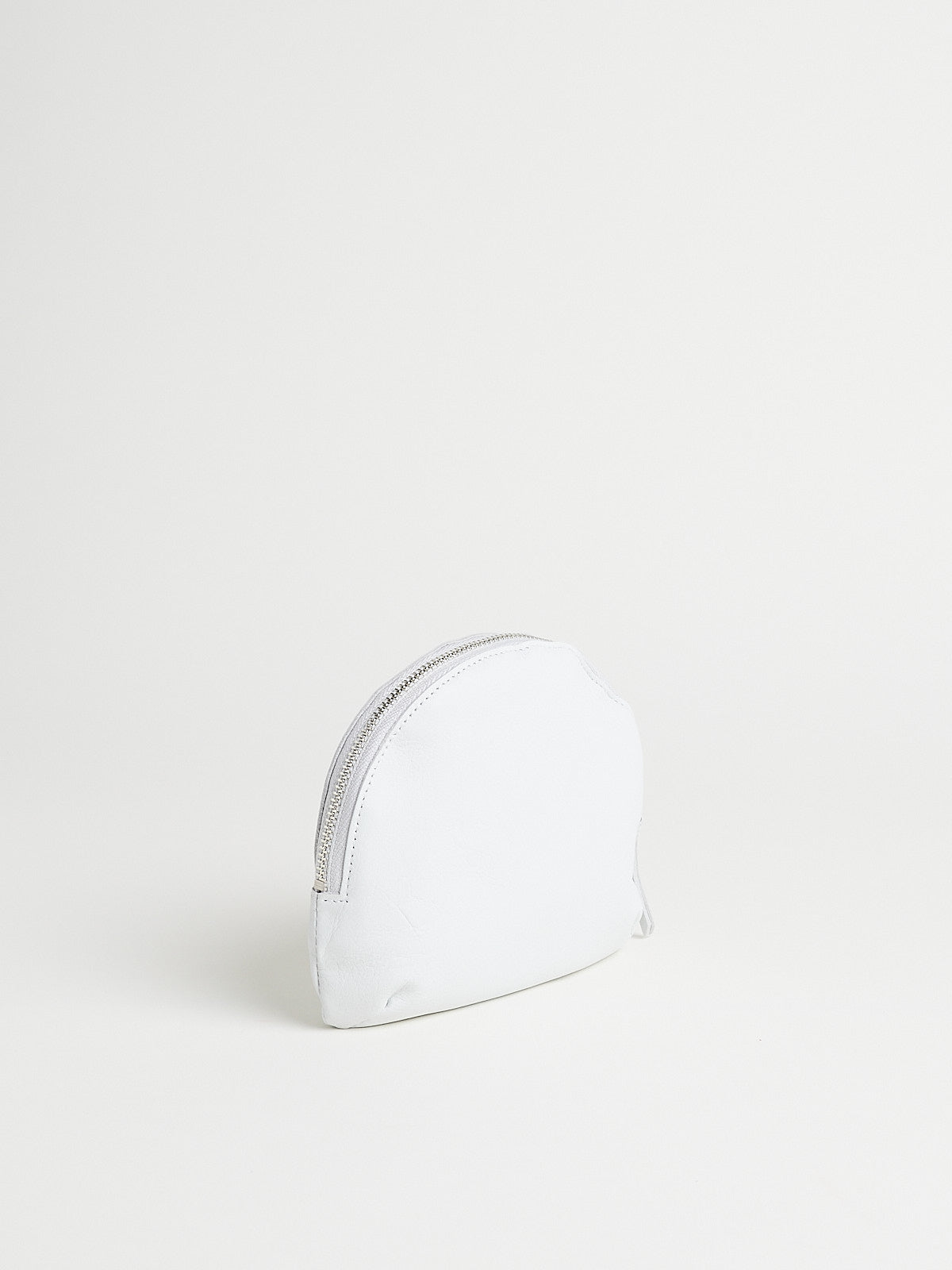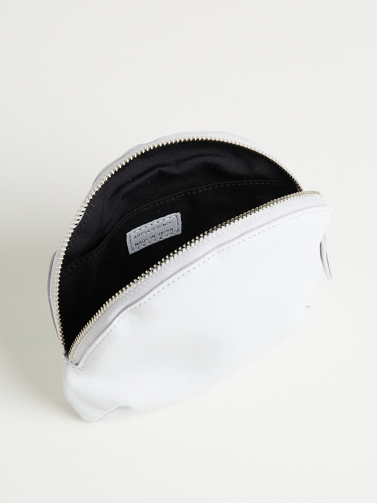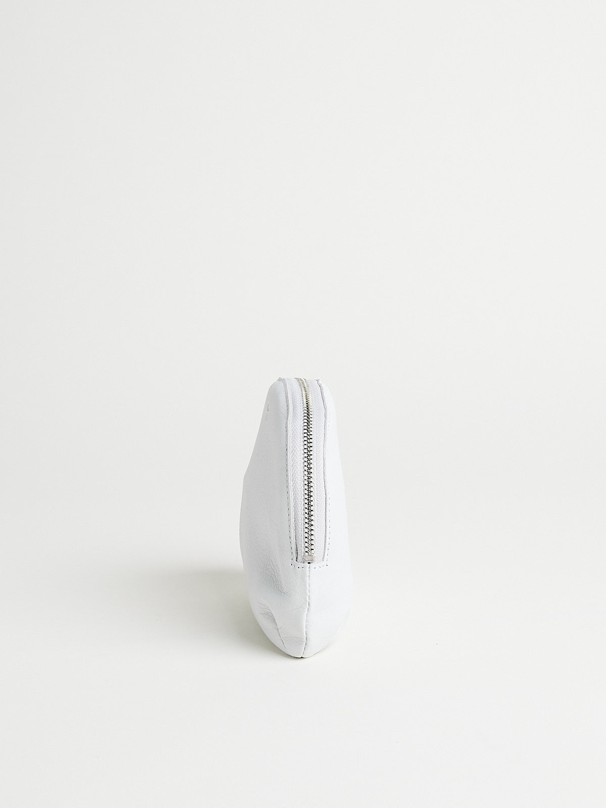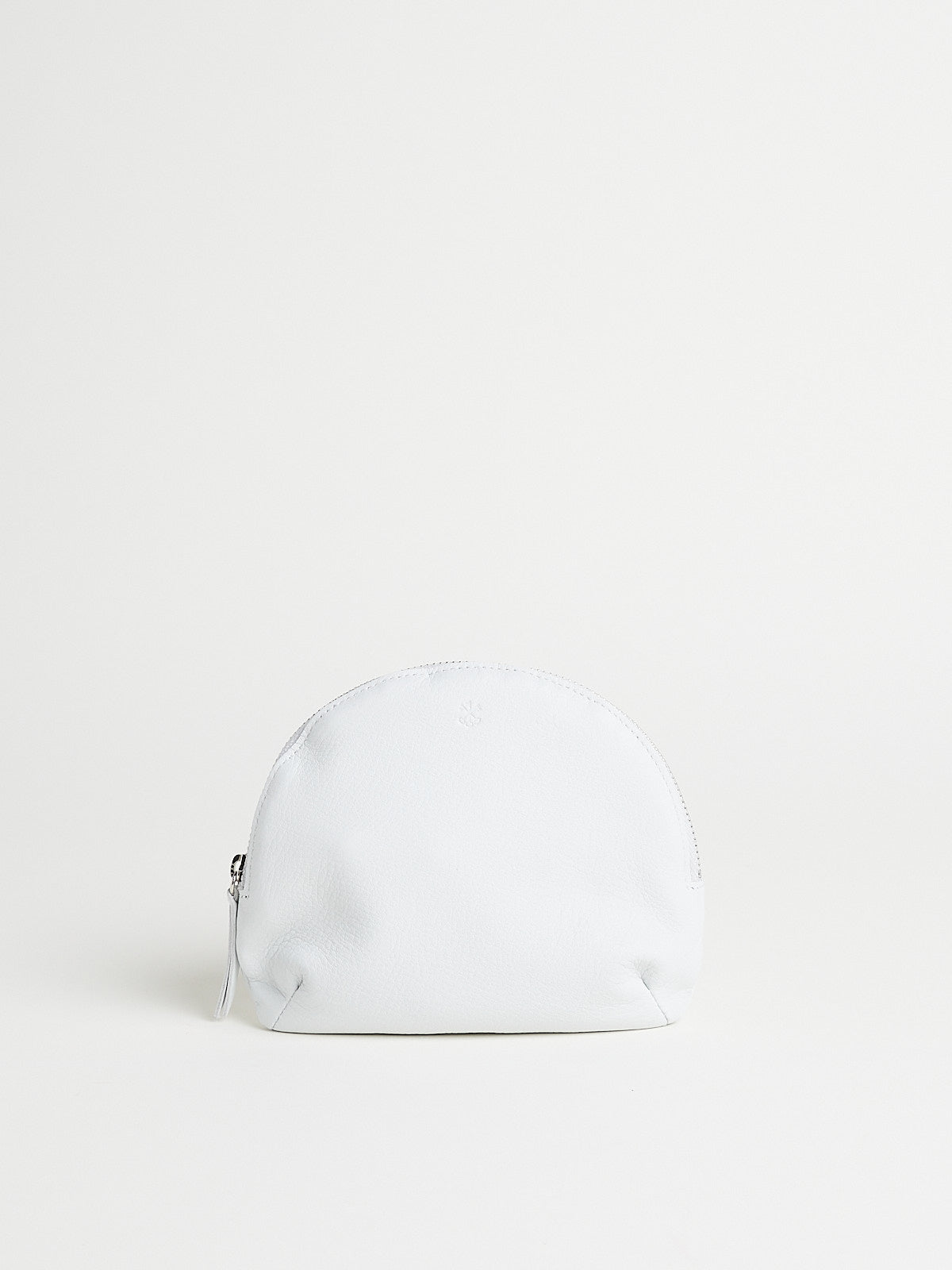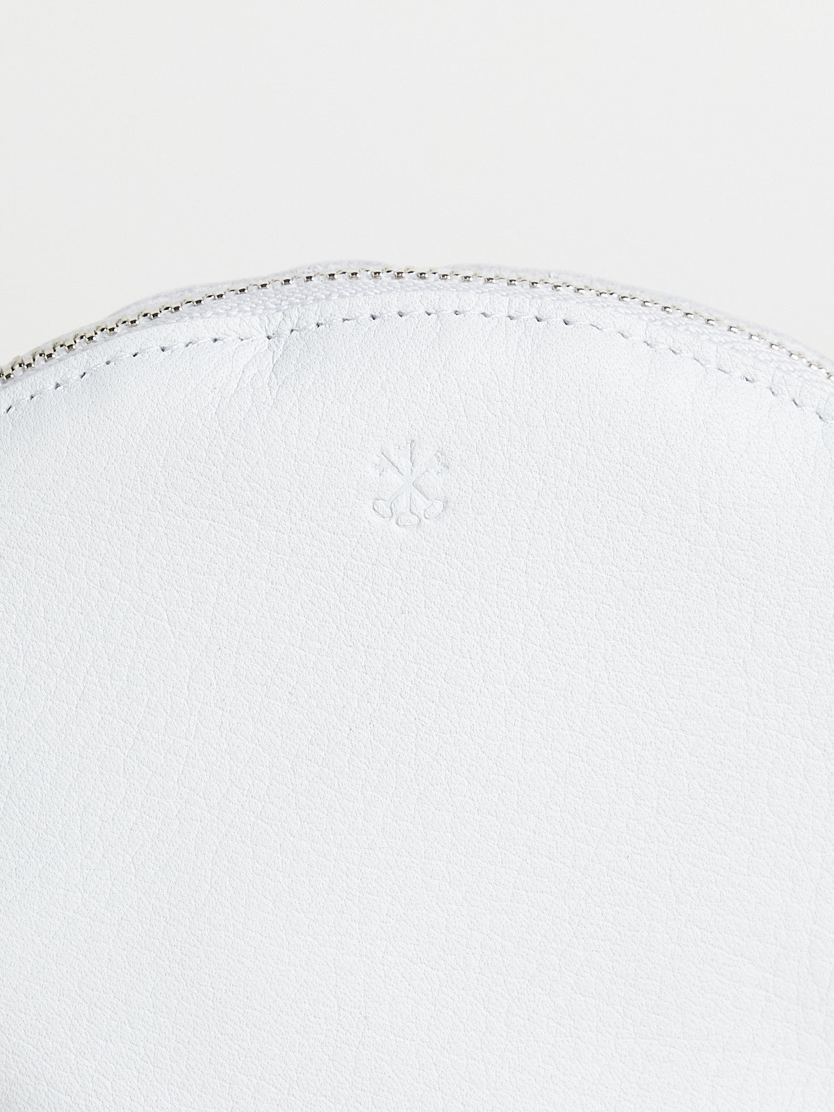 Small round pouch in dyed light grey cow leather. Gusseted design and a zip fastening with a pull tab. The inside has one divider pocket. Lined in contrasting cotton. Embossed logo on the front.