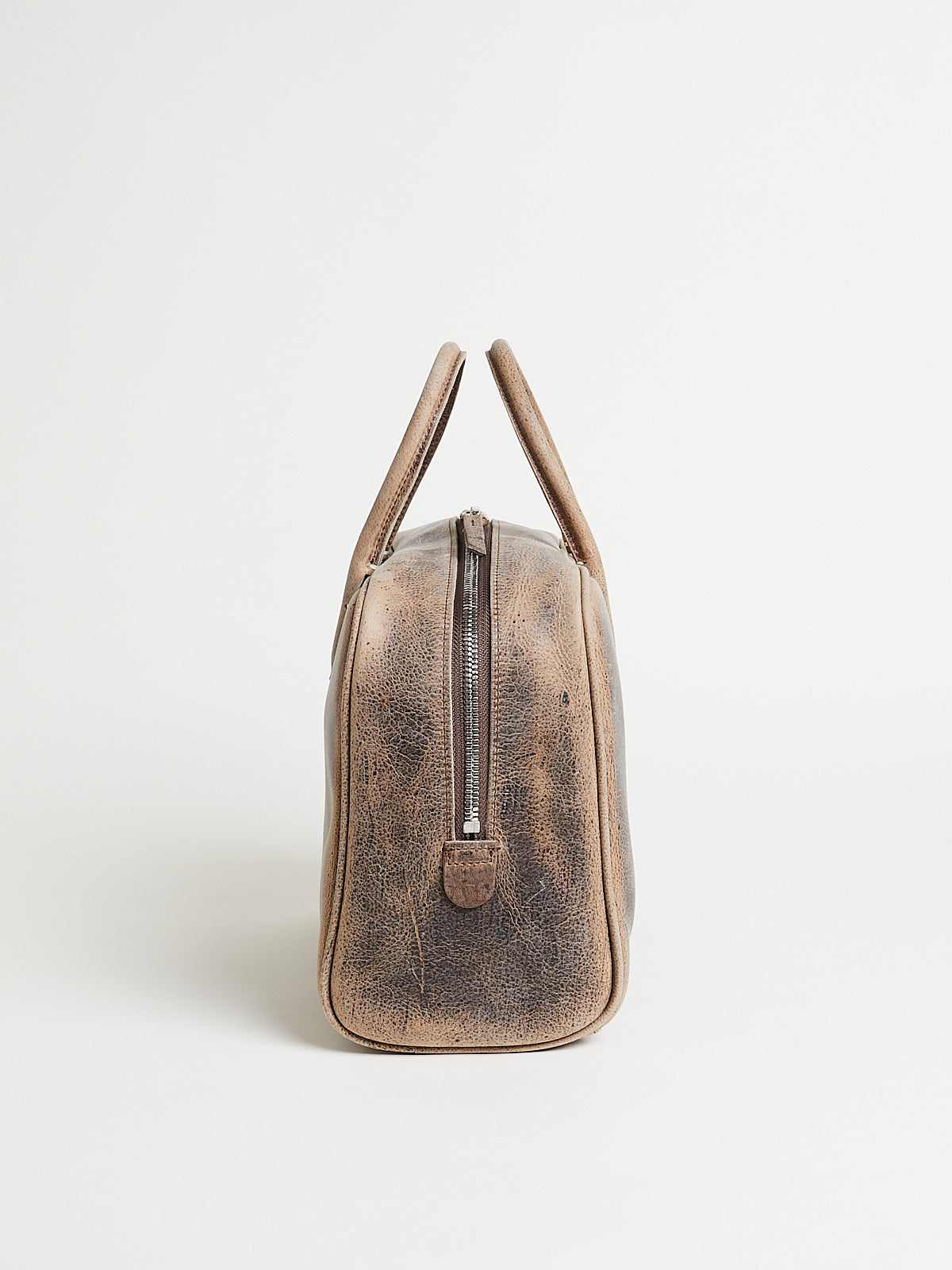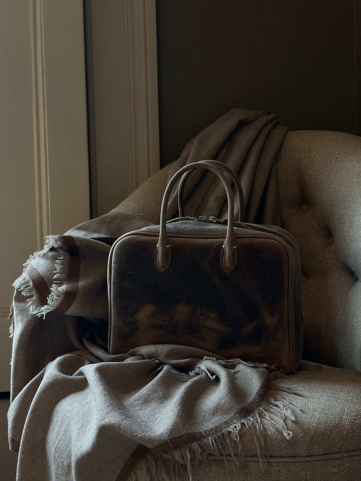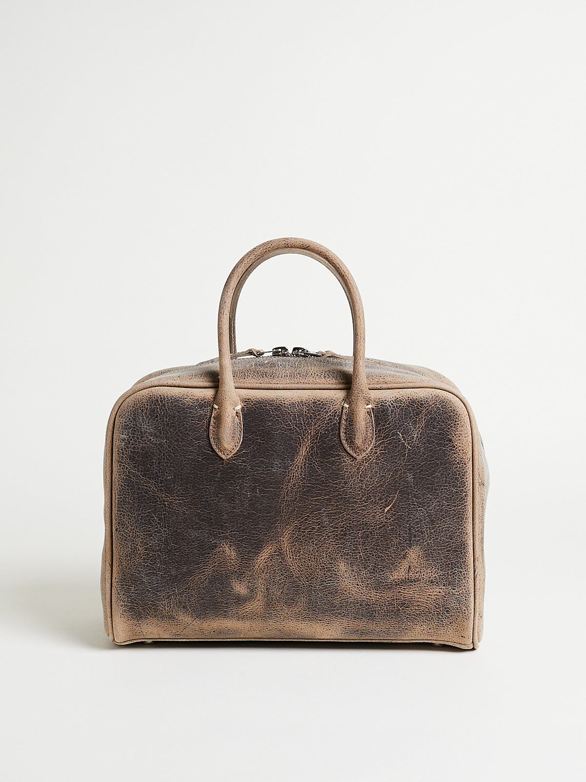 Structured bowling bag in dark beige antelope leather. Two short handles and a double zip fastening. One main compartment and an internal pocket with a zip fastening. Features metal studs on the bottom to elevate the bag. Lined in cow? leather.