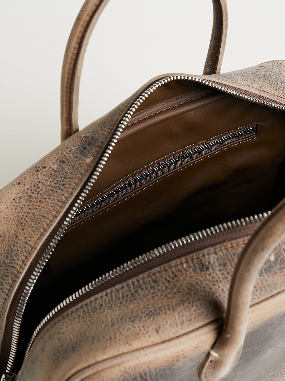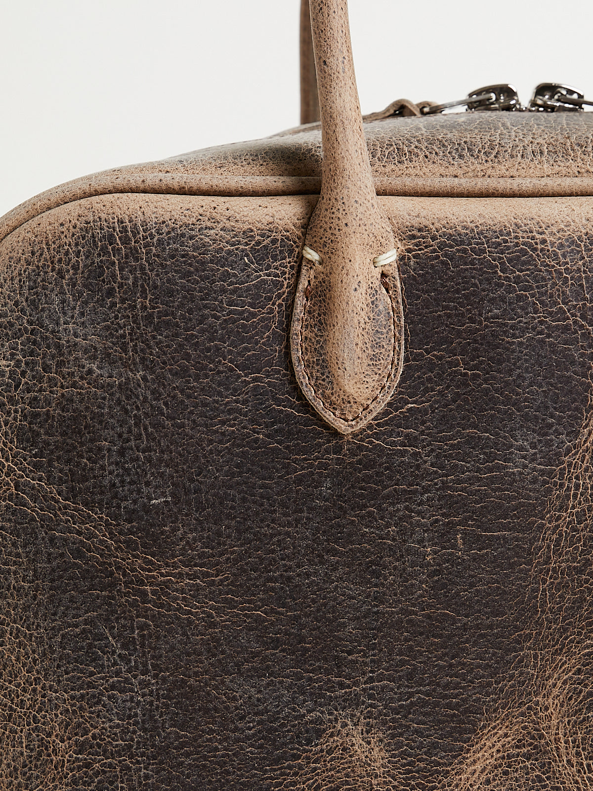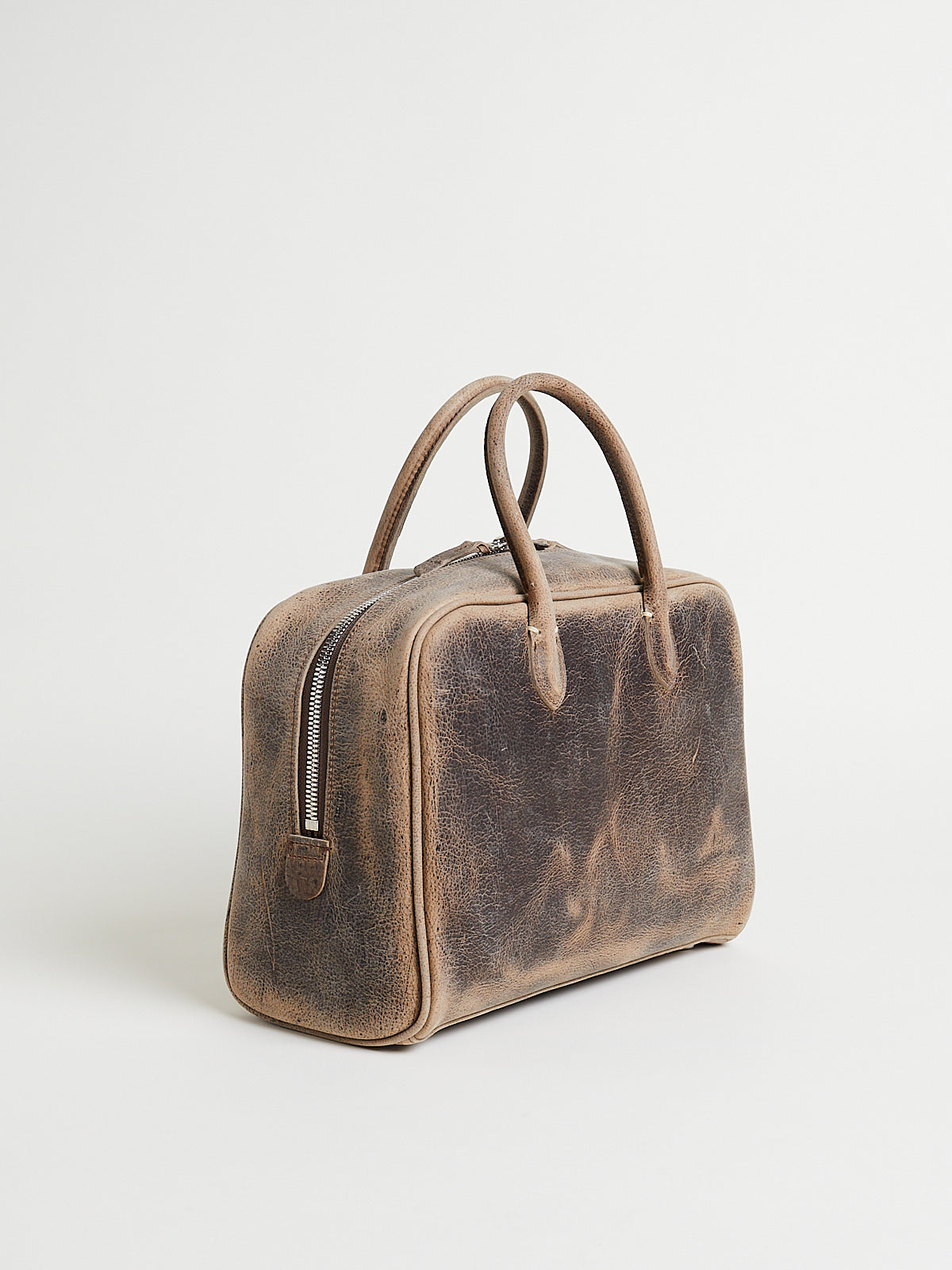 Structured bowling bag in dark beige antelope leather. Two short handles and a double zip fastening. One main compartment and an internal pocket with a zip fastening. Features metal studs on the bottom to elevate the bag. Lined in cow? leather.