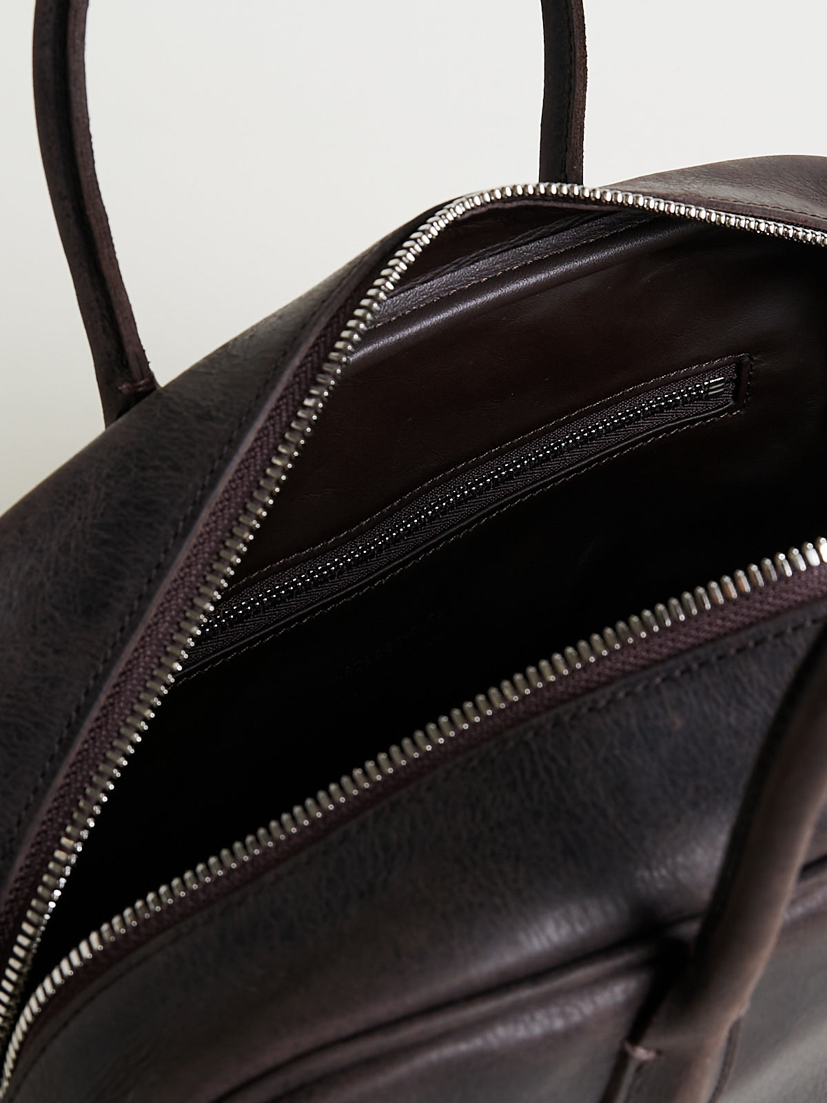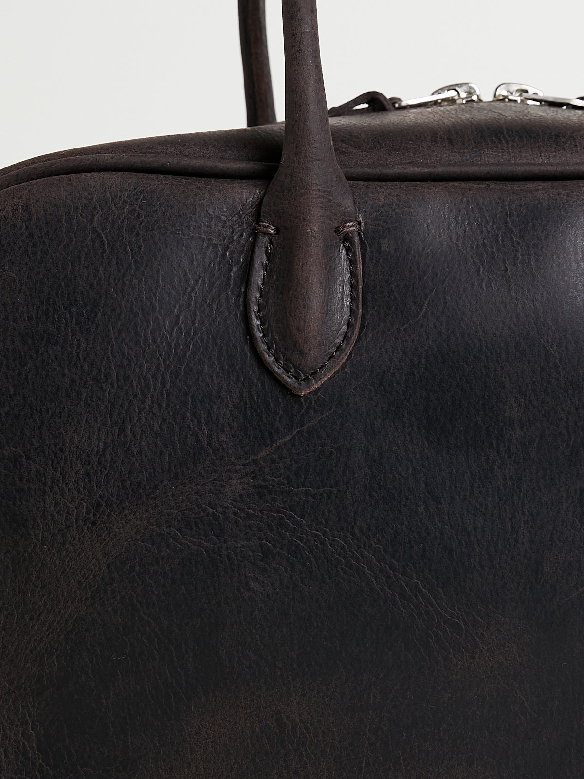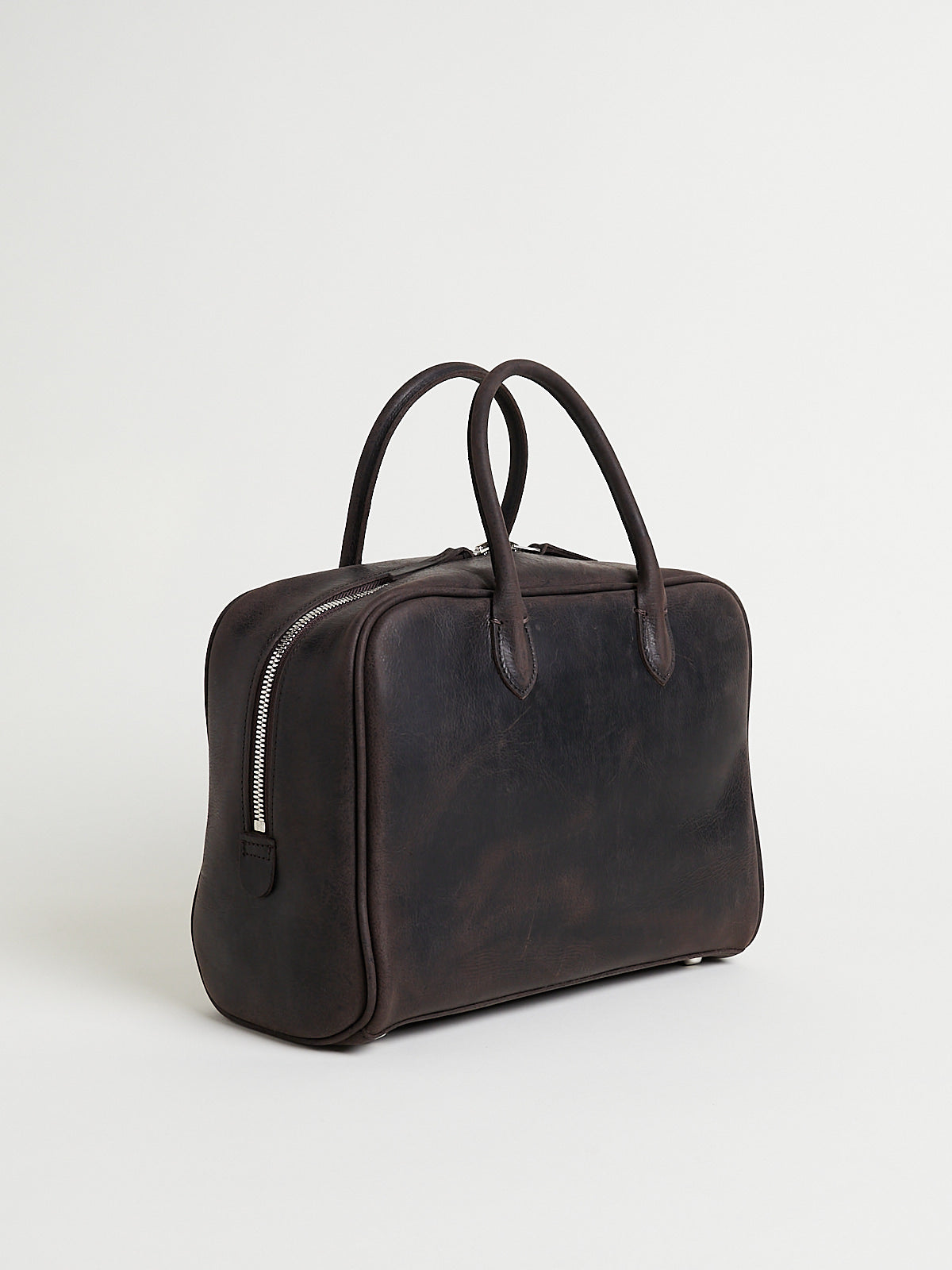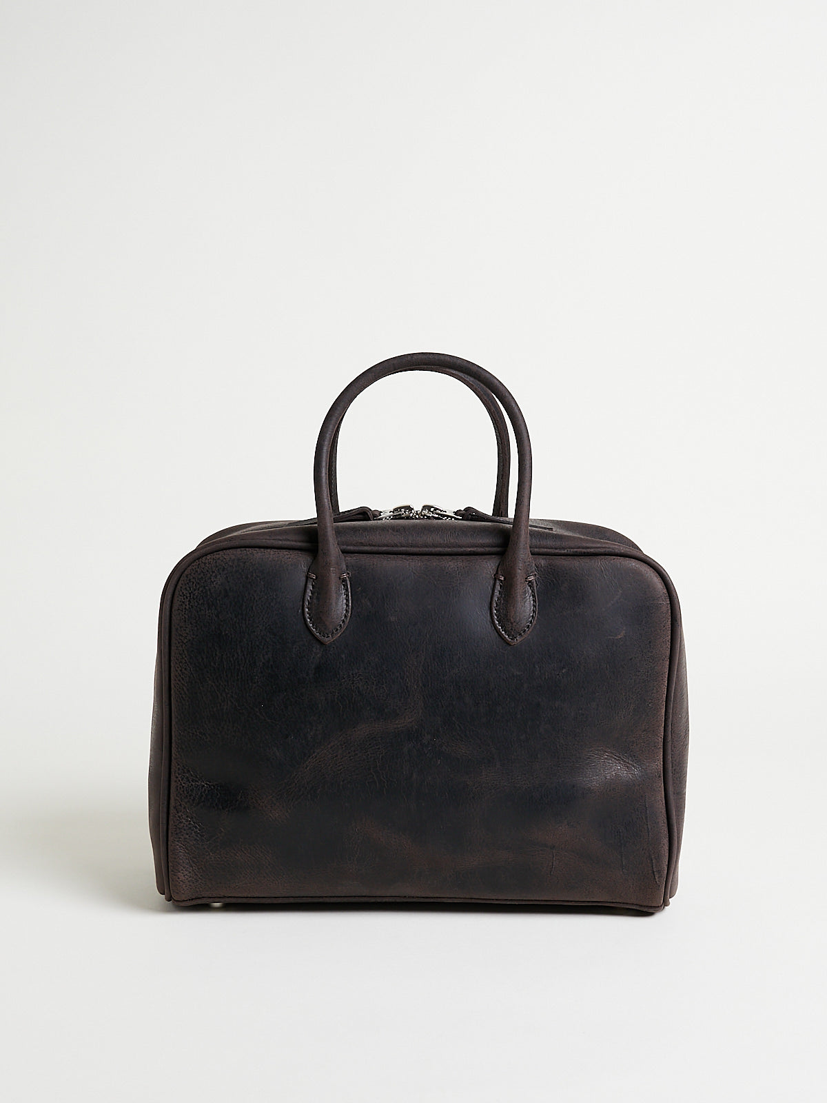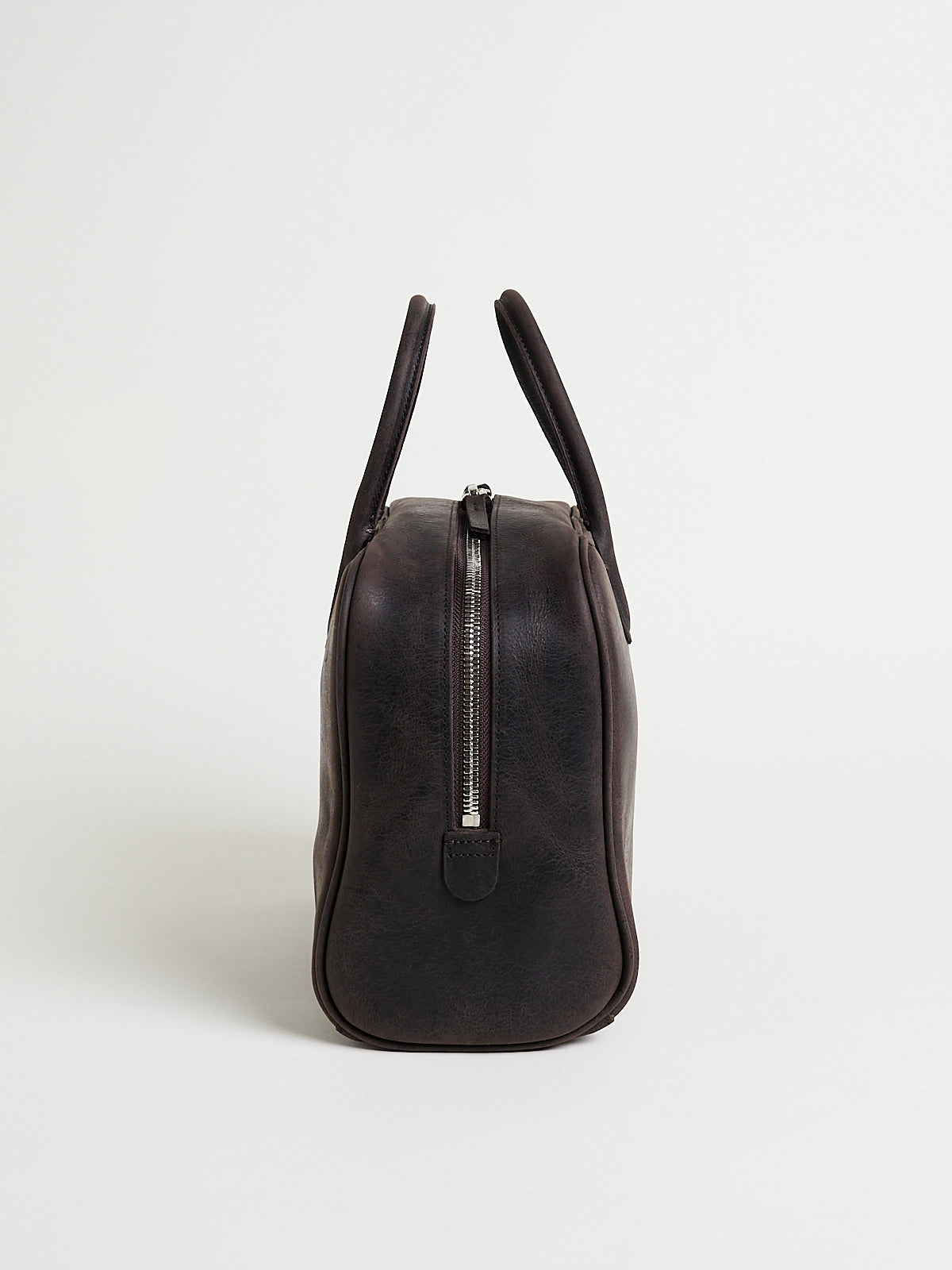 Structured bowling bag in brown antelope leather. Two short handles and a double zip fastening. One main compartment and a slip pocket with a zip fastening. Features metal studs on the bottom to elevate the bag. Lined in cow leather.