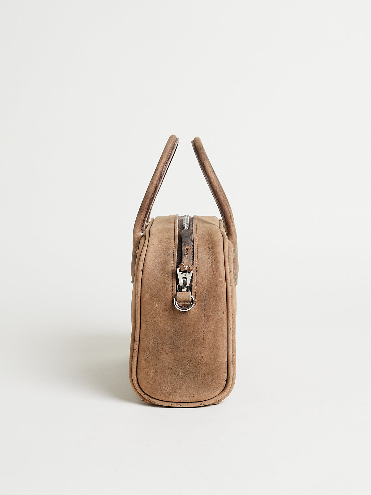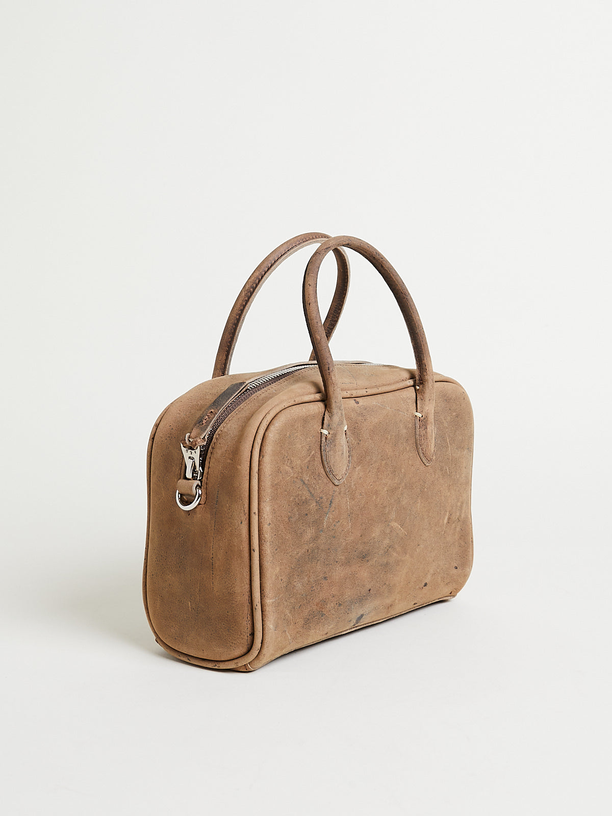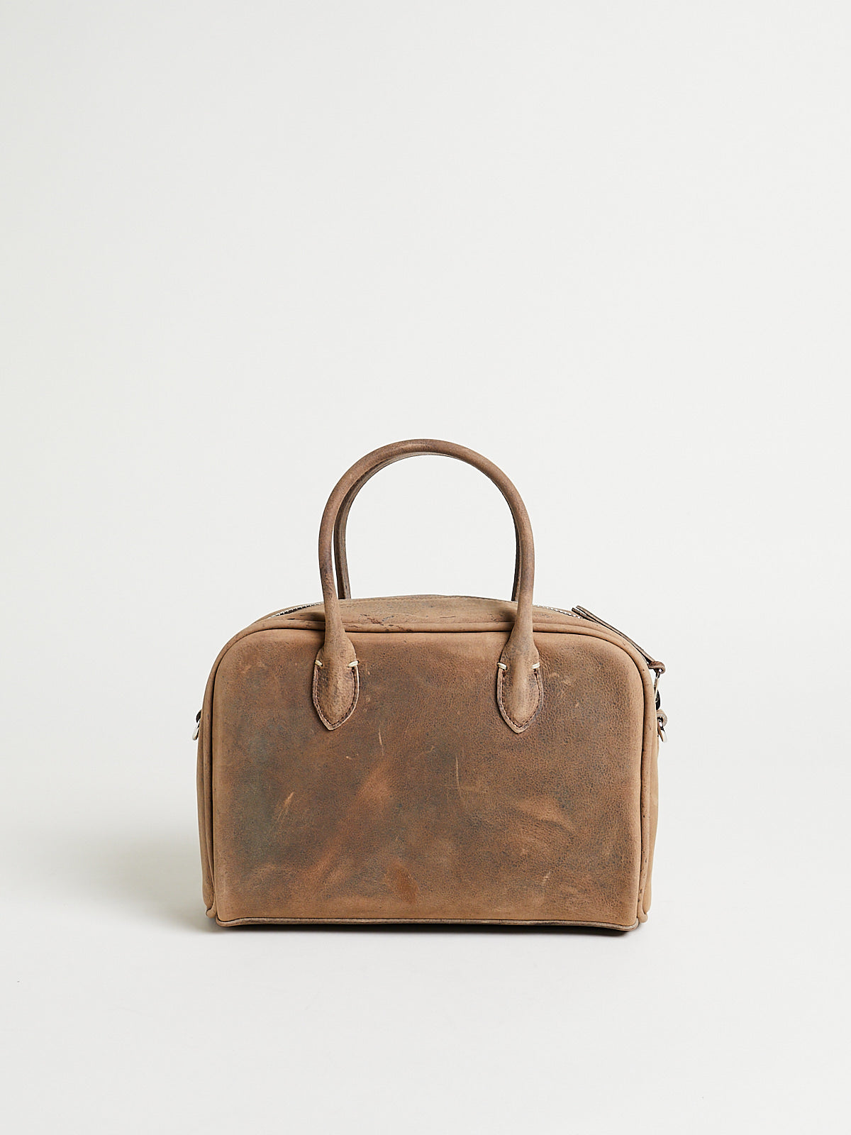 Structured small bowling bag in dark beige antelope leather. Two short handles and a double zip fastening. Features a detachable shoulder strap. One main compartment with an internal pocket with a zip fastening. Features metal studs on the bottom to elevate the bag. Lined in cow leather.