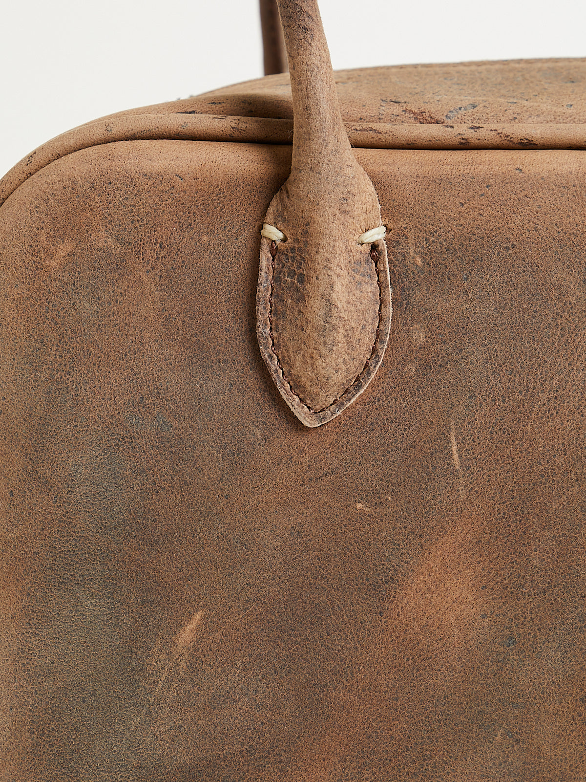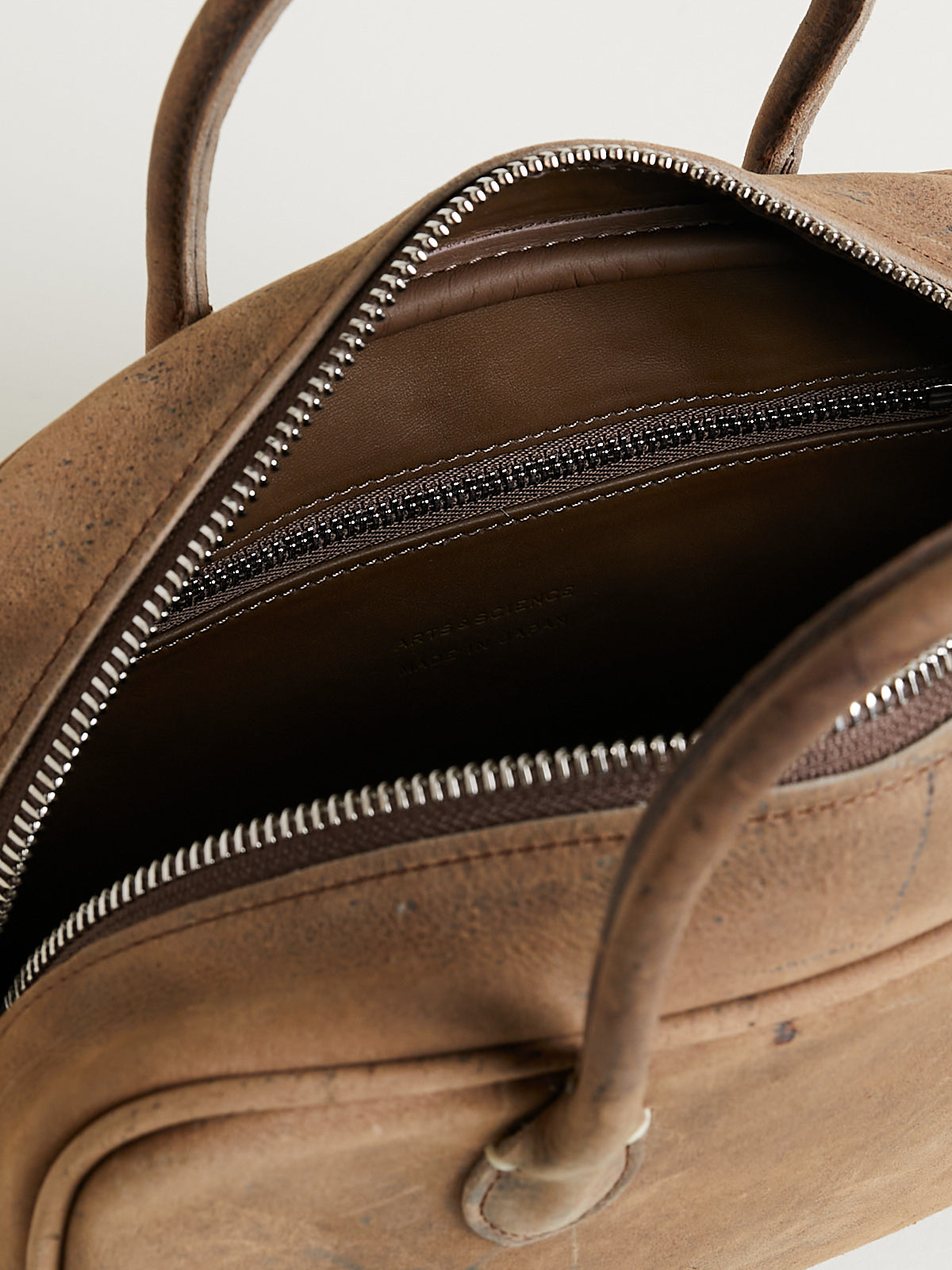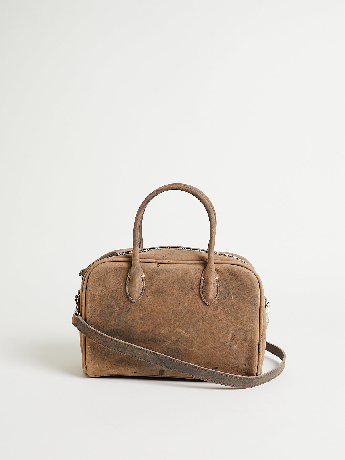 Structured small bowling bag in dark beige antelope leather. Two short handles and a double zip fastening. Features a detachable shoulder strap. One main compartment with an internal pocket with a zip fastening. Features metal studs on the bottom to elevate the bag. Lined in cow leather.
