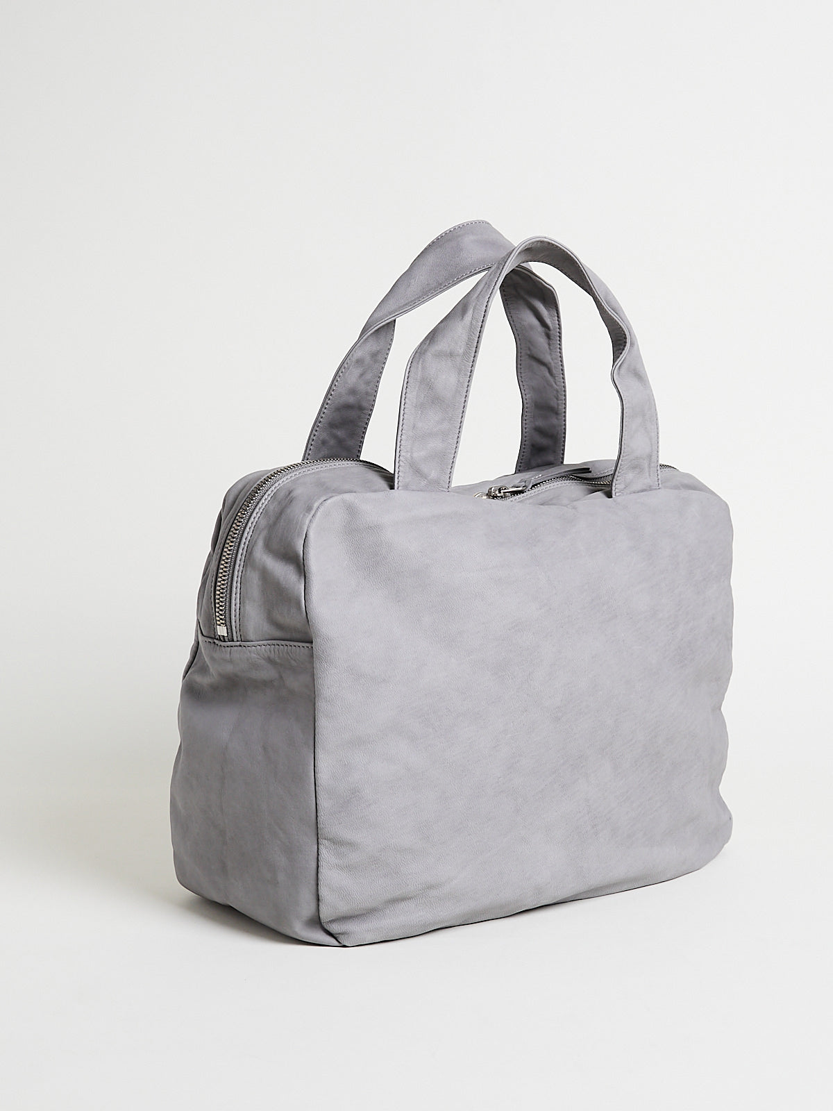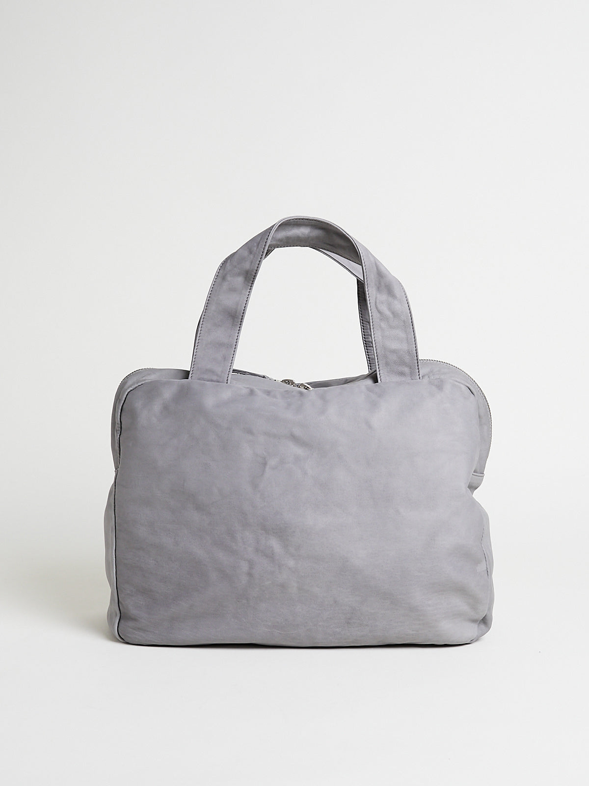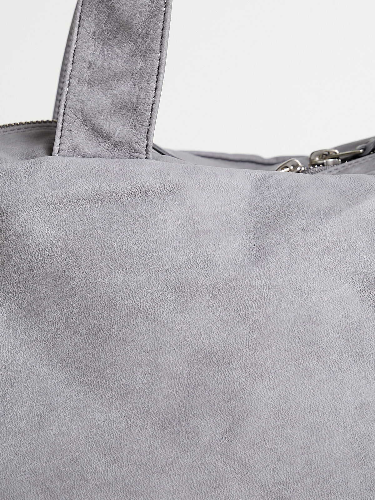 Square tote bag with two handles in a washed smooth grey horse leather. Double zip fastening and one main compartment with an internal slip pocket. Fully lined in ecru cotton/linen.